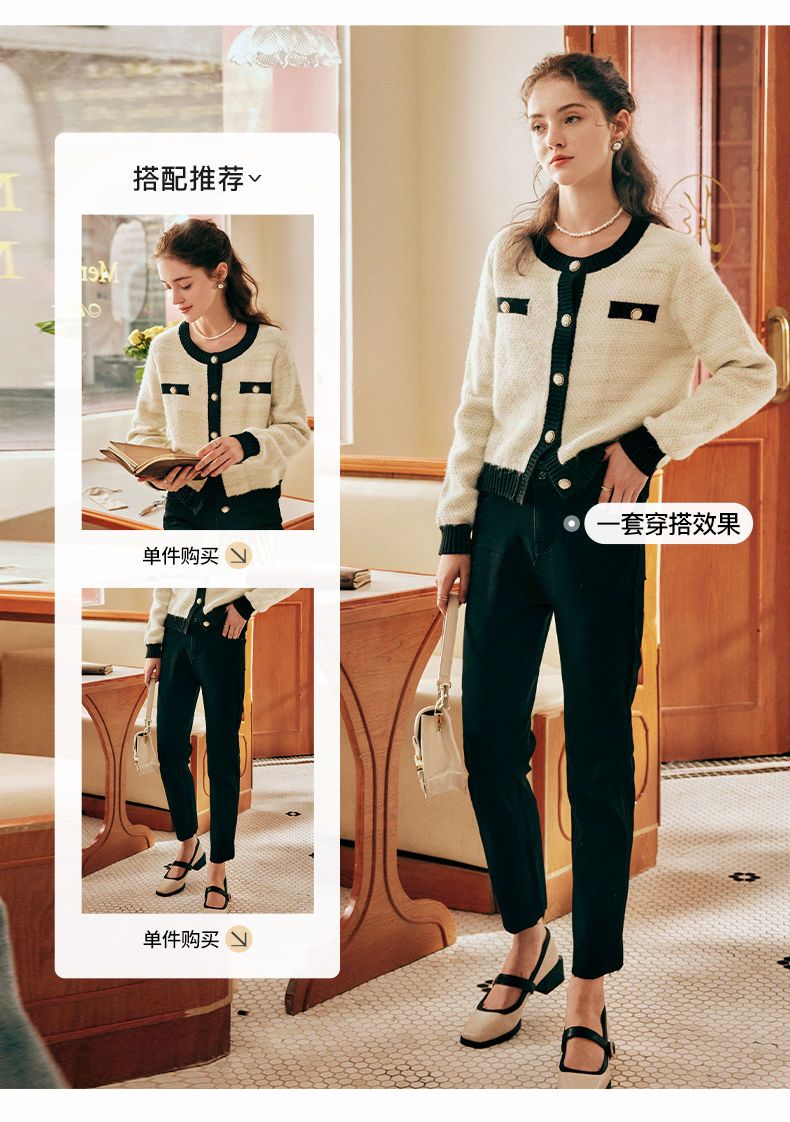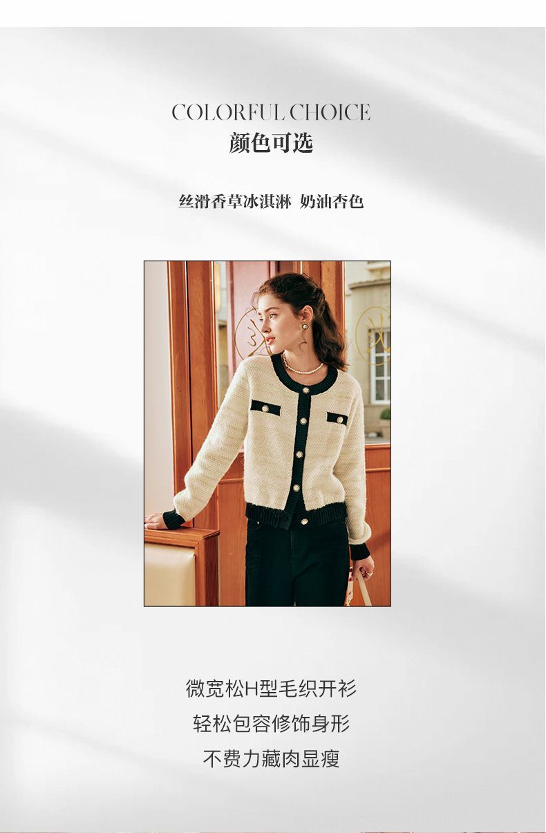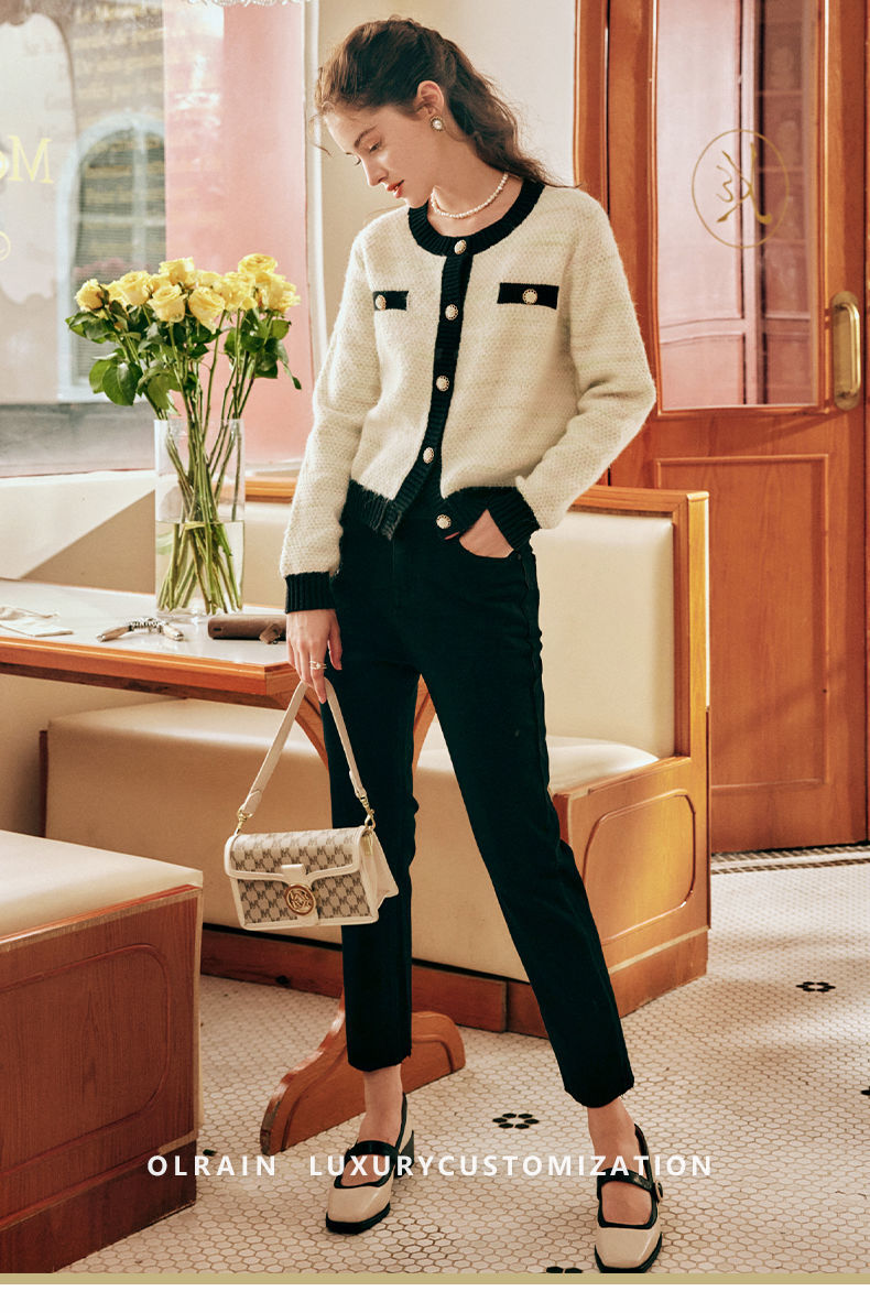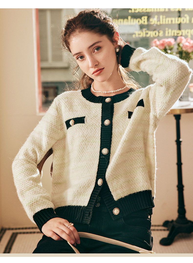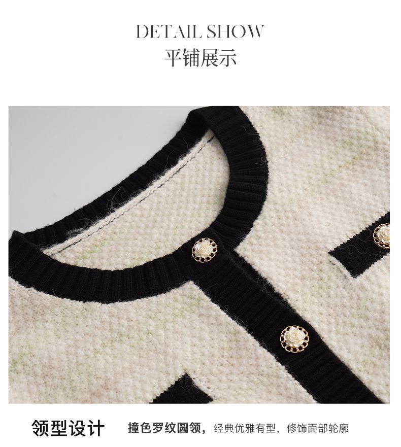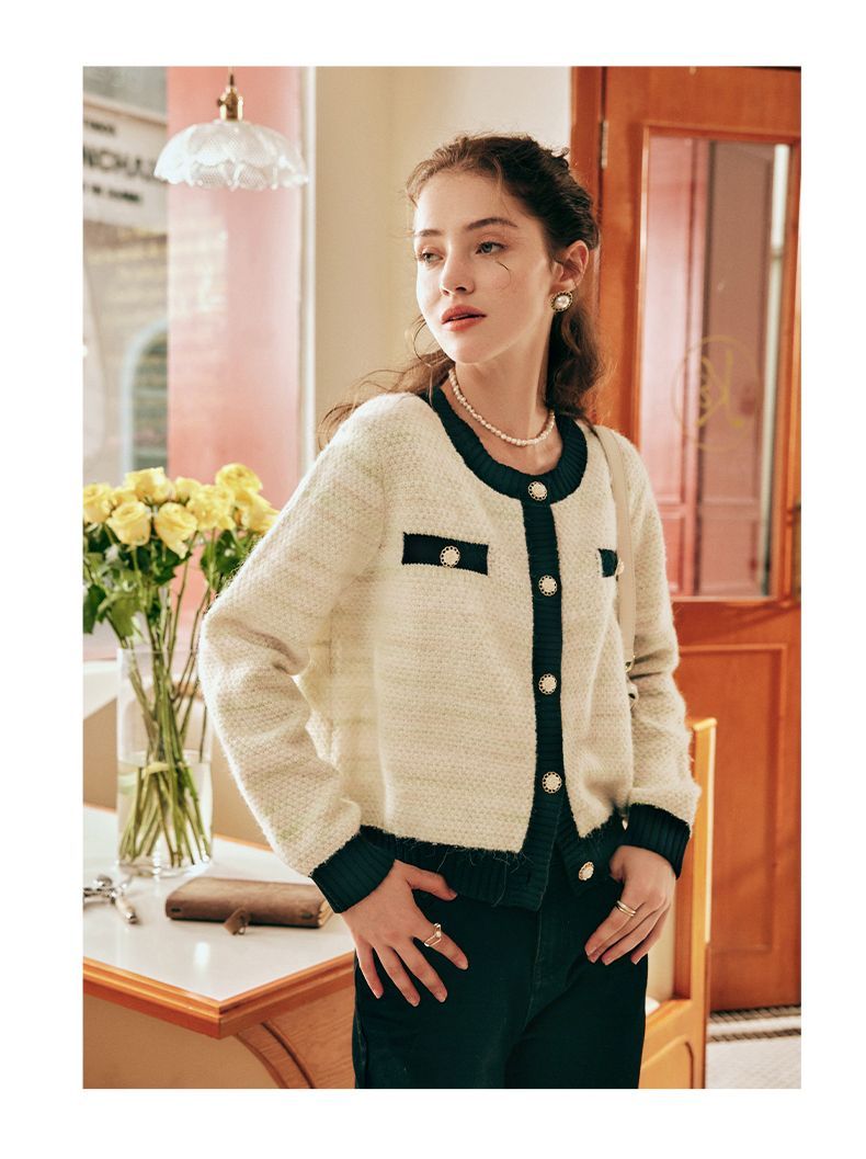 OLrain欧芮儿法式小香风毛衣外套女秋冬2022新款撞色圆领针织开衫