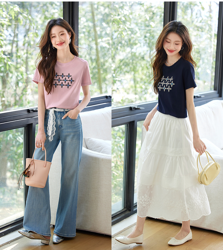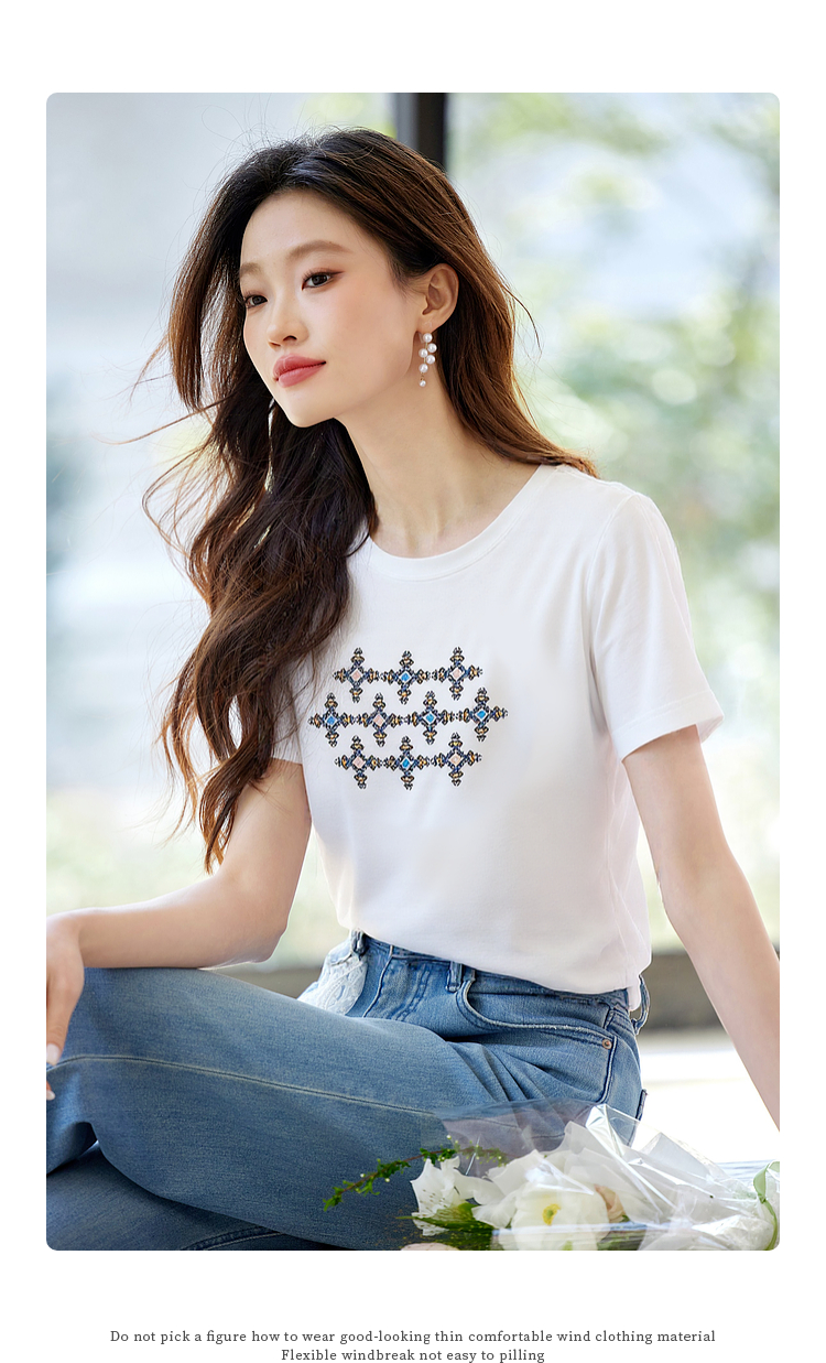 【专属特价】熙世界轻民族国风纹样绣花T恤短袖女设计感圆领上衣2025夏日新款