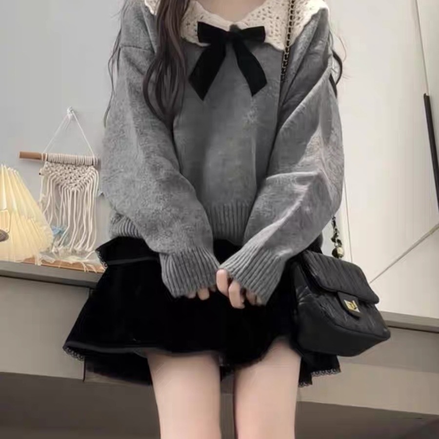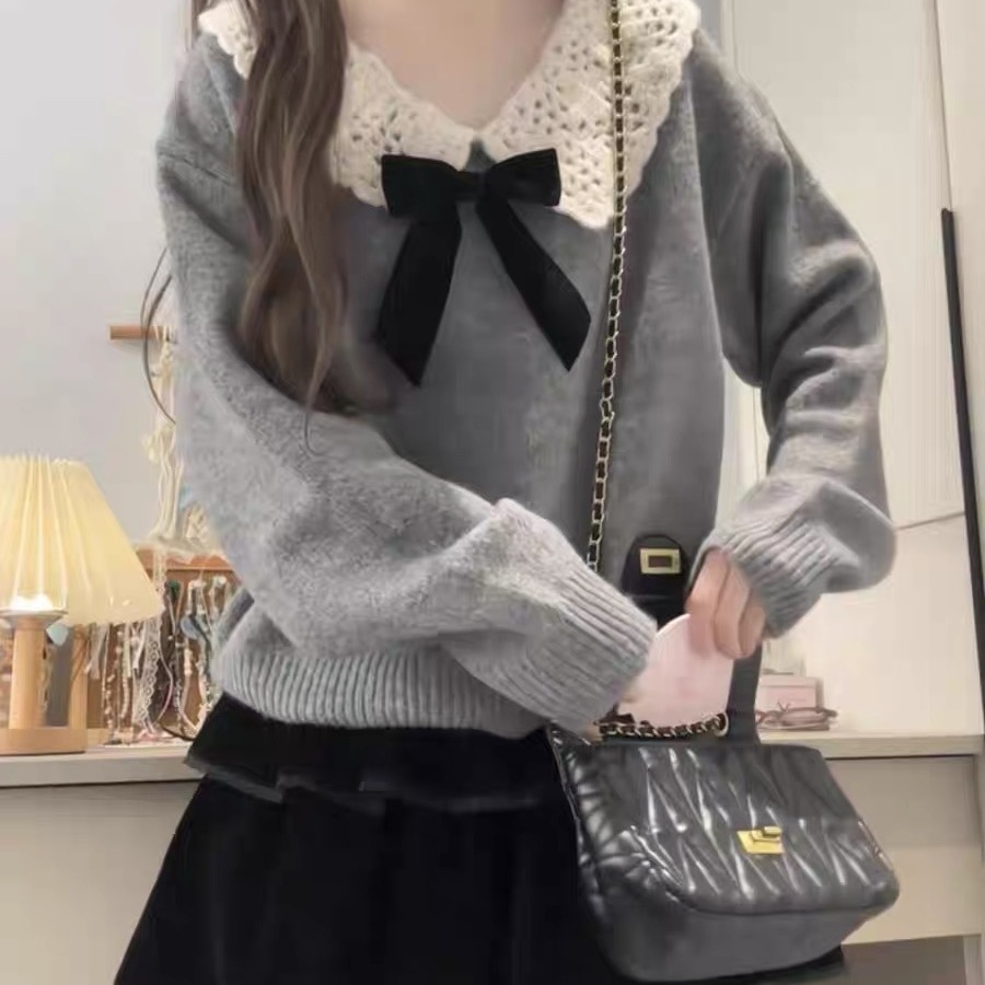 百蓝茵甜美设计感穿搭娃娃领毛衣女秋冬小个子温柔减龄慵懒风针织衫上衣★