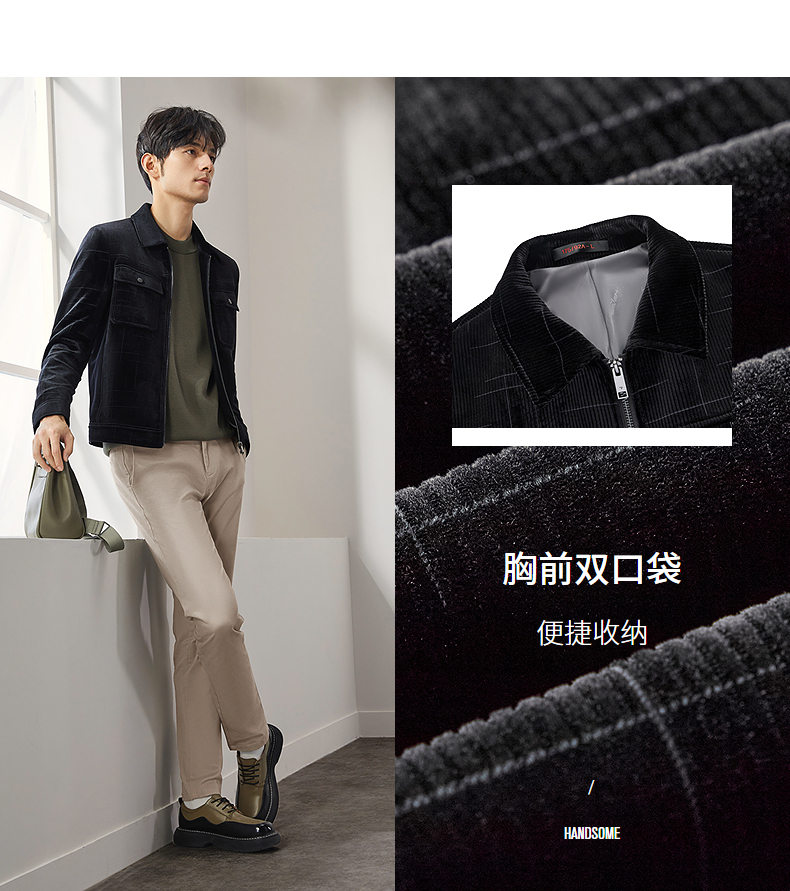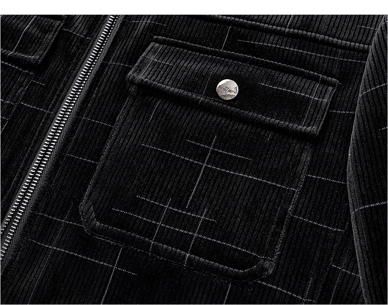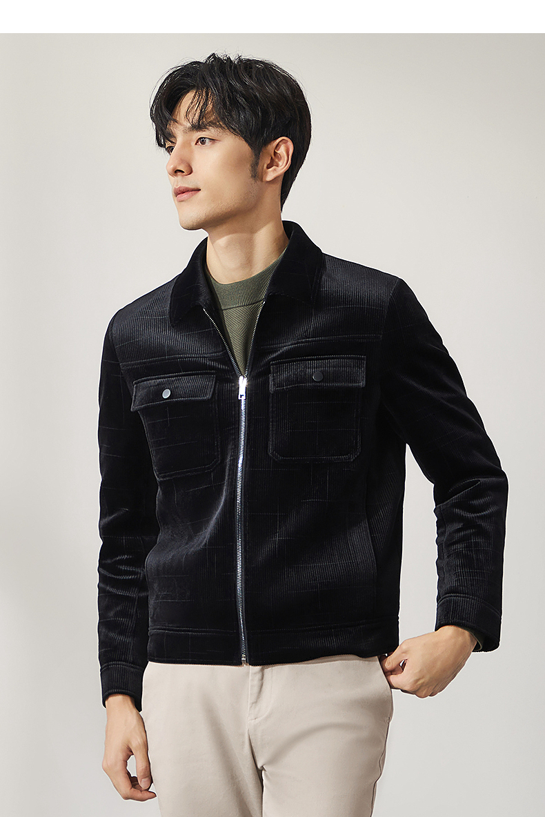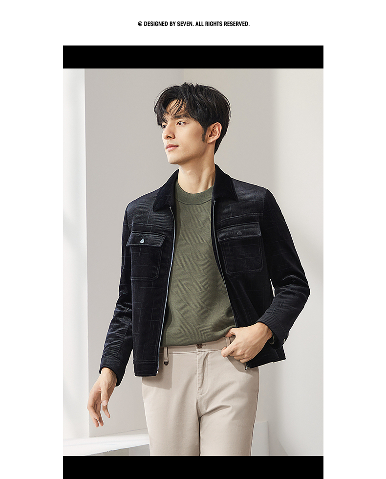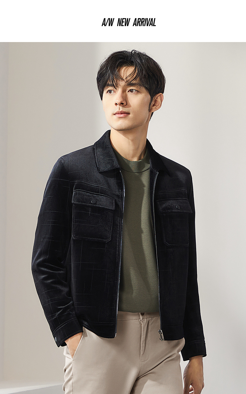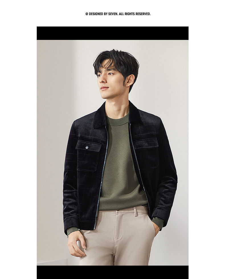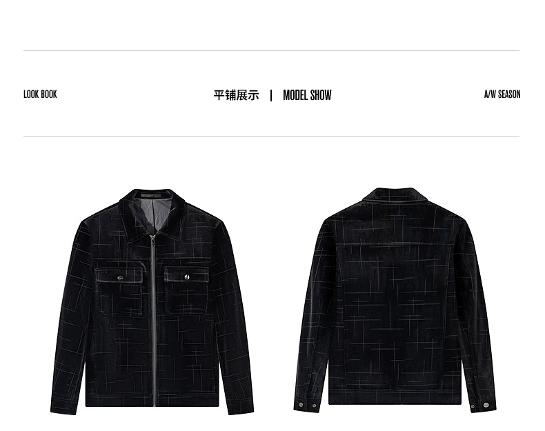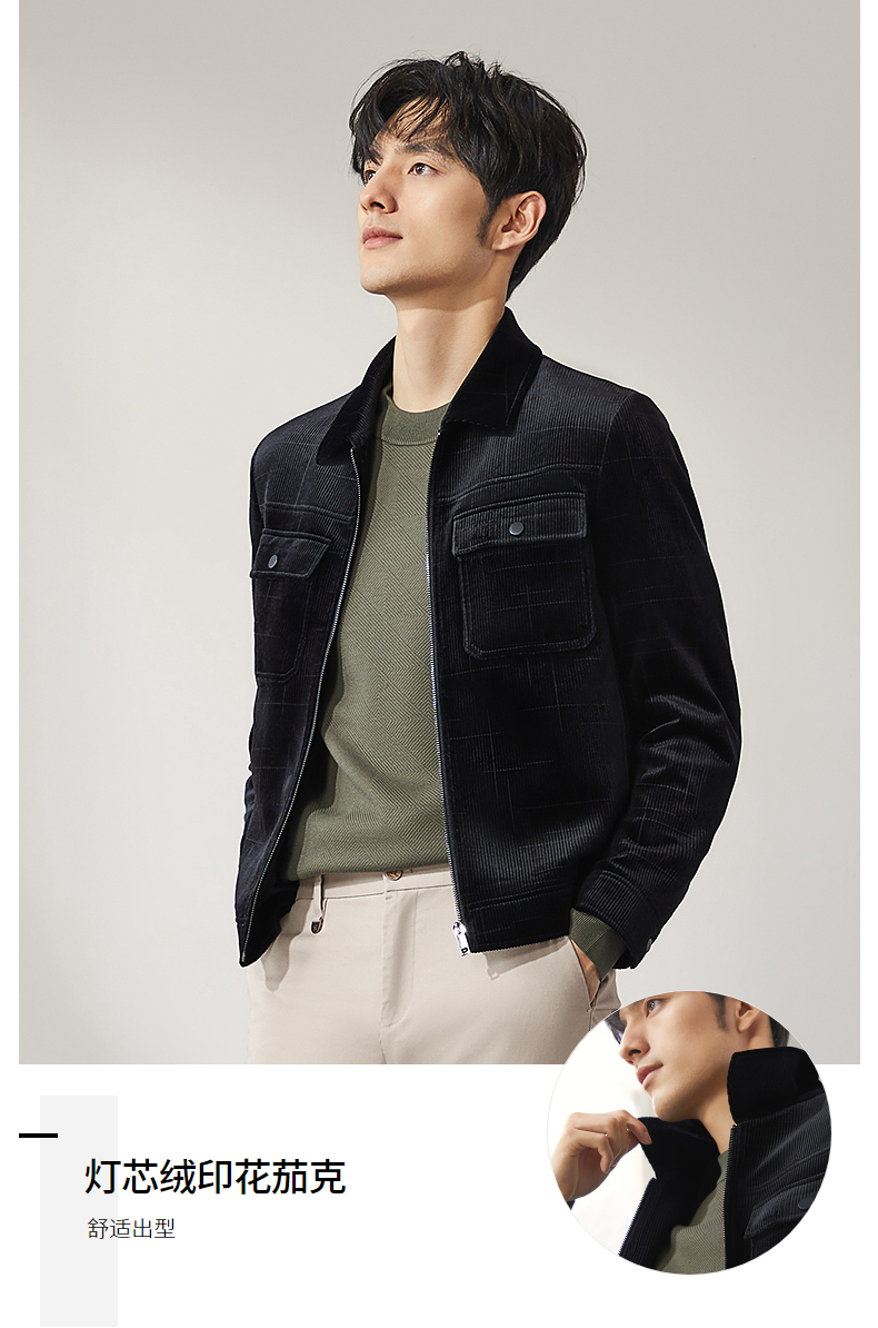 柒牌灯芯绒翻领夹克2024秋冬新款时尚潮流几何印花黑色茄克衫外套127K71060