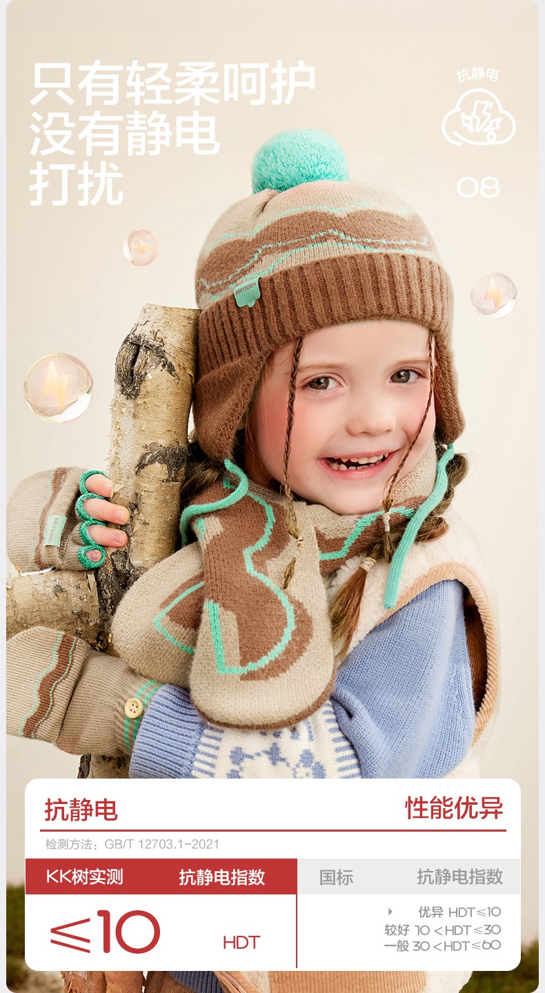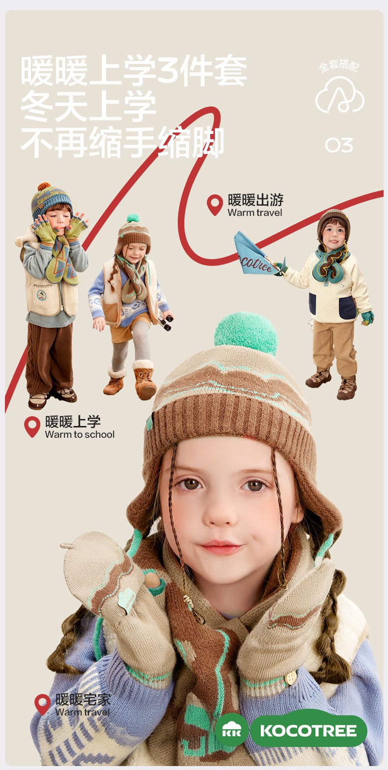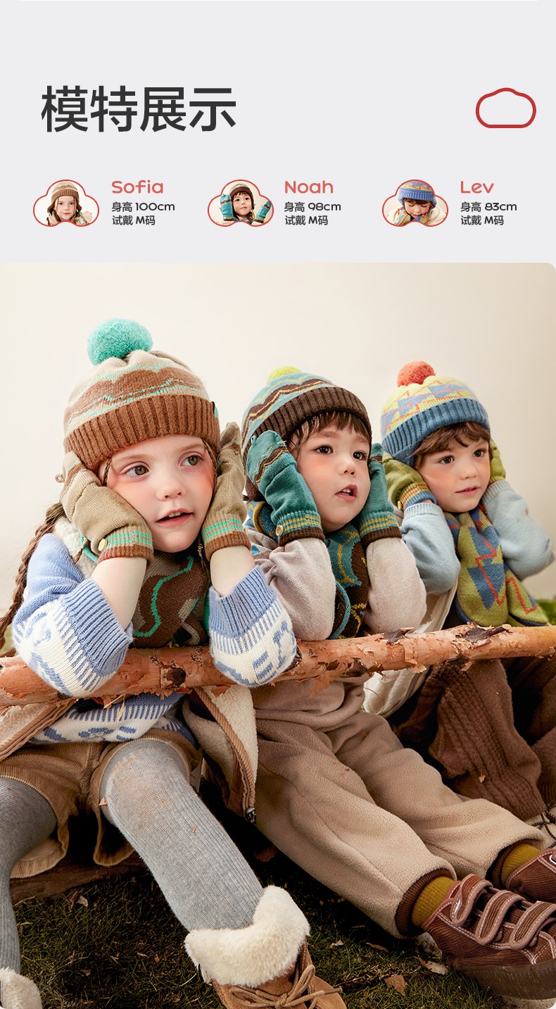 KK树儿童帽子围巾手套三件套男孩女童秋冬季护耳针织帽2025新款造梦几何家针织套装