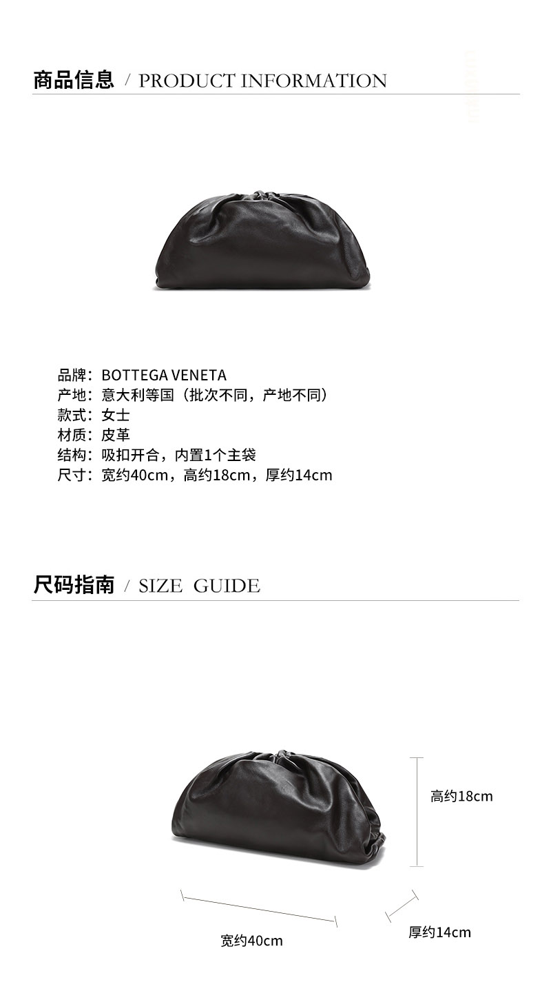 ![]() | 品牌:Bottega Veneta/葆蝶家 产地:意大利等国(批次不同,产地不同) 款式:女士 颜色:黑色 材质:皮革 结构:吸扣开合,内置1个主袋 尺寸:宽约40cm,高约18cm,厚约14cm