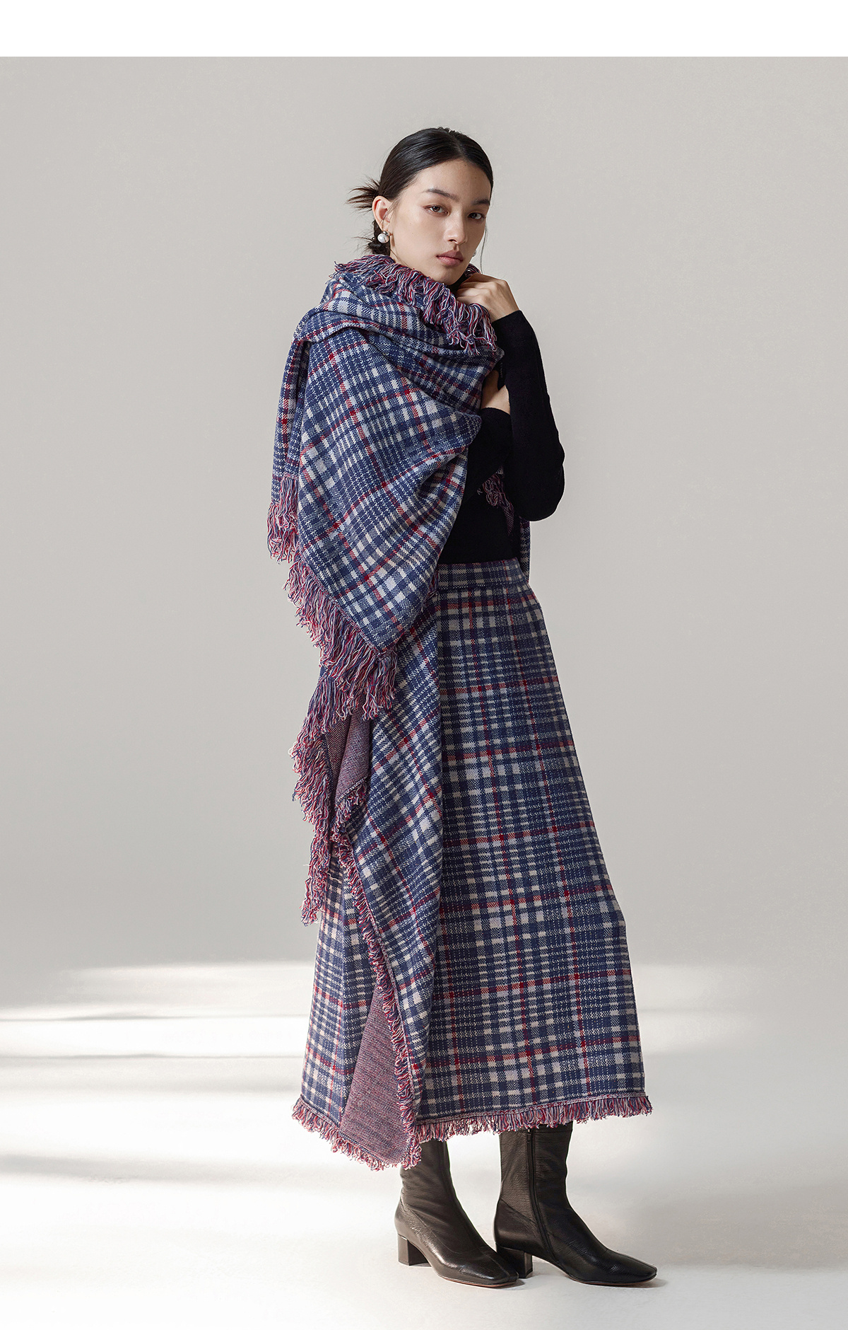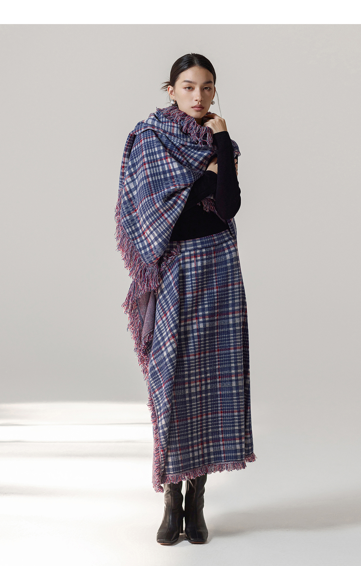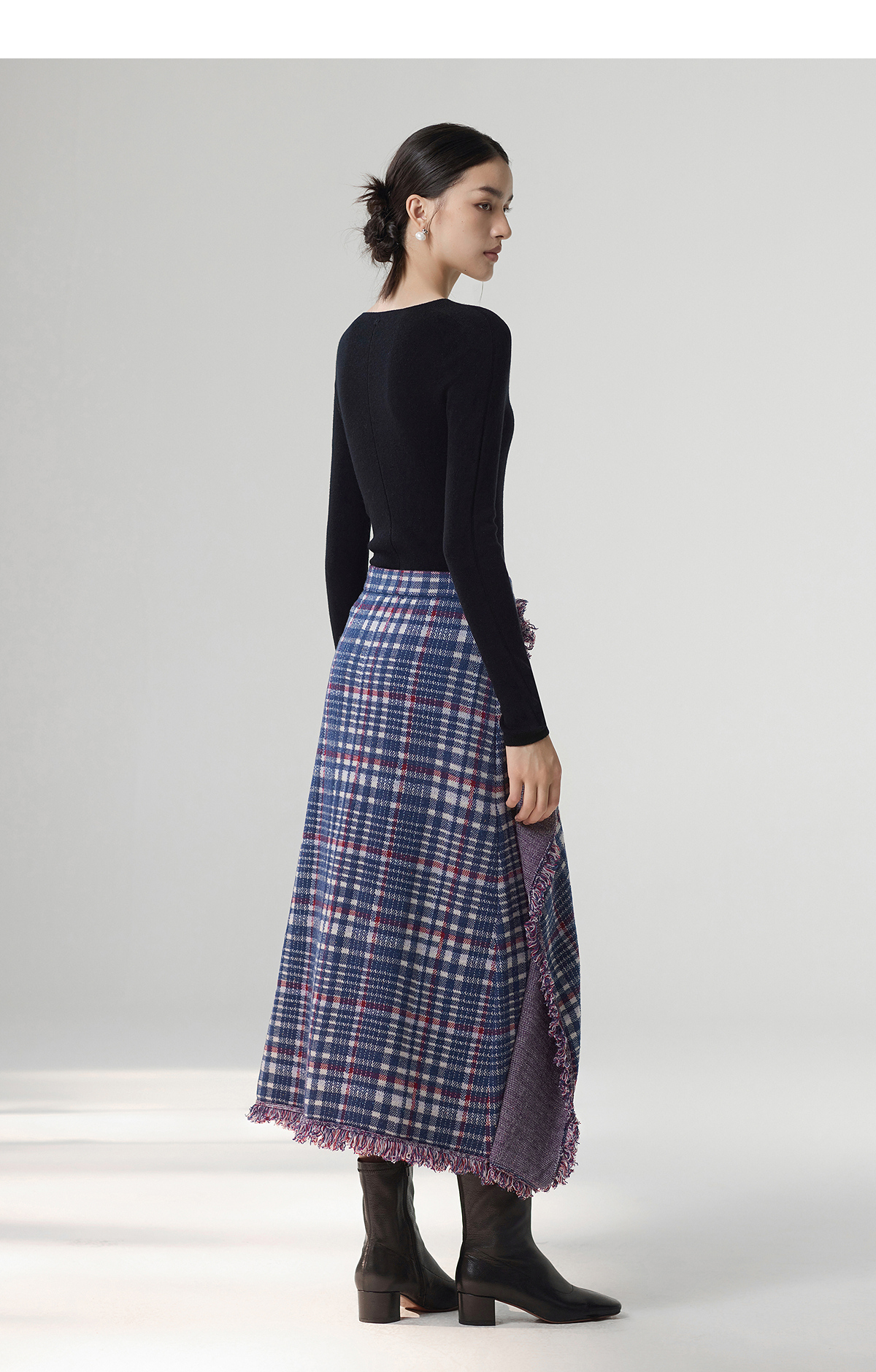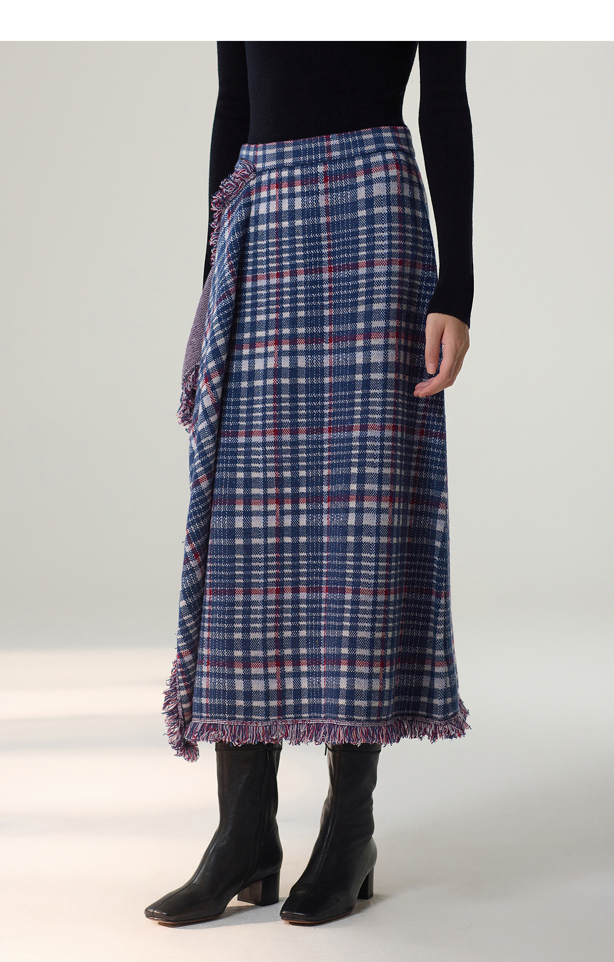 【林栖设计小店】格纹毛织半身裙复古百搭气质宽松2025秋冬新款流苏裙子女1954005