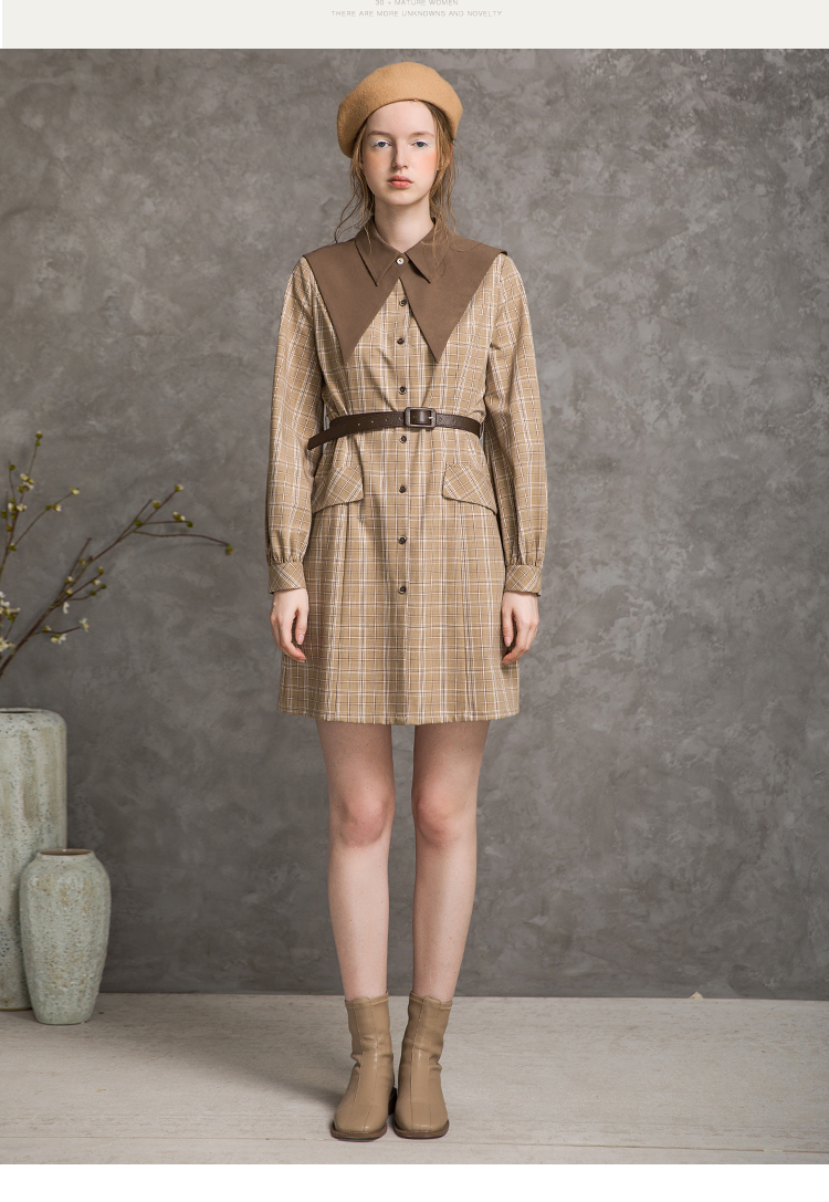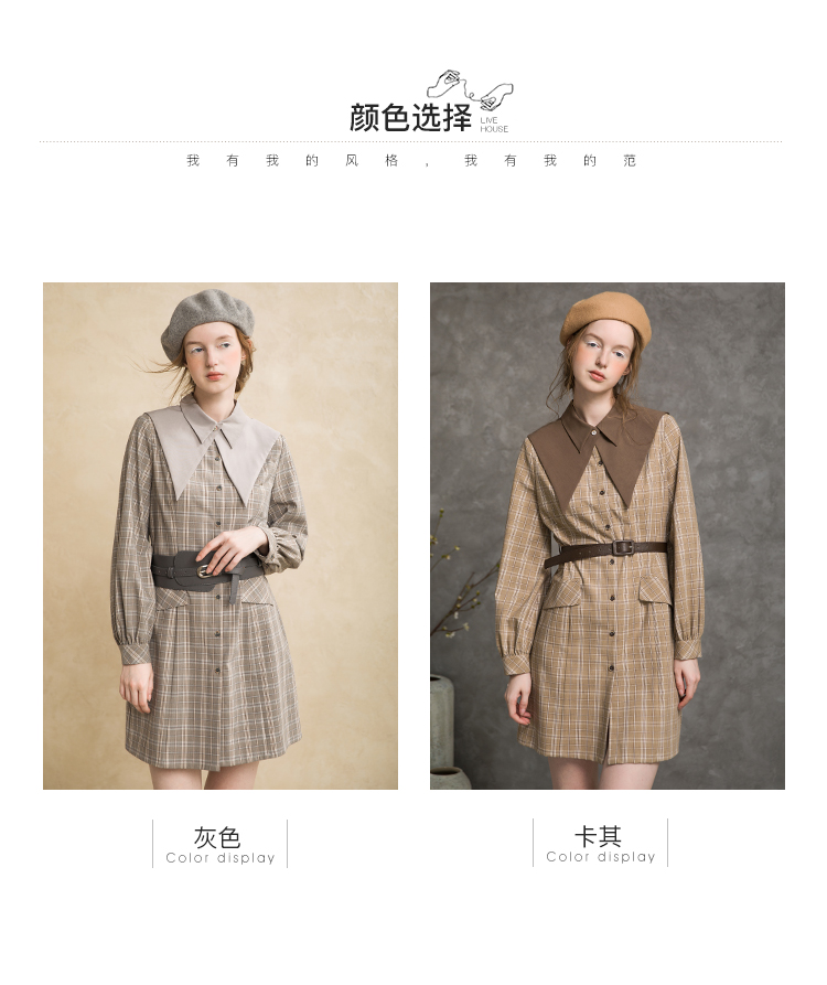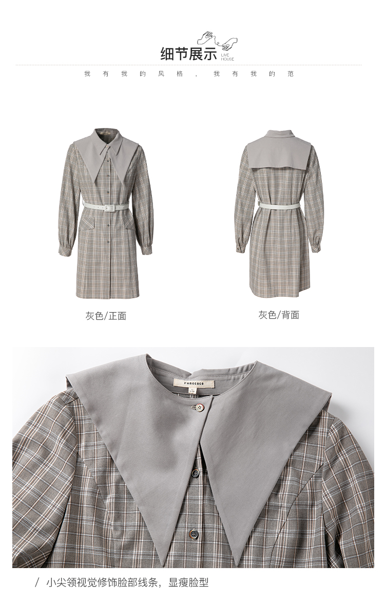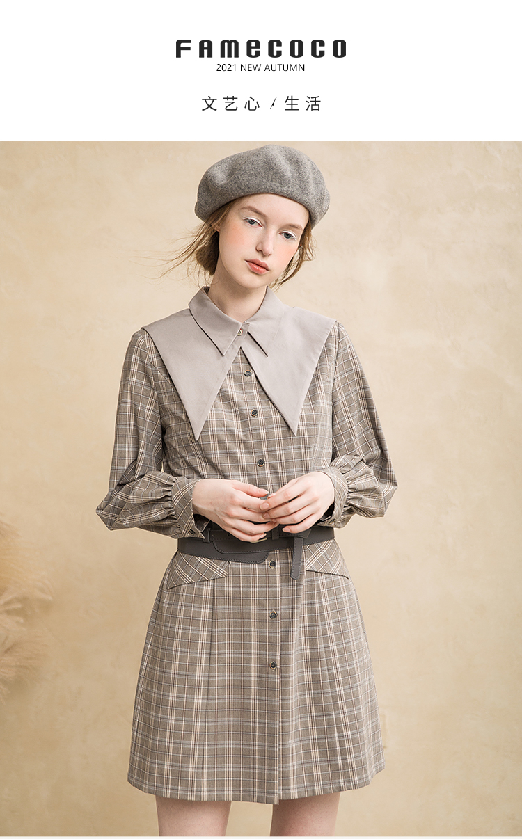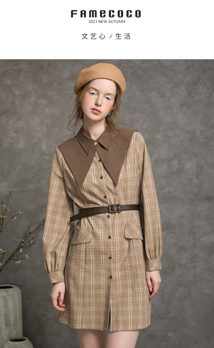 famecoco范可儿格子连衣裙女秋装长袖衬衫裙中长款F216FA019