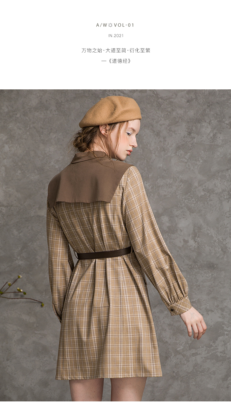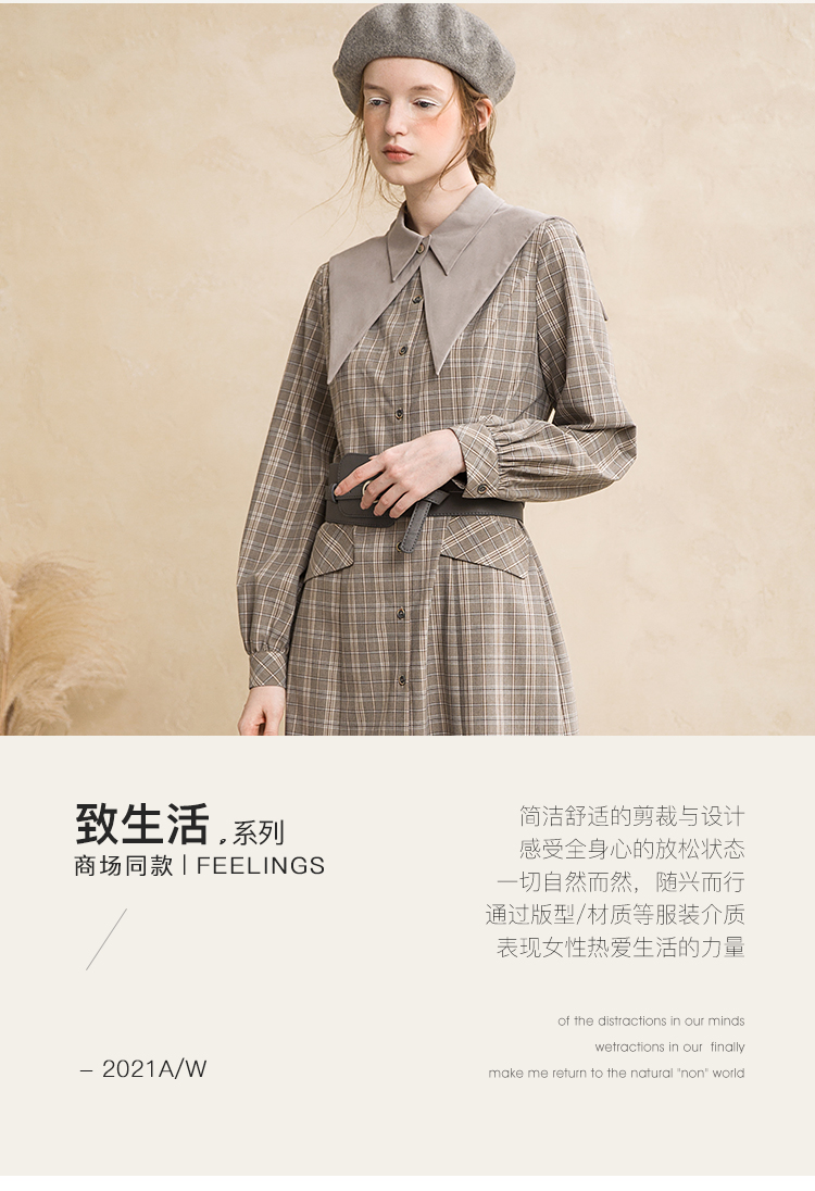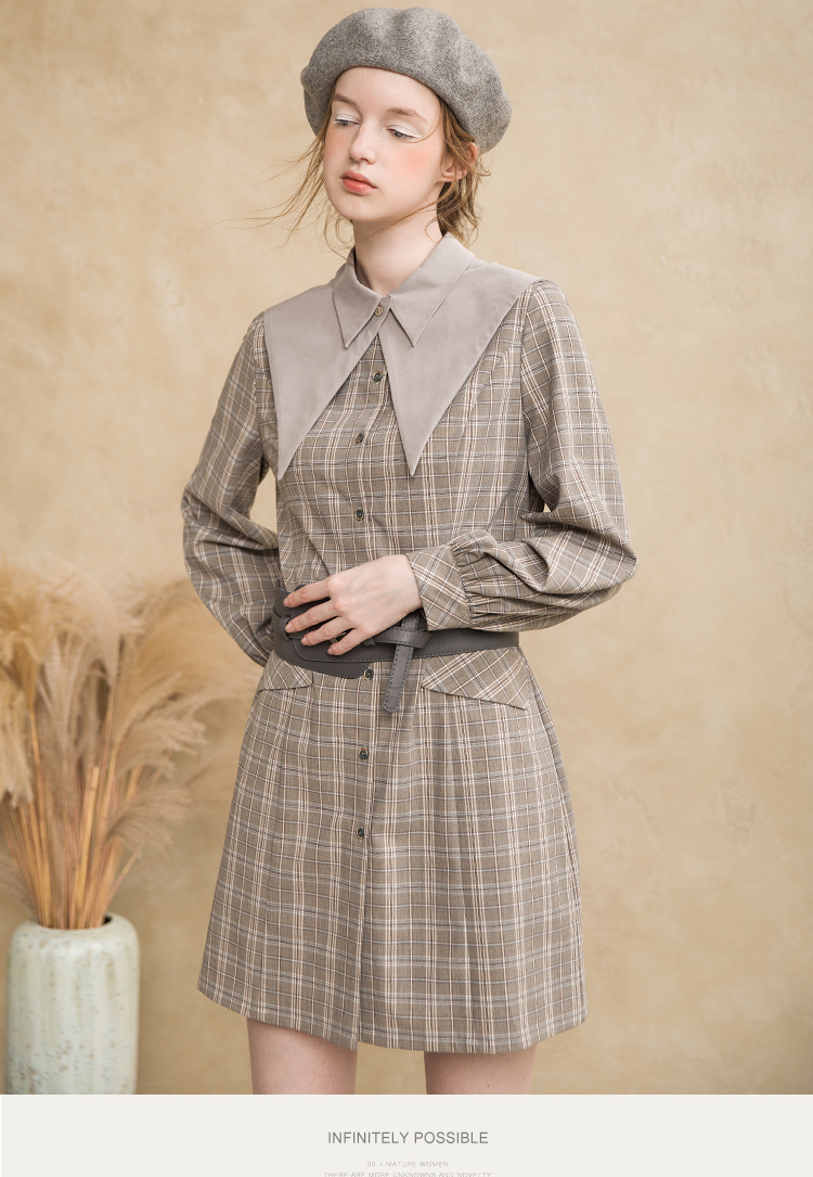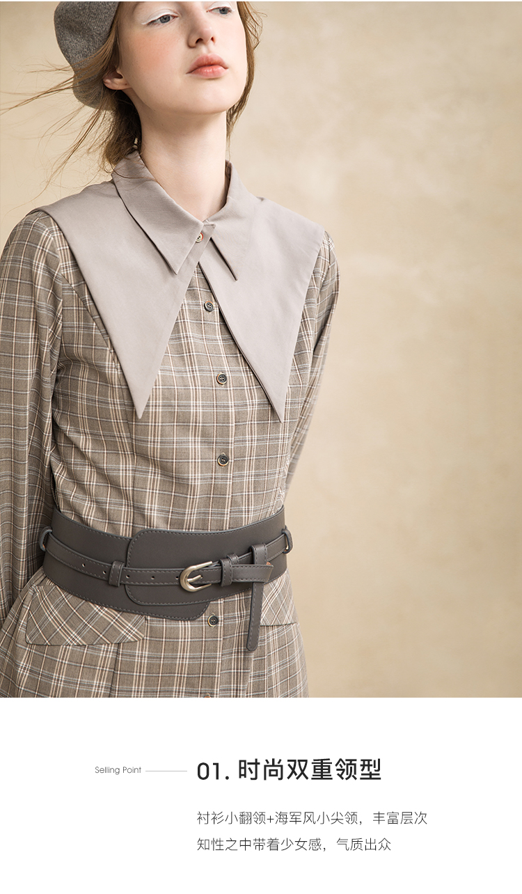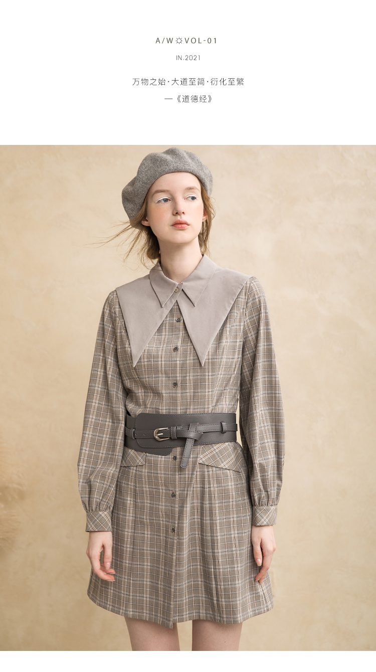 famecoco范可儿格子连衣裙女秋装长袖衬衫裙中长款F216FA019