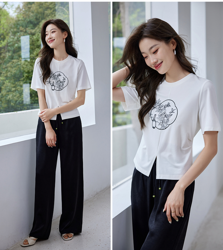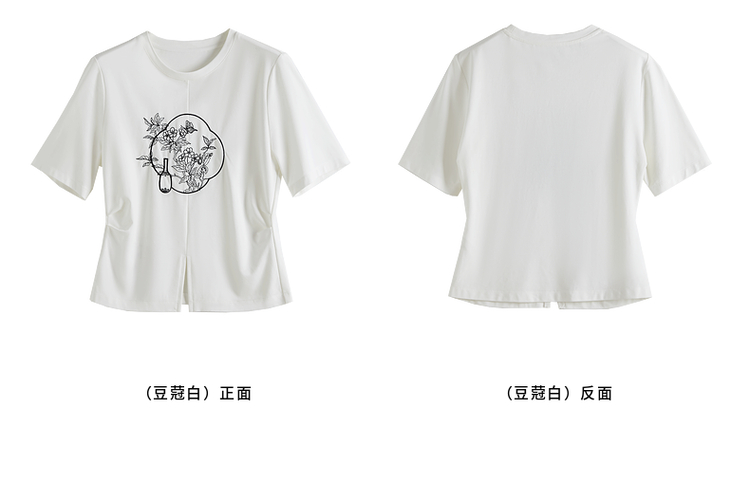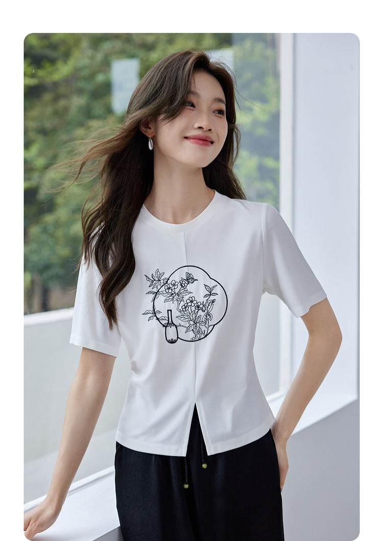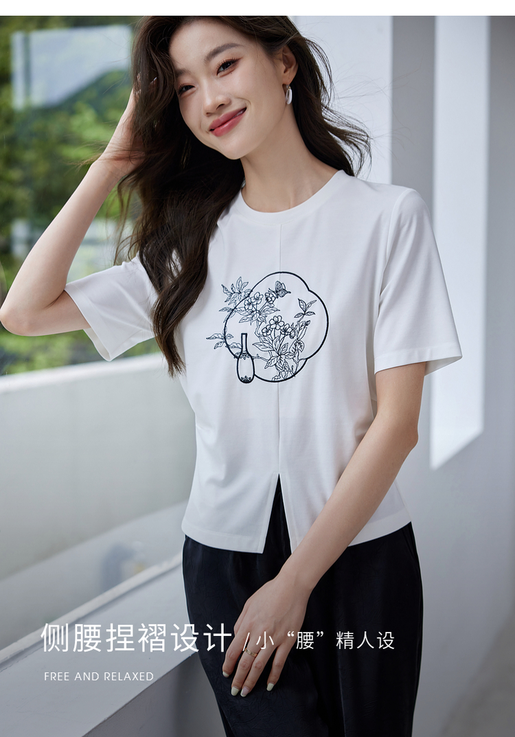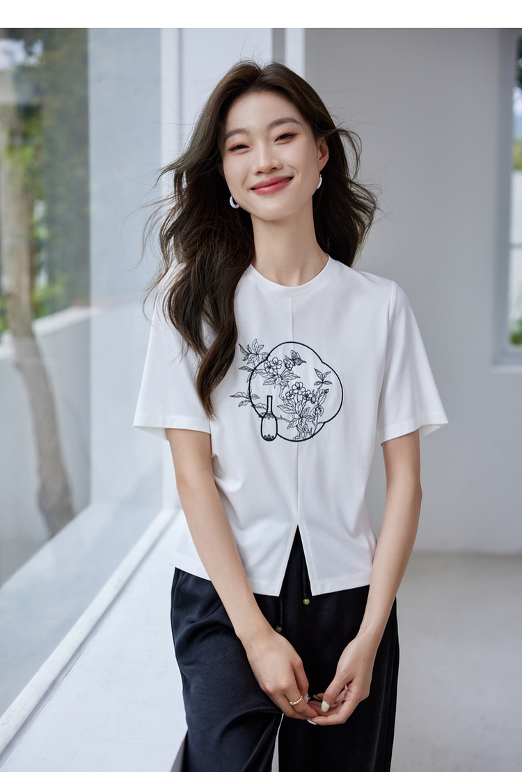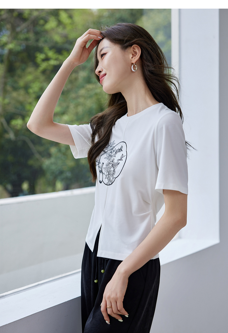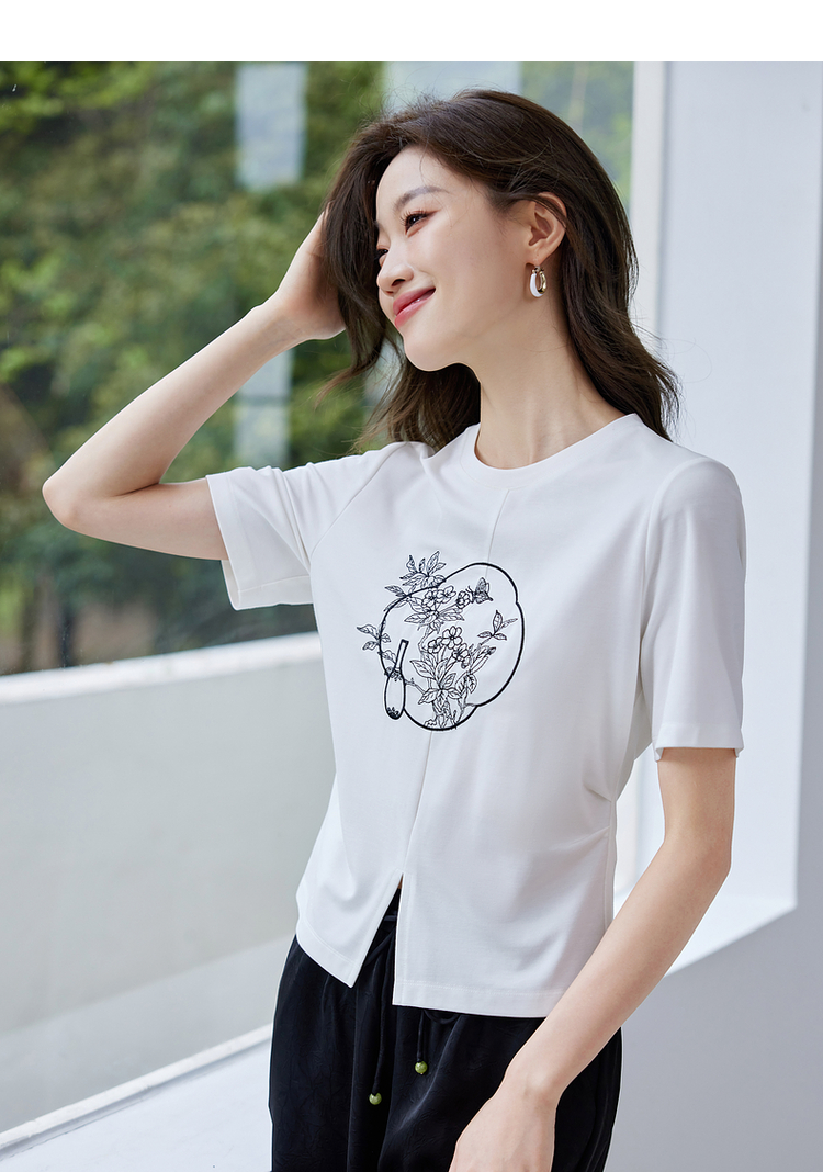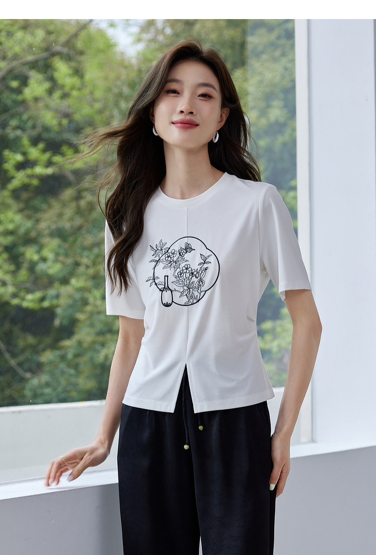 【专属特价】熙世界新中式国风刺绣t恤女短袖2025夏新款正肩前开叉休闲上衣