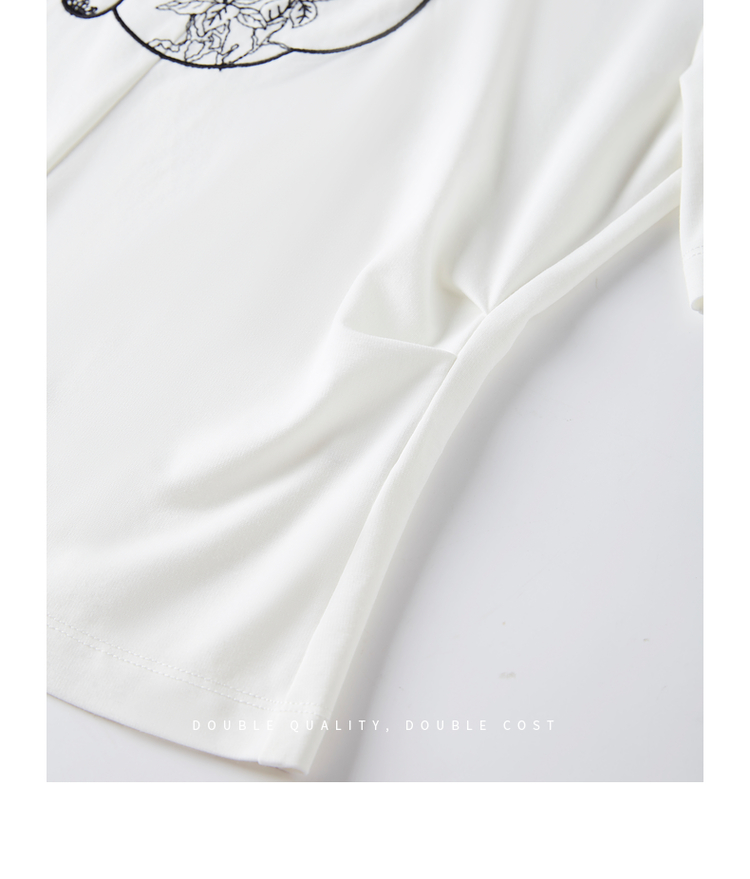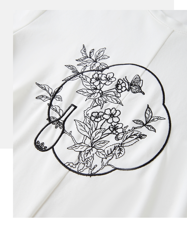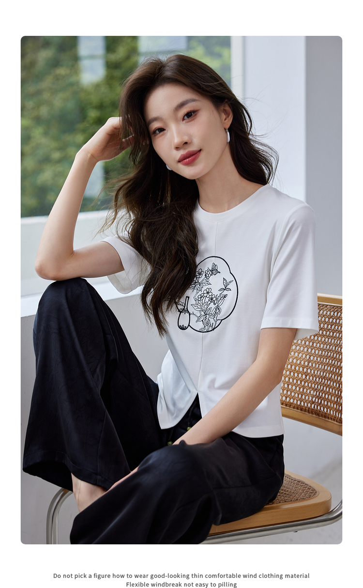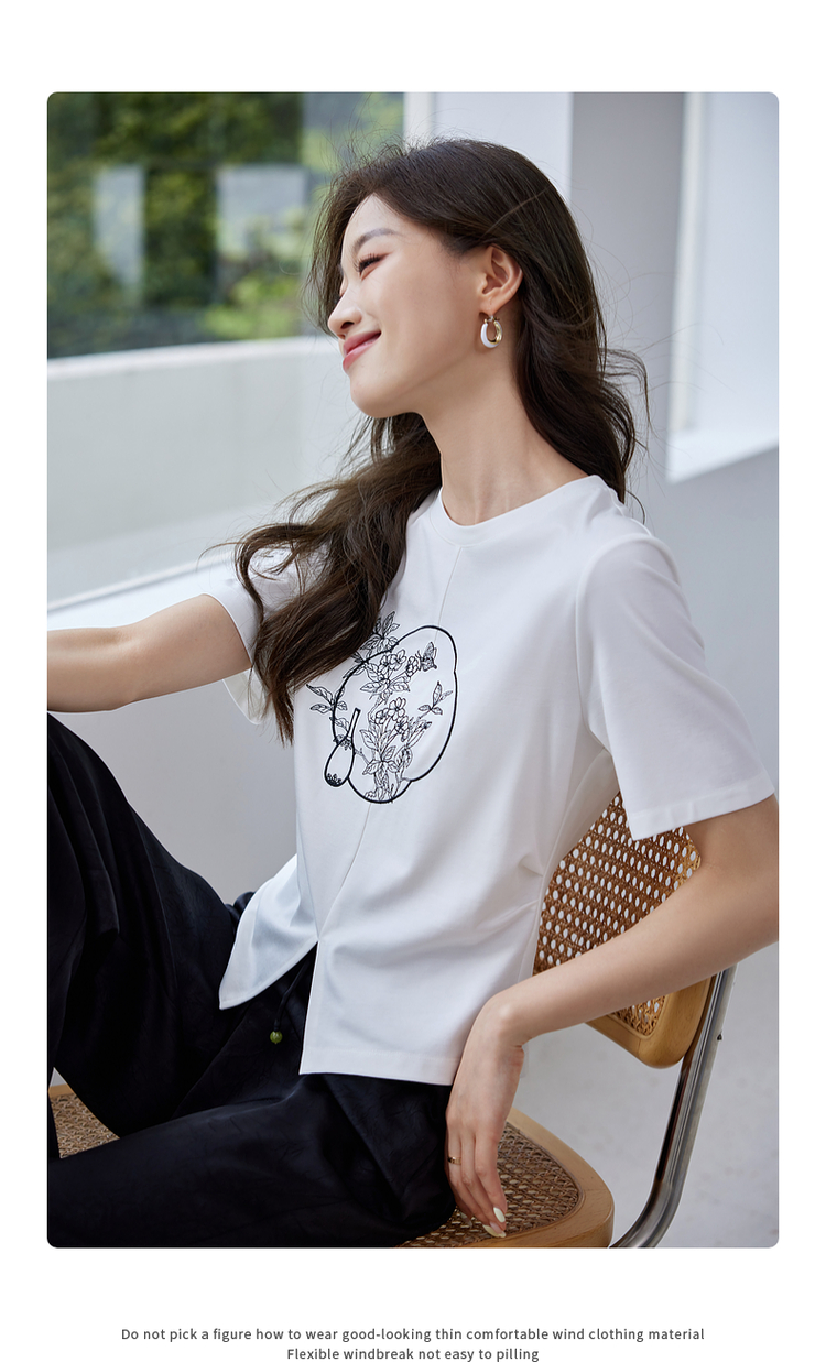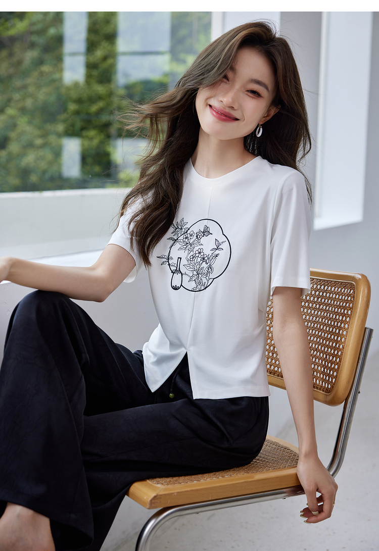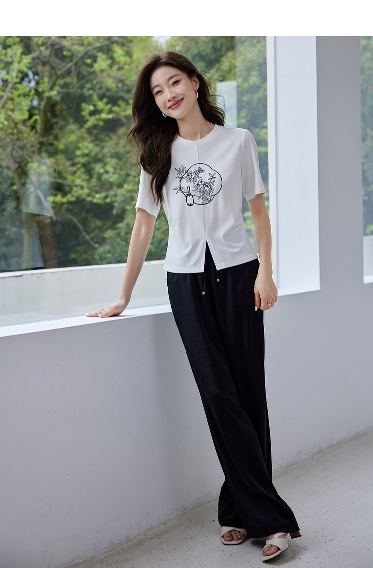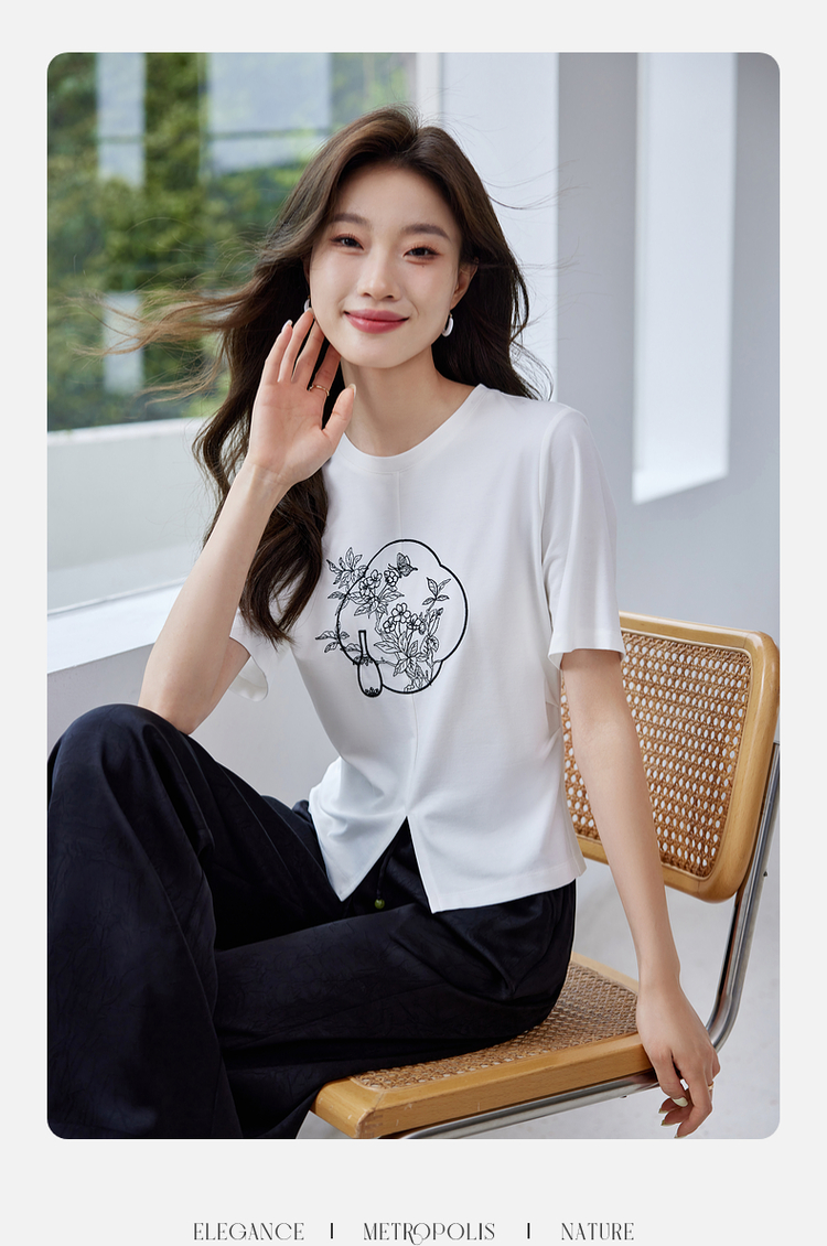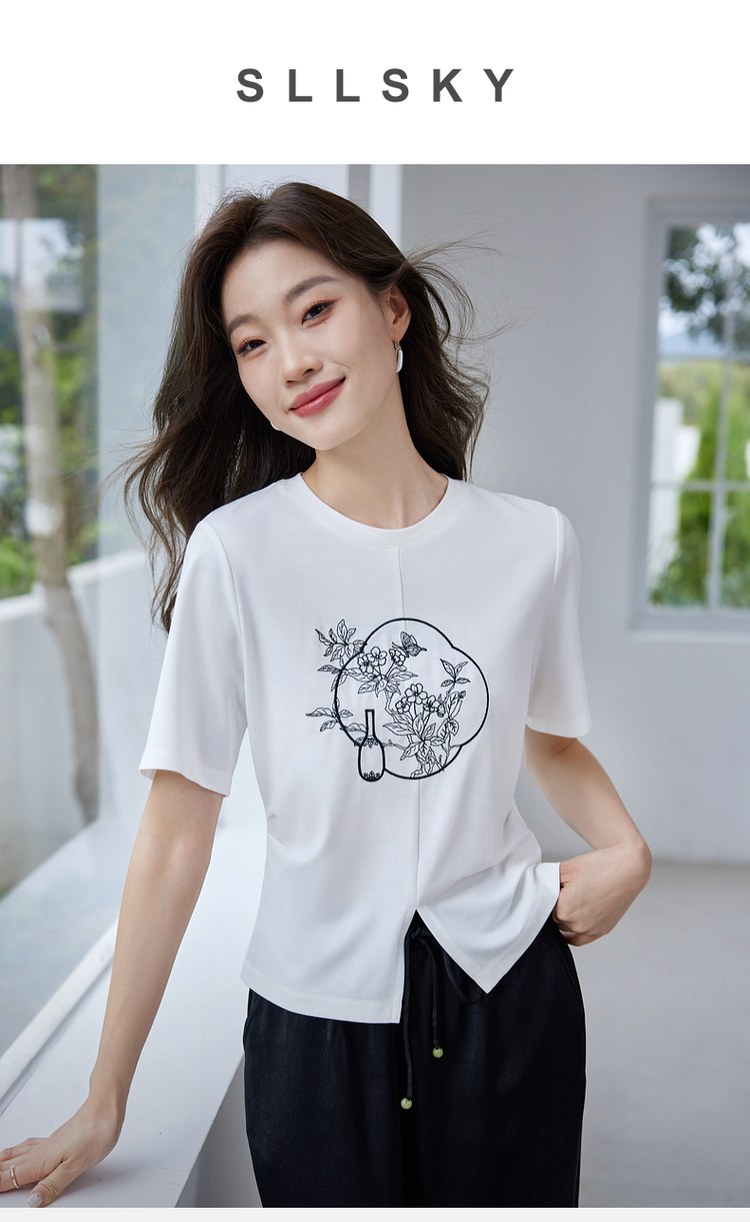 【专属特价】熙世界新中式国风刺绣t恤女短袖2025夏新款正肩前开叉休闲上衣