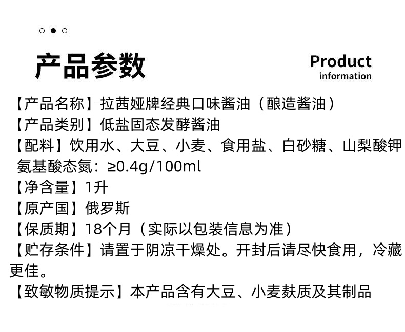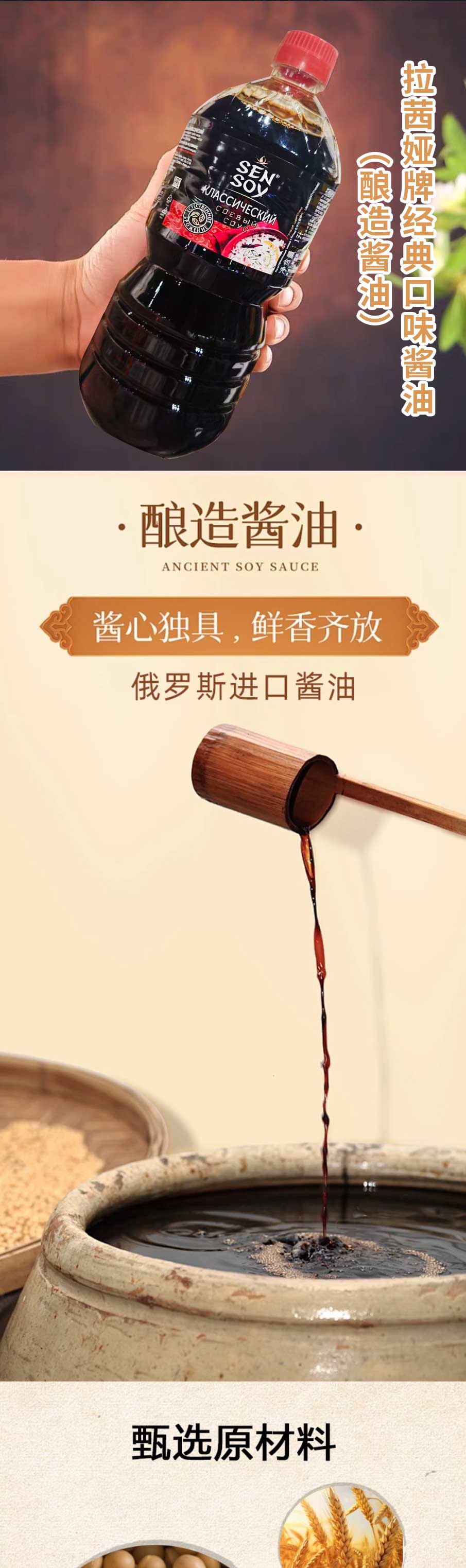 俄罗斯进口 拉茜娅牌经典口味酱油(酿造酱油)1L