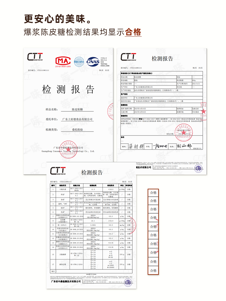 【配料】葡萄糖浆、白砂糖、浓缩苹果汁(还原后果汁含量8%)、陈皮粉、食用盐、食品添加剂(山梨糖醇、卡拉胶、琼脂、食用果胶、柠檬酸钠、DL-苹果酸、焦糖色、食品用香精)