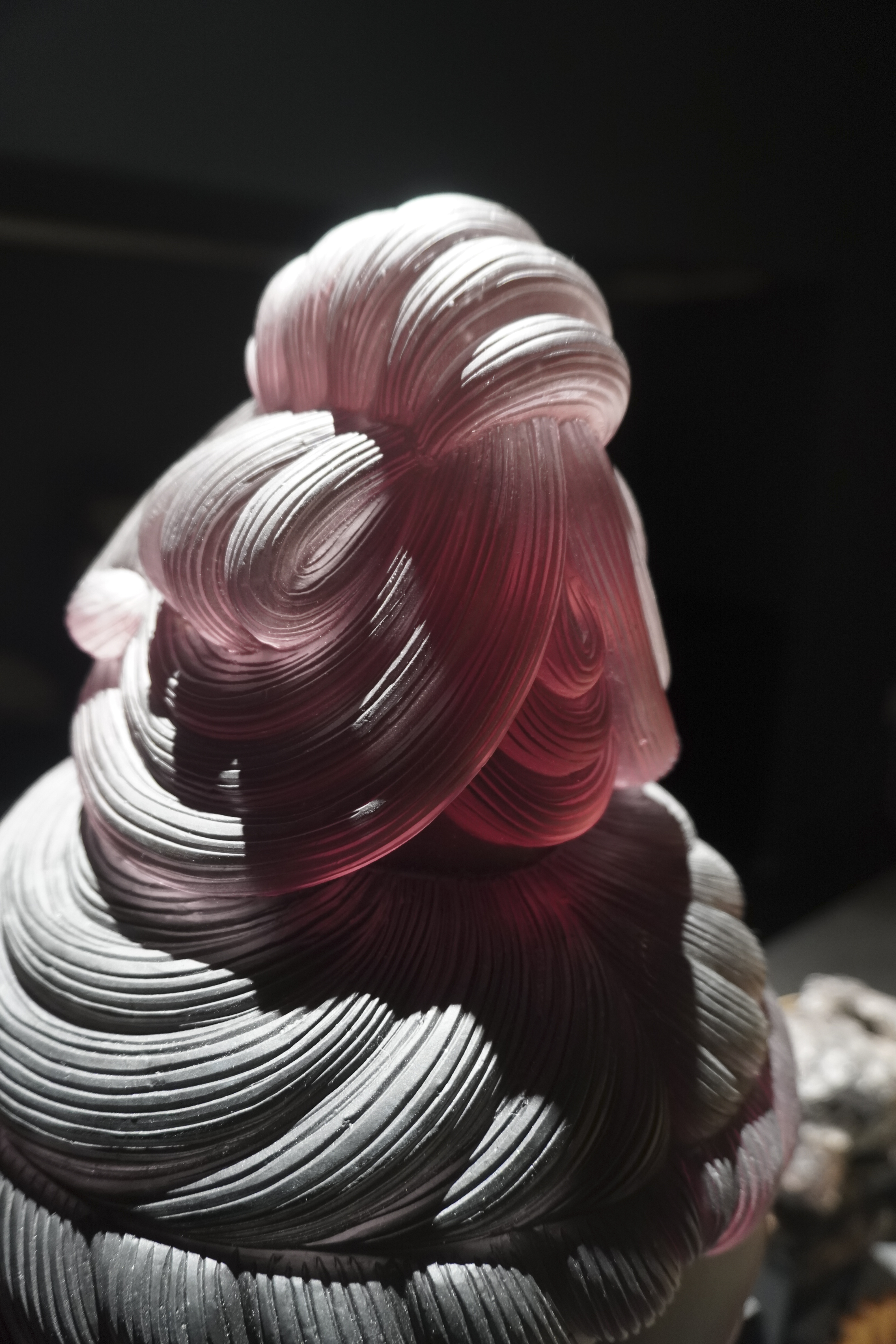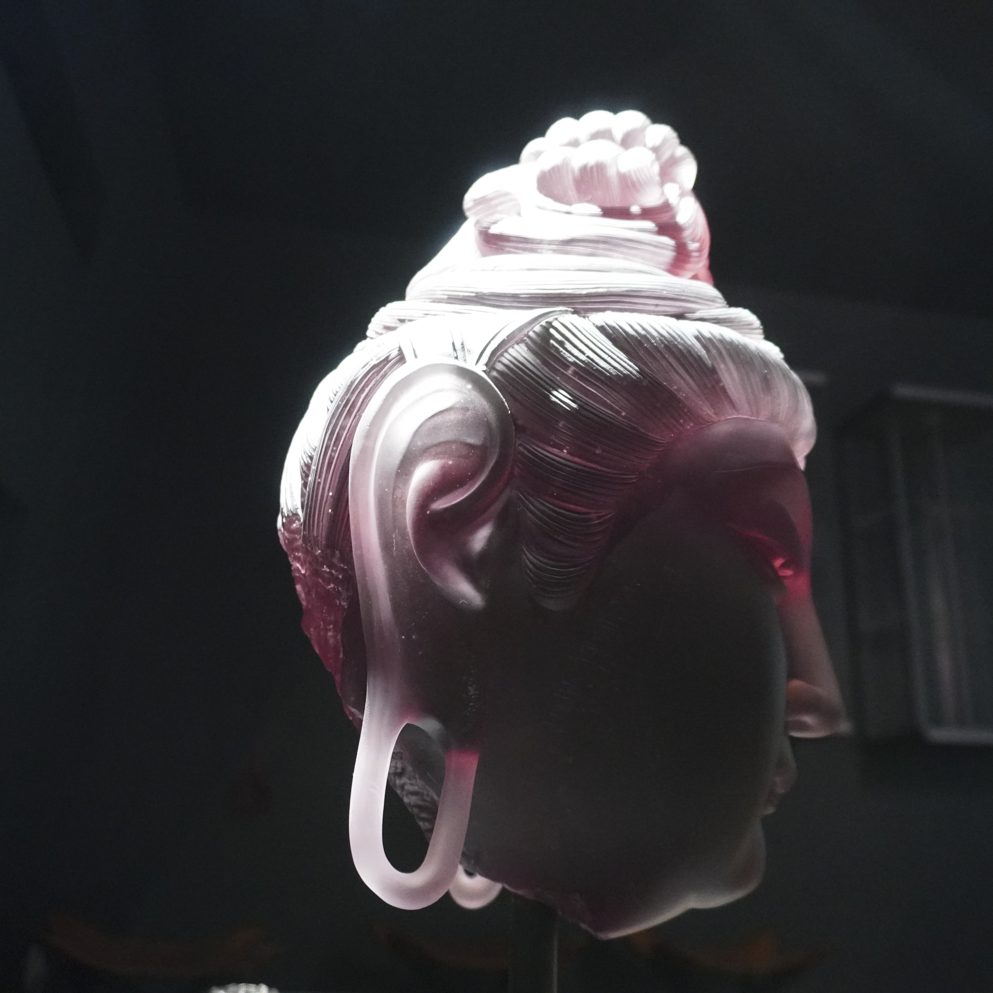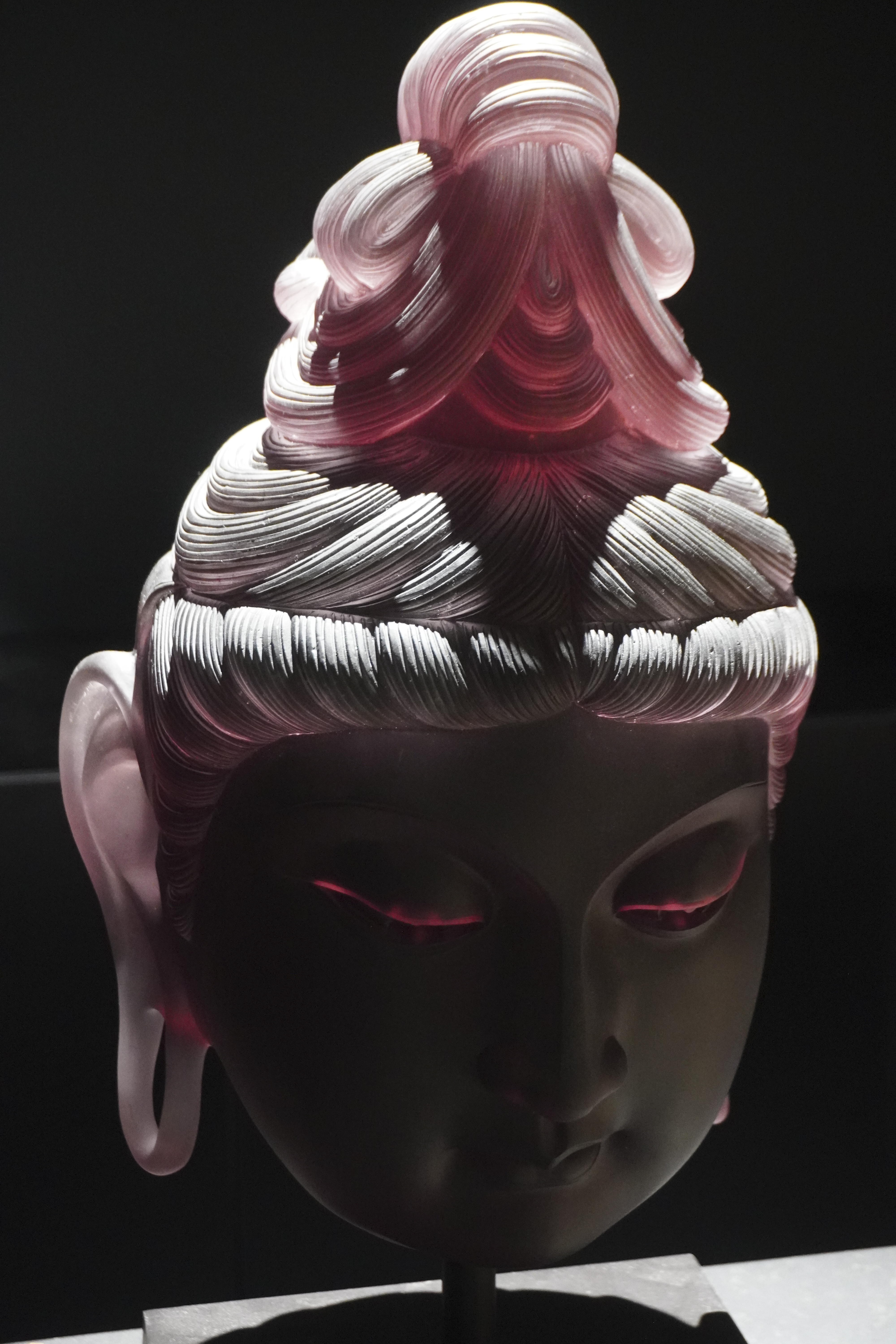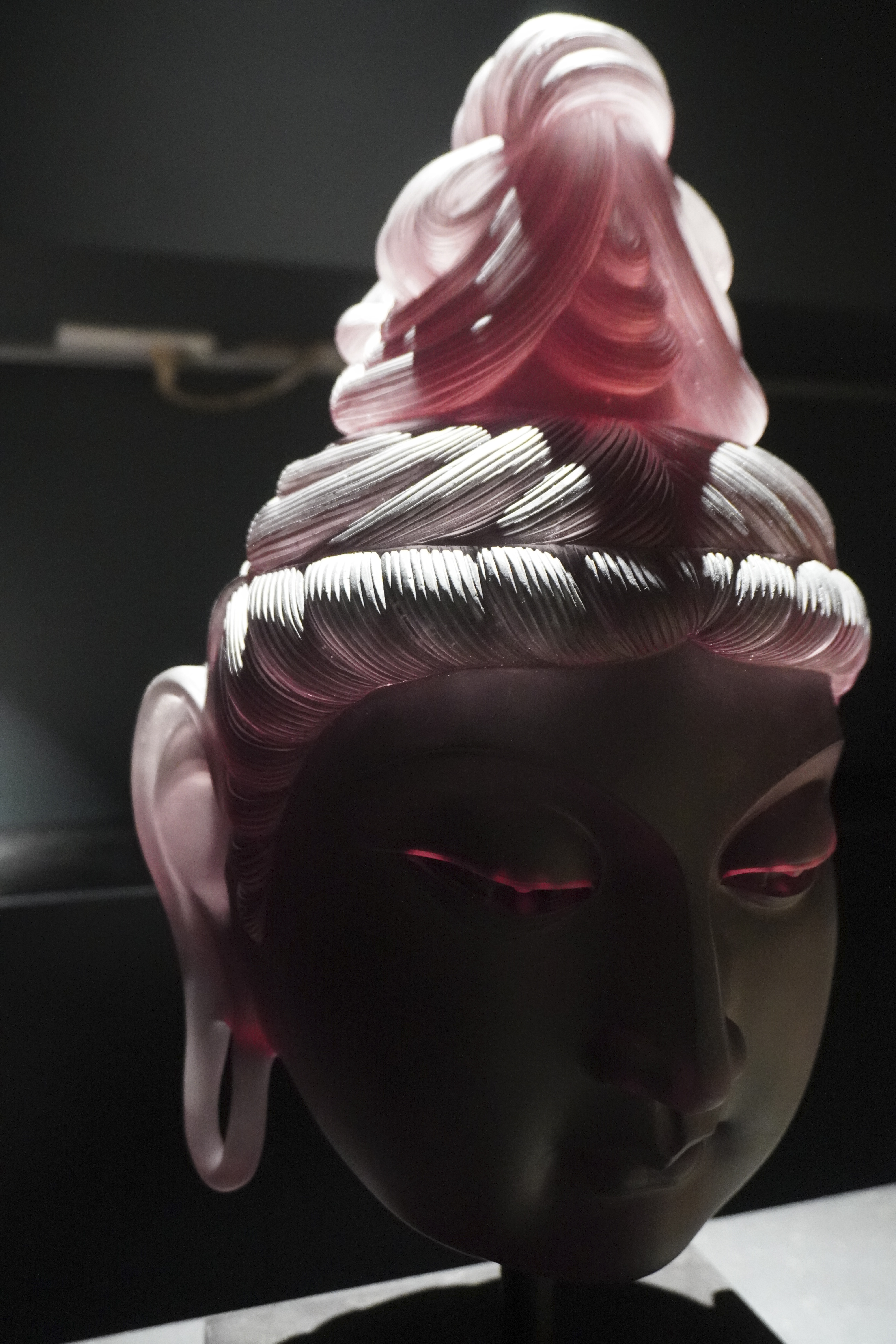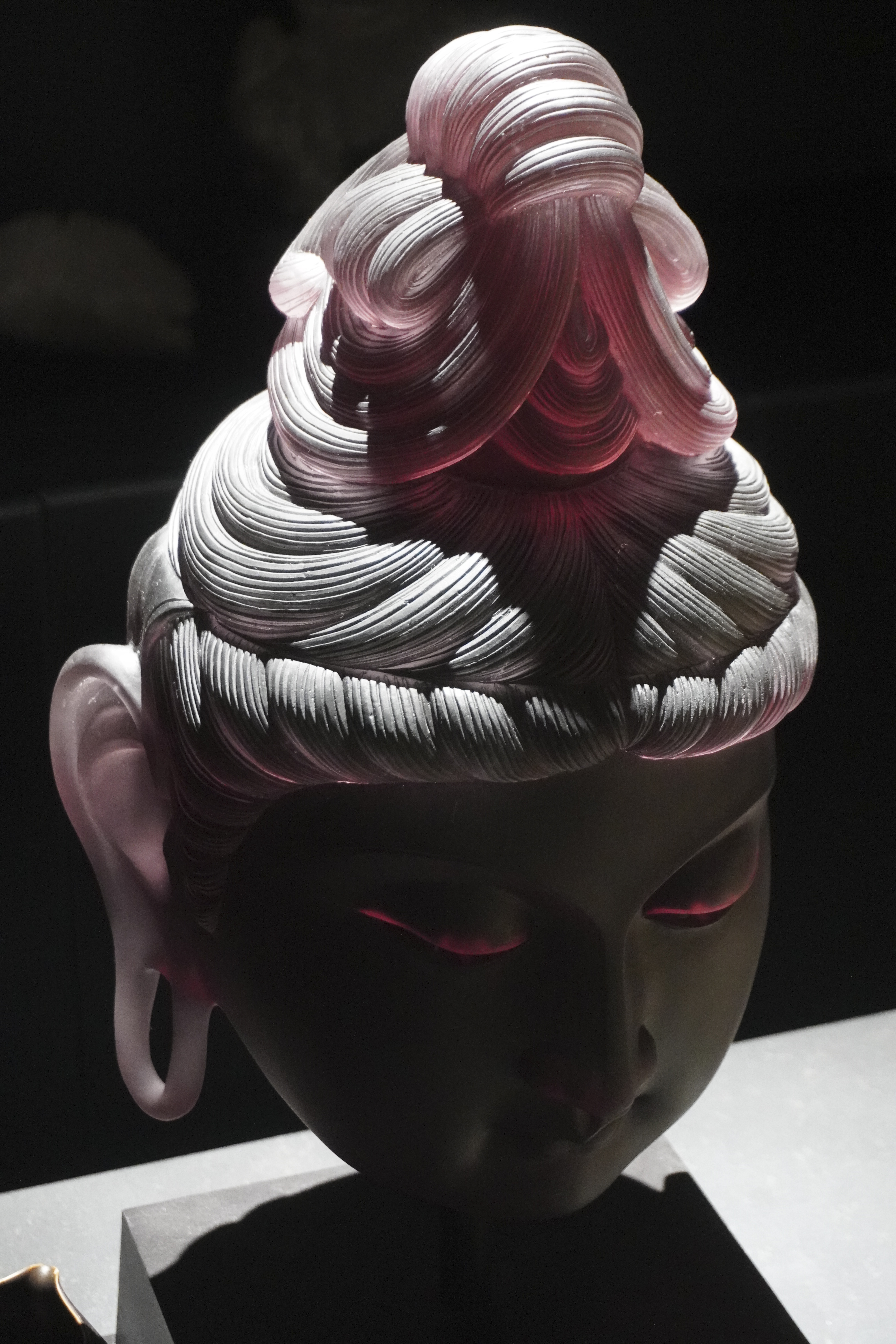 观音之容,超凡脱俗。粉发如丝,轻盈飘扬,非尘世所染,却似天界之霞光,映照其圣洁之姿。发间点缀以洁白卷曲发饰,精致细腻,宛如晨露微凝,更显其高雅不凡。面部雕刻,细腻入微。深邃眼眸,宛如秋水,仿佛能洞察世间万物之悲喜;高挺鼻梁,如峰峦叠嶂,展现出观音之庄严与气度。尤为动人者,是那微笑之唇,轻轻上扬,宛如春风拂面,给人以无尽的温暖与安慰。提及工艺,不得不赞唐代夹纻之精湛。此佛头相,正是汲取了唐代夹纻工艺之精髓,再经匠人精心雕琢而成。其线条流畅自然,形态逼真生动,展现出工匠的高超技艺与深厚文化底蕴。古人云:“见佛一拜,罪灭河沙。”此粉发观音佛头相,虽非真佛降临,但其慈悲之态,已足以净化人心。愿诸君观之,皆能心生敬畏与慈悲,以佛法为指引,修行正道,成就善果。