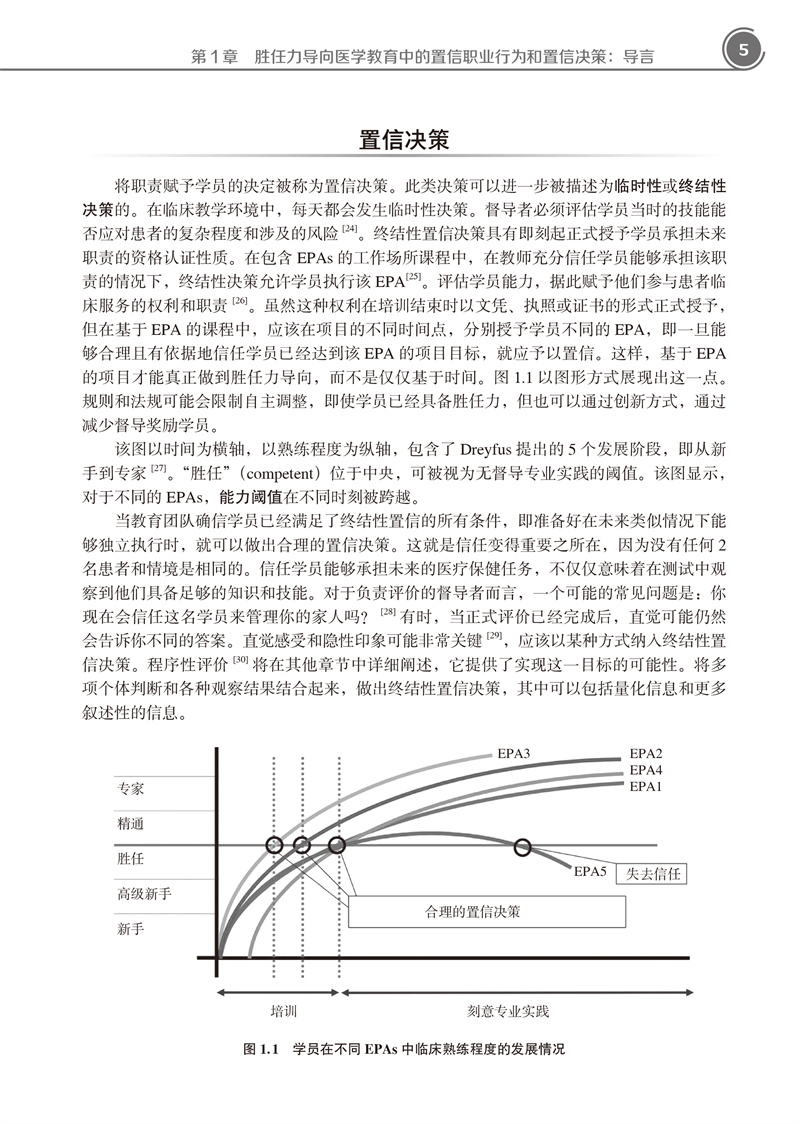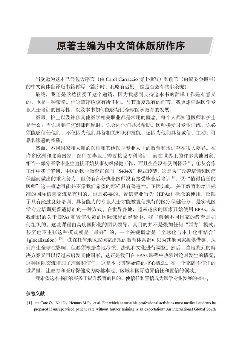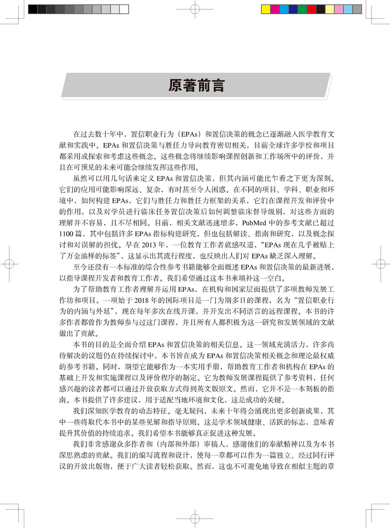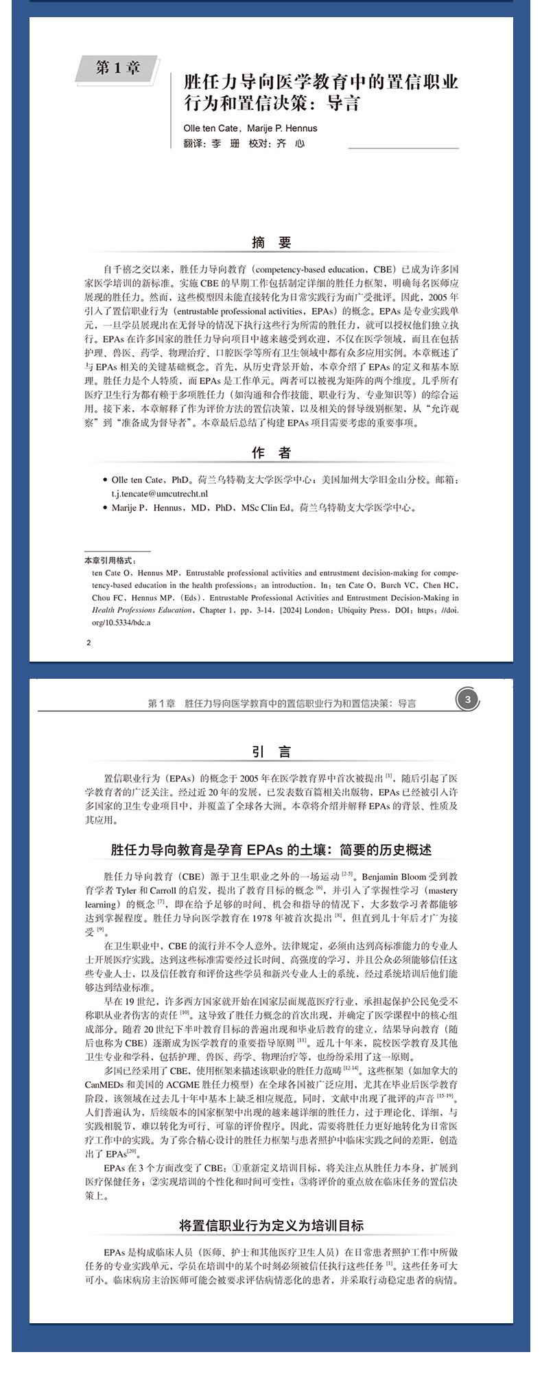 本书的目的是全面介绍置信职业行为(EPAs)和置信决策的相关信息。它旨在成为一本EPAs和置信决策相关概念和理论最权威的参考书籍,这一领域充满活力,许多尚待解决的议题仍在持续探讨中。同时,期望它能够作为一本实用手册,帮助教育工作者和机构在EPAs的基础上开发和实施课程和评价程序。它为教师发展课程提供了参考资料,任何感兴趣的读者都可以通过开放获取方式得到英文版原文。然而,它并不是一本刻板的指南。本书提供了许多建议,用于适配当地环境和文化,这是成功的关键。