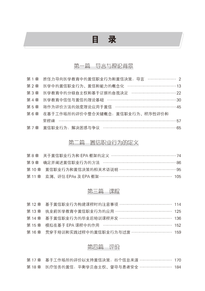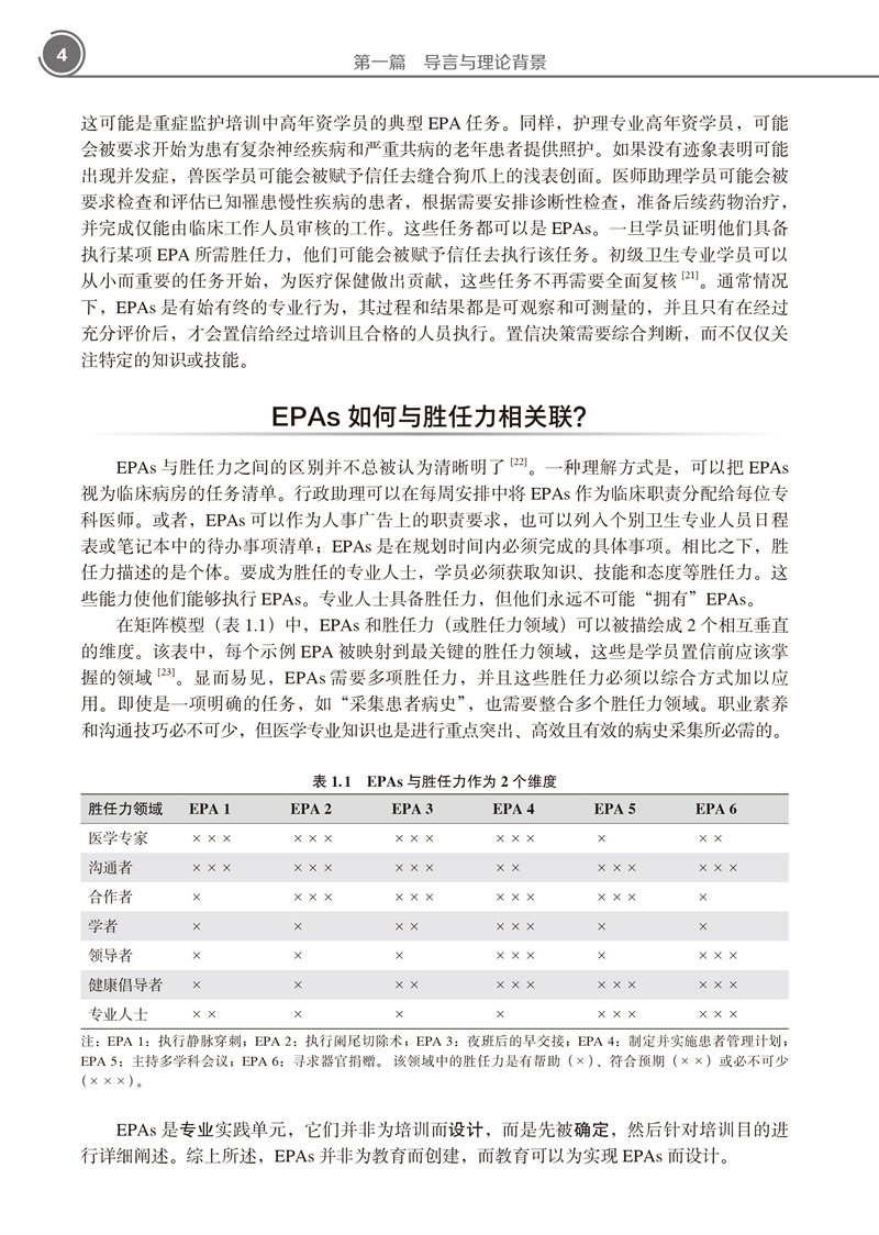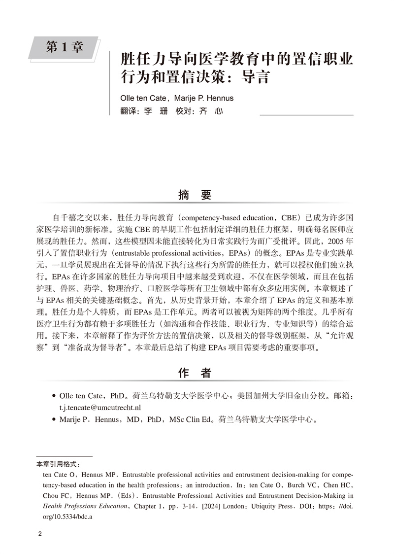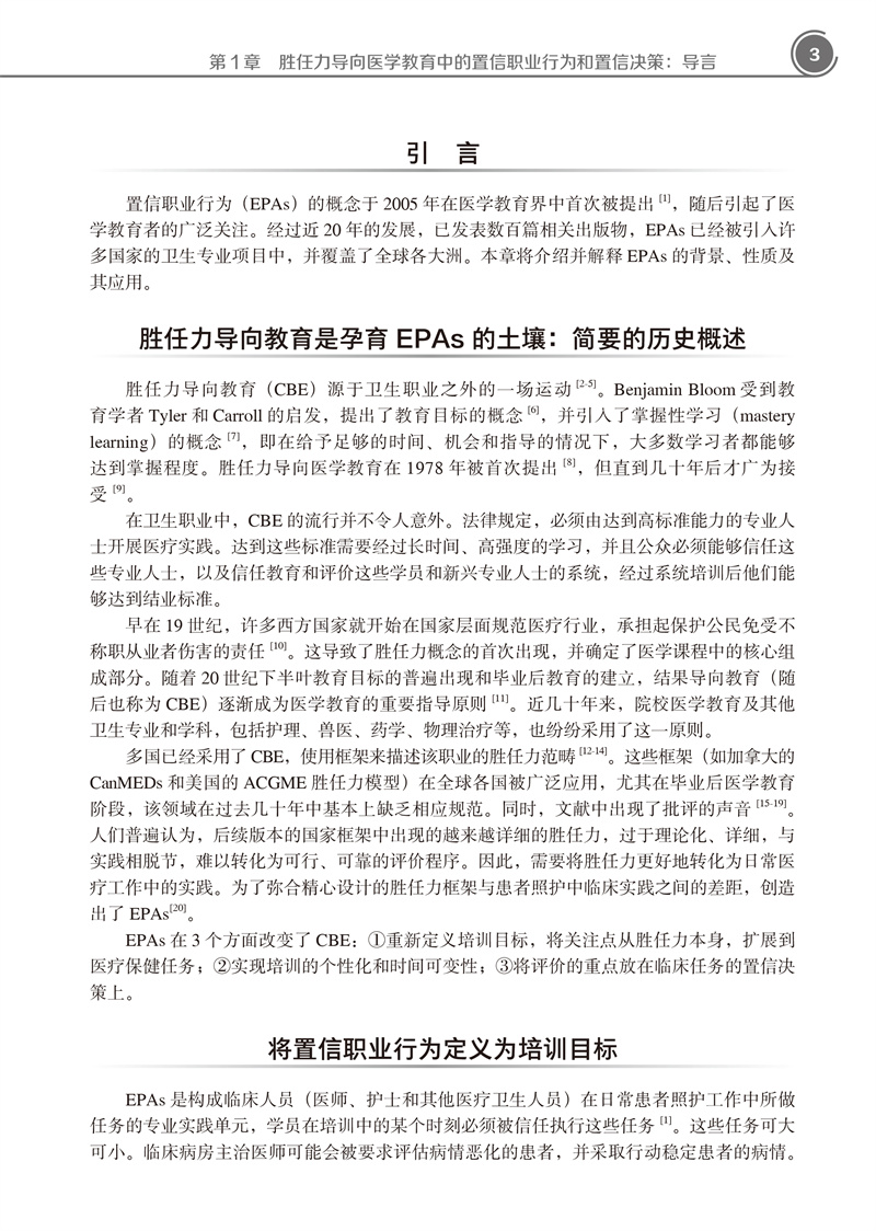 本书的目的是全面介绍置信职业行为(EPAs)和置信决策的相关信息。它旨在成为一本EPAs和置信决策相关概念和理论最权威的参考书籍,这一领域充满活力,许多尚待解决的议题仍在持续探讨中。同时,期望它能够作为一本实用手册,帮助教育工作者和机构在EPAs的基础上开发和实施课程和评价程序。它为教师发展课程提供了参考资料,任何感兴趣的读者都可以通过开放获取方式得到英文版原文。然而,它并不是一本刻板的指南。本书提供了许多建议,用于适配当地环境和文化,这是成功的关键。