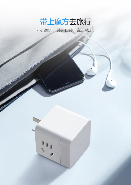 集成结构设计 小巧便携 打破传统插排横向插孔排布方式,采用集成结构设计, 独特立体排布方式,使体积小到54*54*54mm, 只有一个魔方大小,小巧便携。 迷你身材 功能强大 在小小的立方体上,2个插孔、强大配置,居家、办公、旅行各种用电需求一应满足。