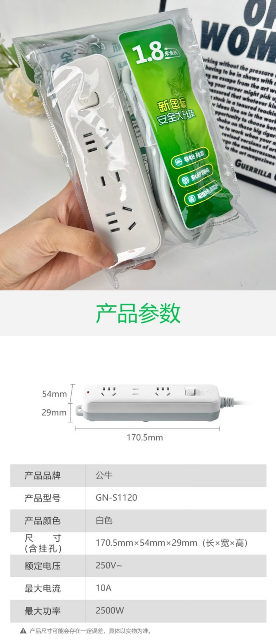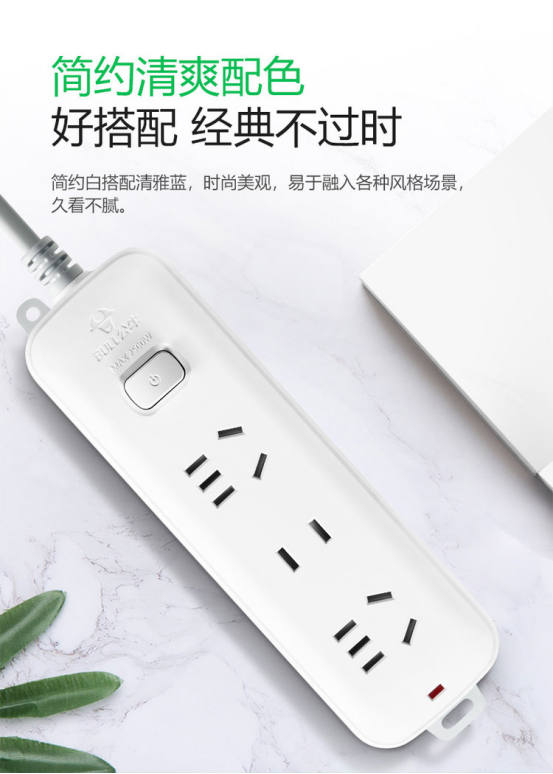 ——款式2️⃣:公牛新国标插座—S1120—— ⚠️公牛新国标插座S1120线长:1.8米 电源线芯由0.75m㎡升级为1.0m㎡,电源线芯加粗33% 外壳为阻燃PP材料,阻燃温度750℃ 插孔全部新增防触电保护门,避免手指或细小物件插入触电 插套铜带一体设计,强扭不变形,耐插拔,使用寿命长 专为大插头设计的大间距插孔,多电器同时使用插拔方便 上下双挂钩,方便任何场景、角度的挂放 按压式开关,一键通断电