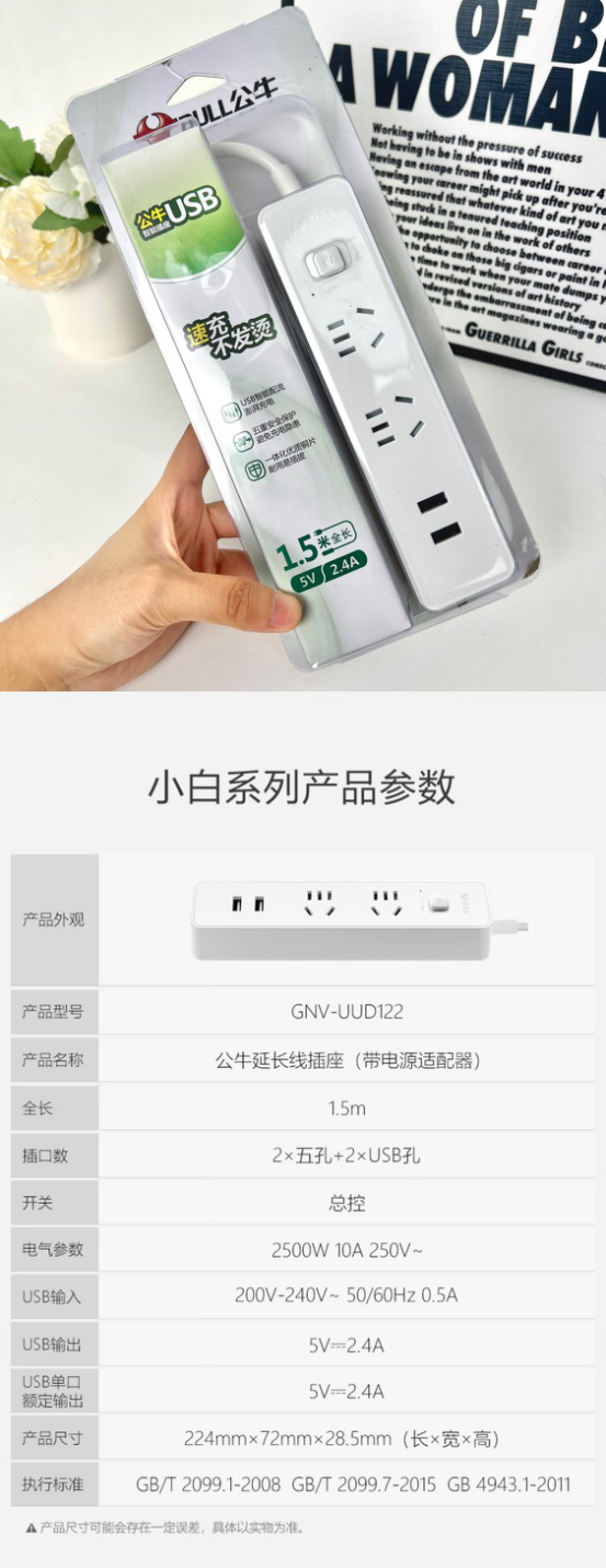——款式1️⃣:公牛智能USB插座UUD122—— ⚠️公牛智能USB插座UUD122线长:1.5米 USB智能配流,支持多设备同时充电,高效充电 五重用电安全保护,避免充电隐患 插套铜带一体设计,强扭不变形,耐插拔,使用寿命长 专为大插头设计的大间距插孔,多电器同时使用插拔方便 电源线芯加粗33%,导电好发热少;外壳为阻燃材料,不易燃烧 插孔全部新增防触电保护门,避免手指或细小物件插入触电 按压式开关,一键通断电,隐藏式指示灯,随时了解通断电情况