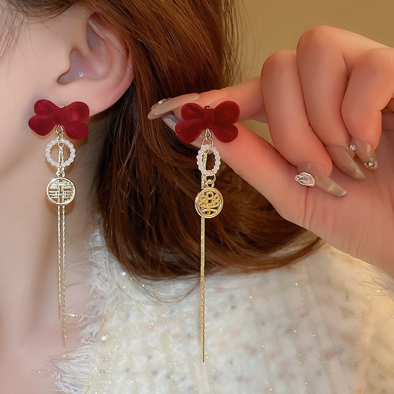 【YW】无忧购喜庆红色丝绒蝴蝶结耳钉O-038(截单后7天发货)