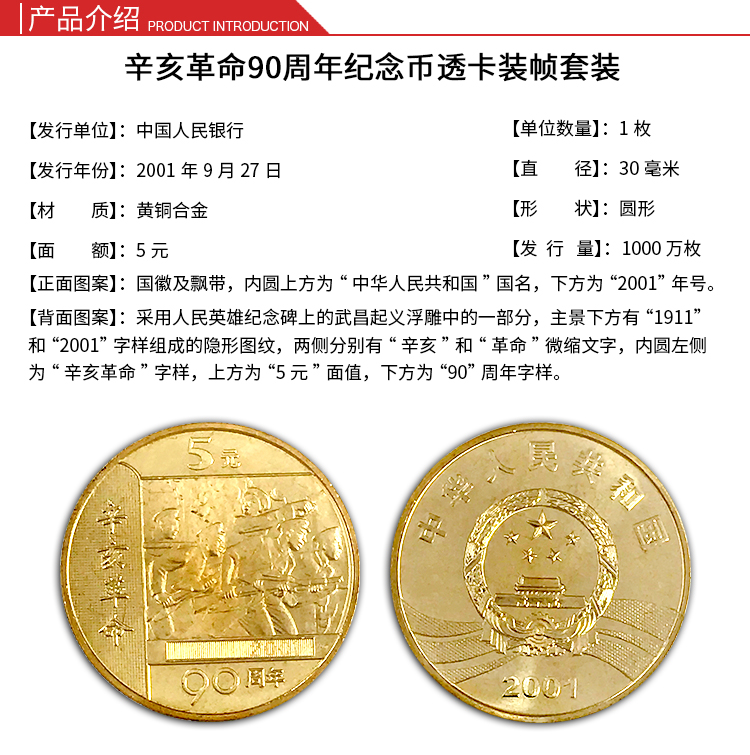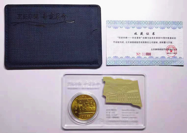 北京康银阁钱币有限责任公司,是中国人民银行特许人民币经营单位,是从事普通流通纪念币、人民币装帧及批发、销售业务为主的专业公司。康银阁装帧的纪念币卡册,为大众收藏、投资普通纪念币提供了品质保障,更利于纪念币的保存,同时还增加了纪念币的附加值,是大众收藏、投资、馈赠普通纪念币的上佳之选。《历史丰碑﹣辛亥革命》辛亥革命90周年普通纪念币康银阁珍藏卡装帧量10万套。