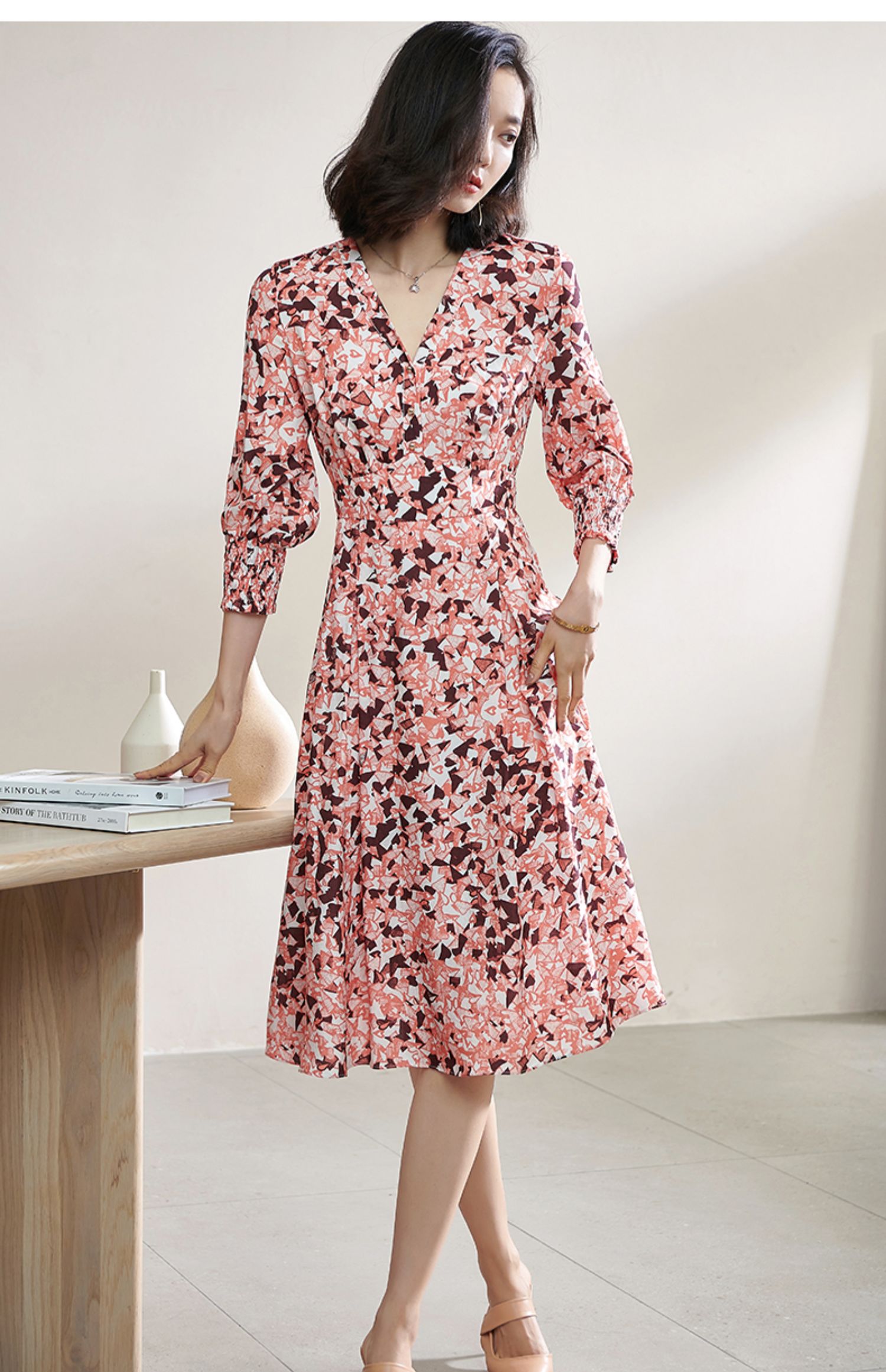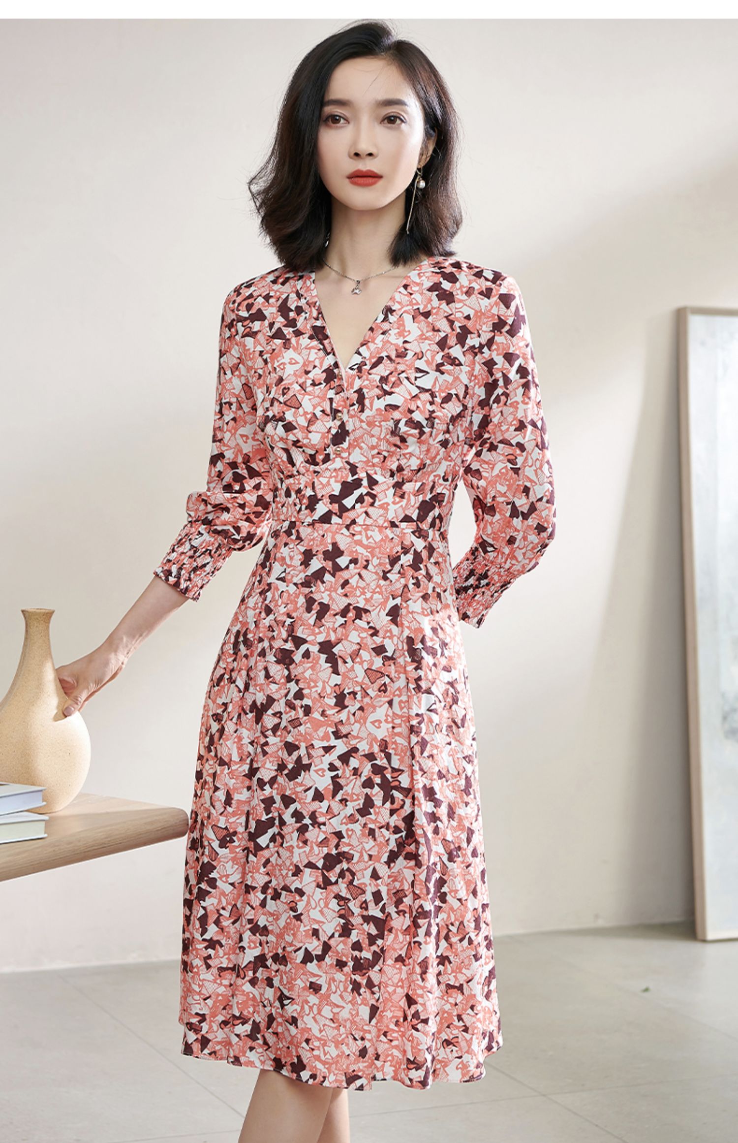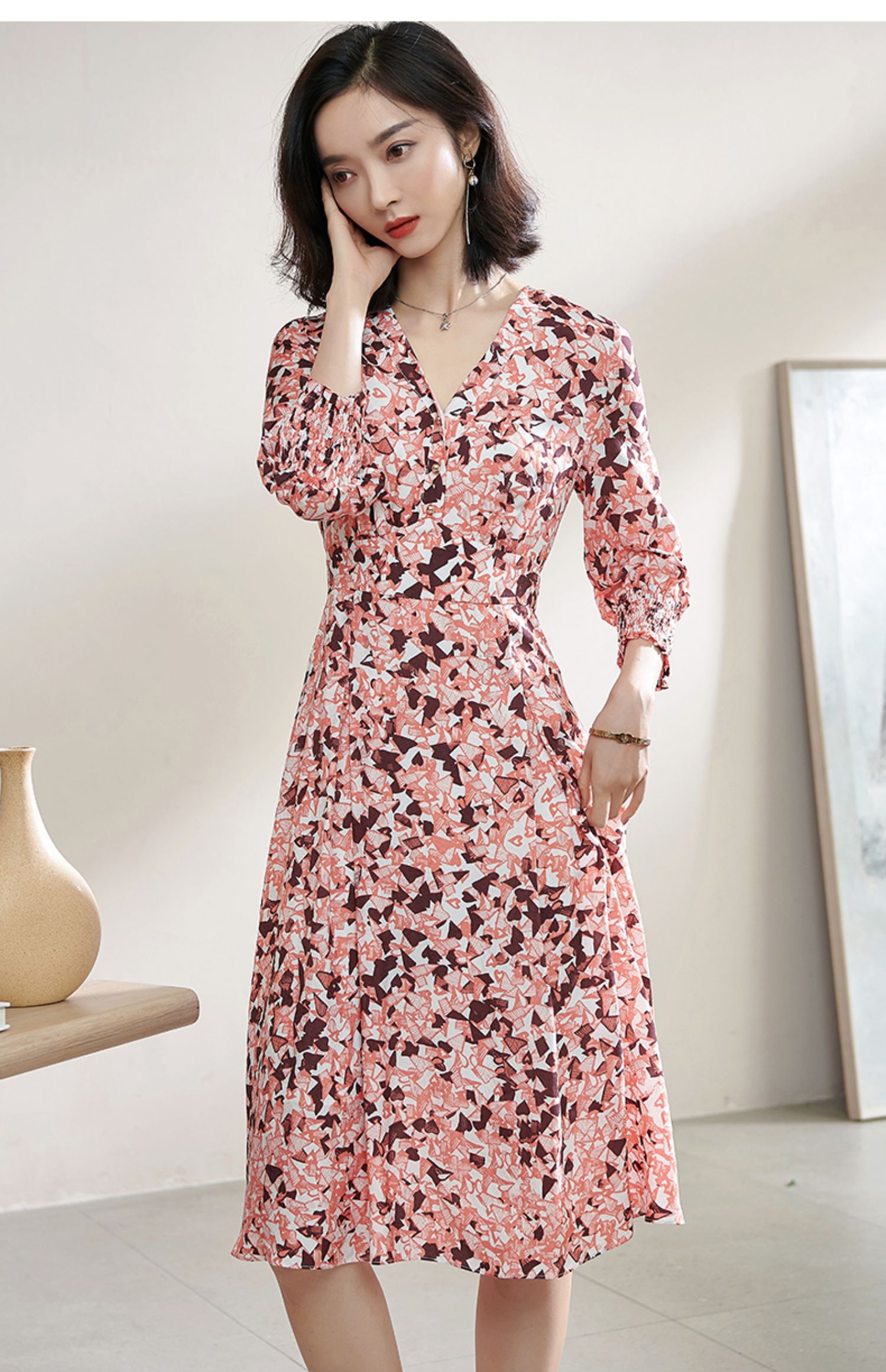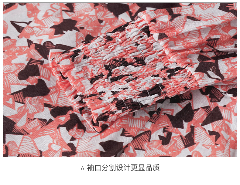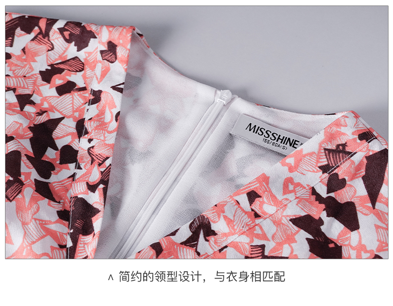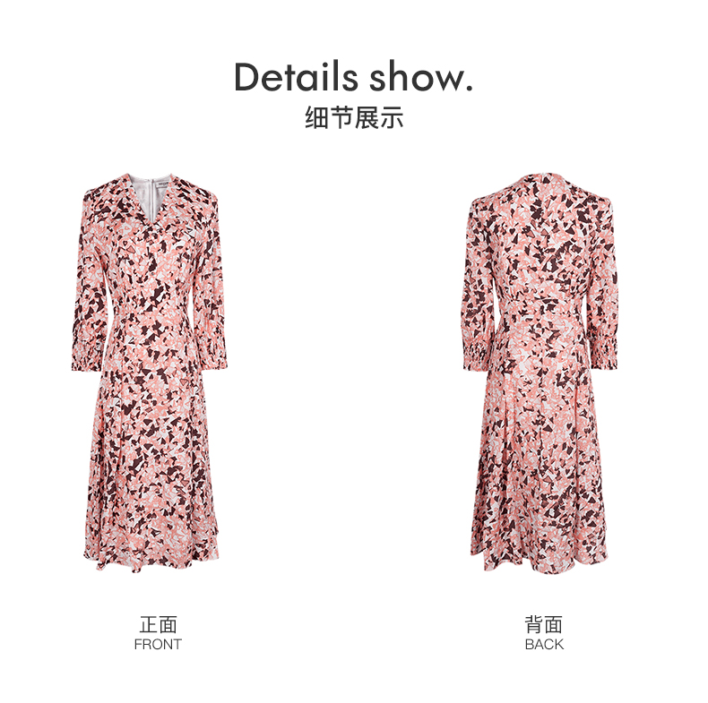 复合人丝碎花裙 气质淑女减龄花色修身显瘦V领人丝连衣裙1022