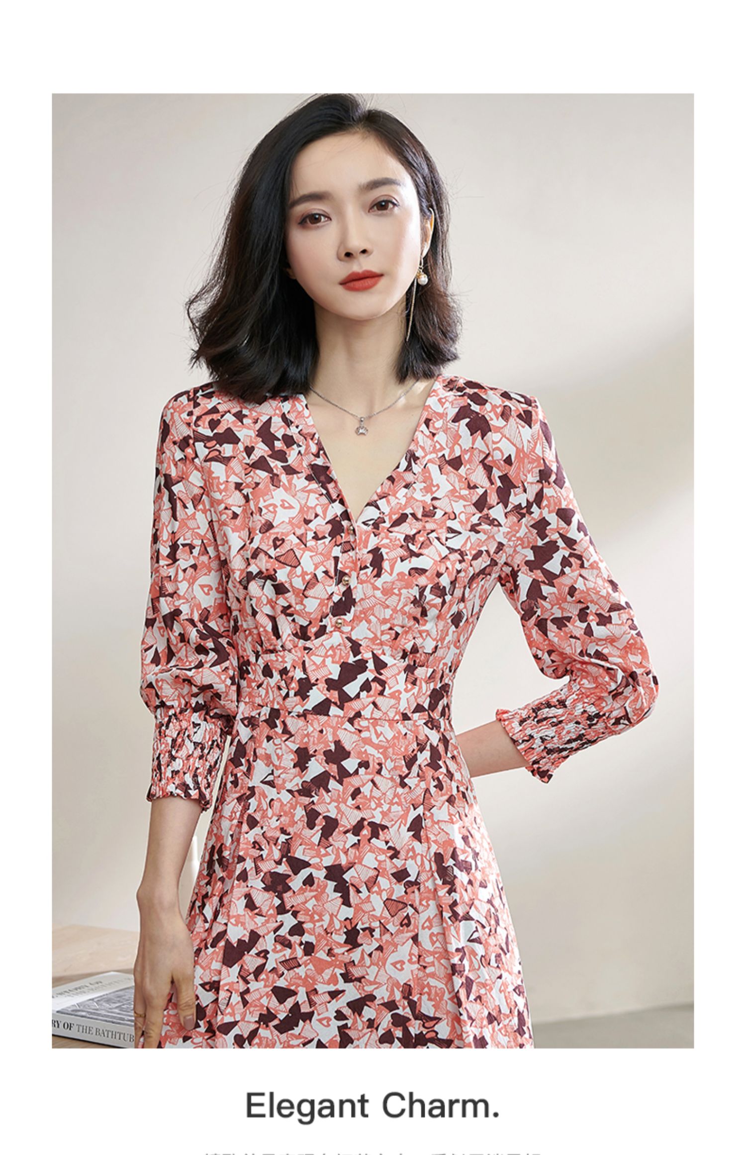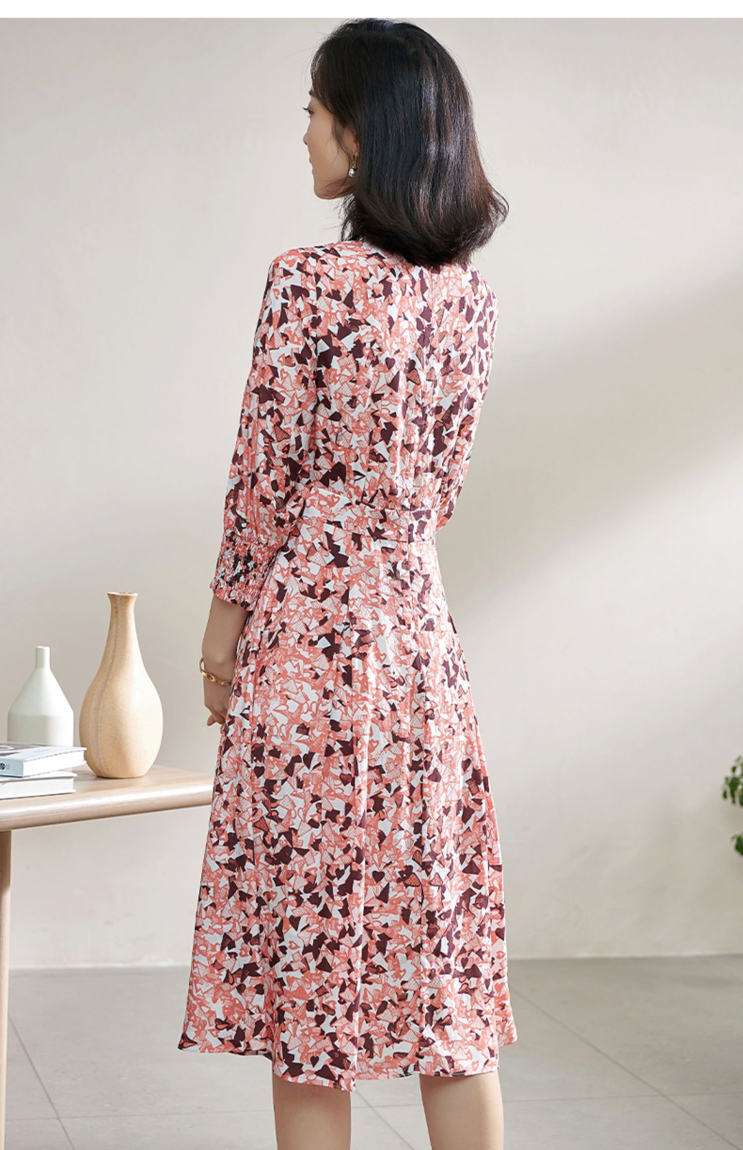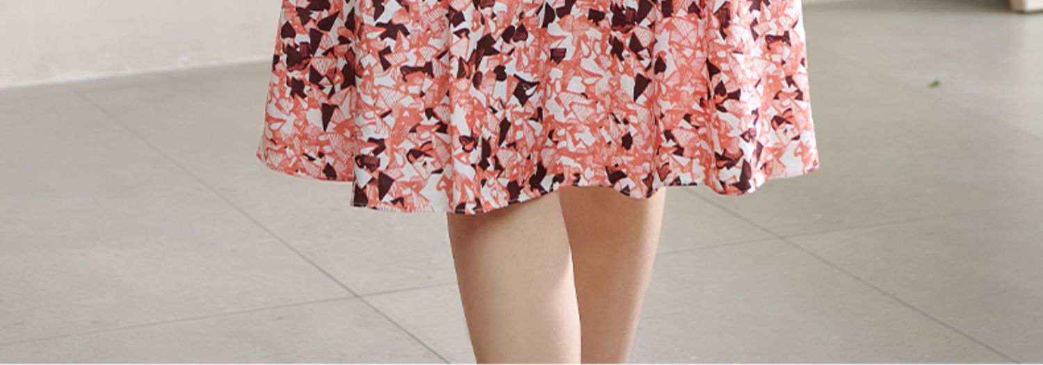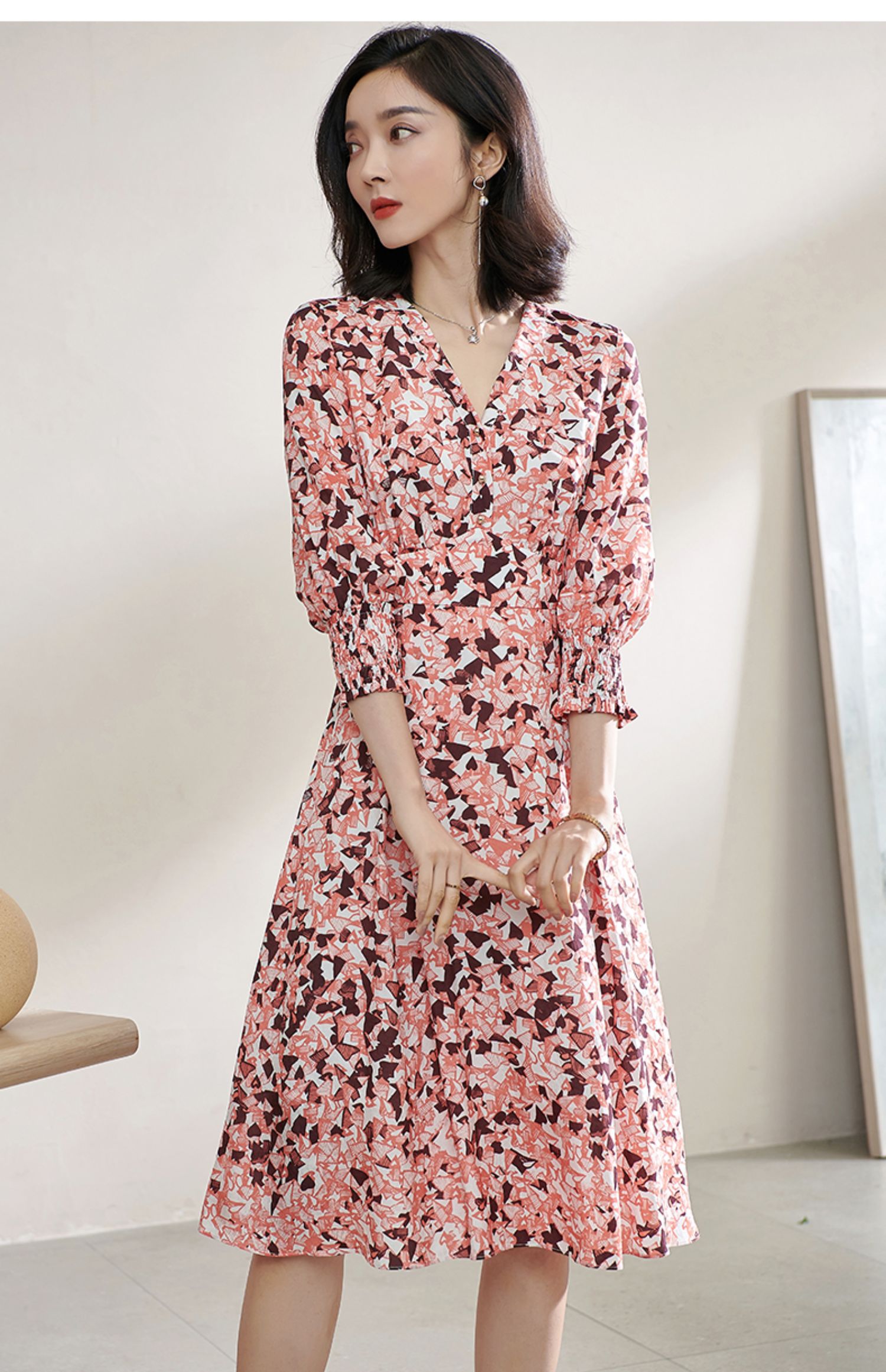 复合人丝碎花裙 气质淑女减龄花色修身显瘦V领人丝连衣裙1022