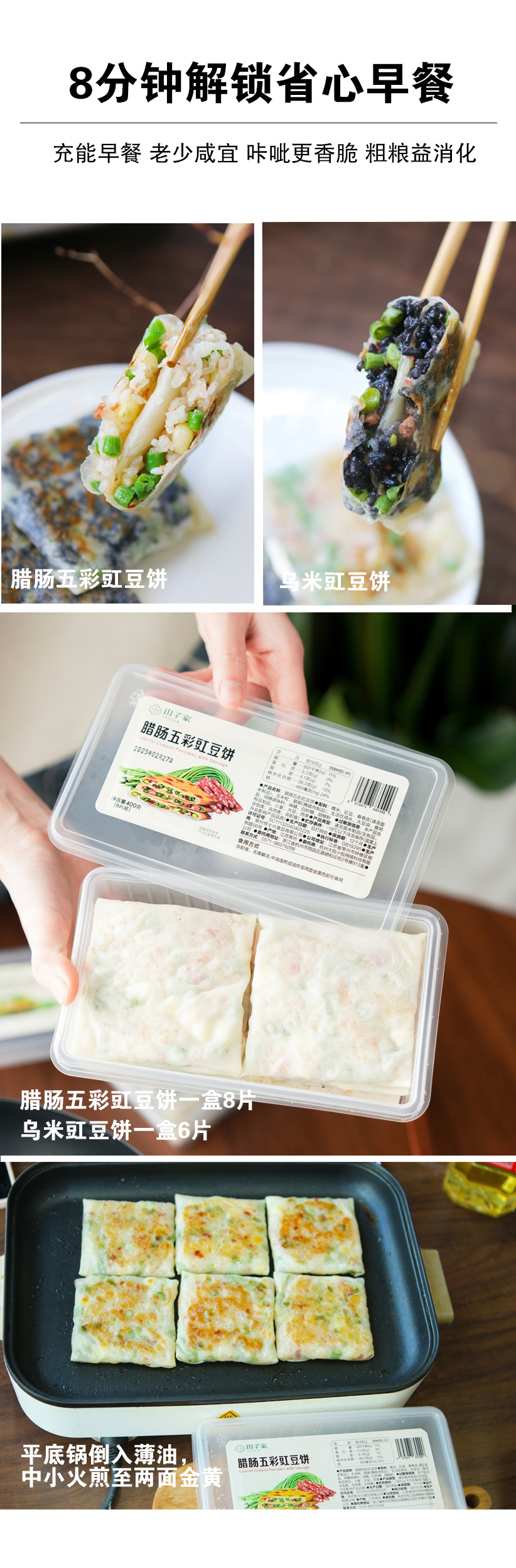 五彩腊肠豇豆饼:糯米、豇豆、春卷皮、玉米粒、腊肠、大豆油、食用盐、鸡精调味料、味精、白砂糖、胡椒粉。