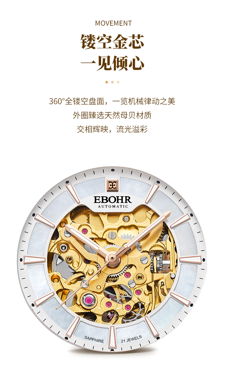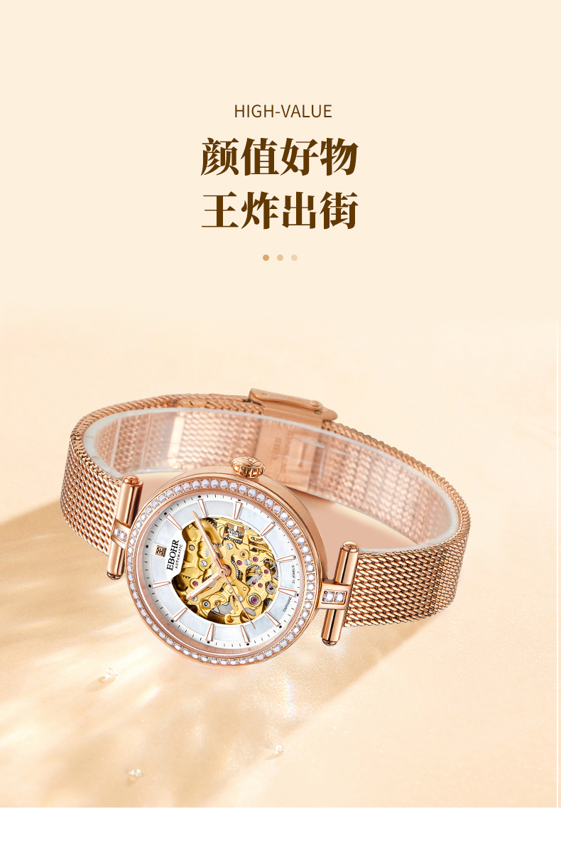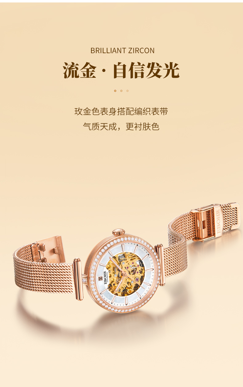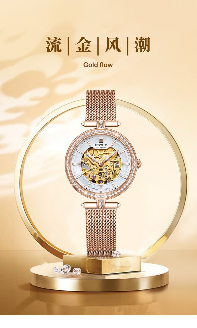 依波(EBOHR)百搭气质流金时尚镂空机械女表5153