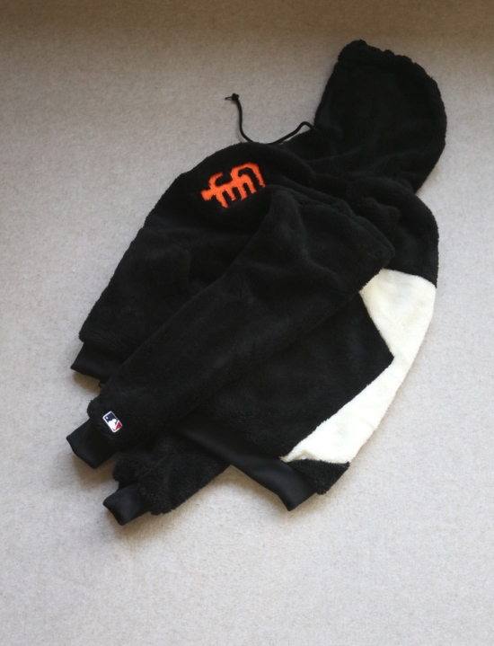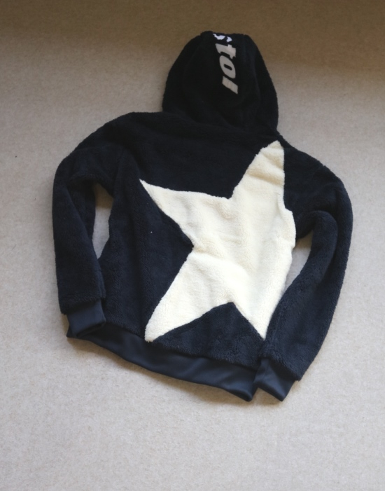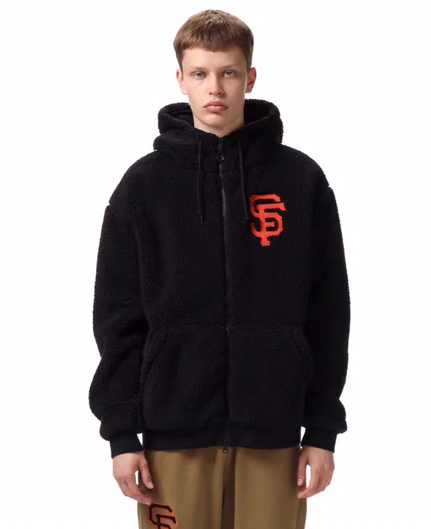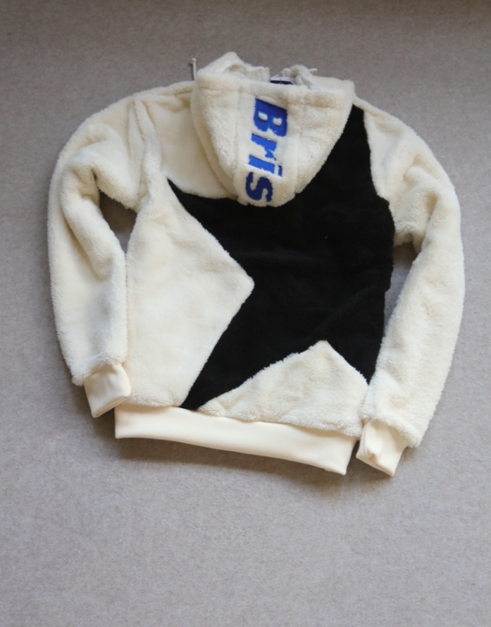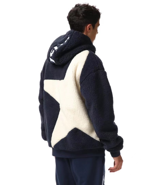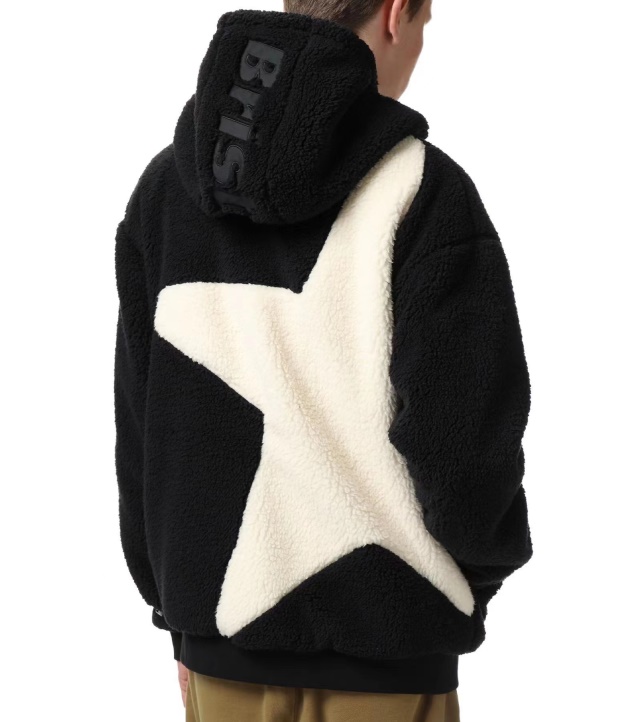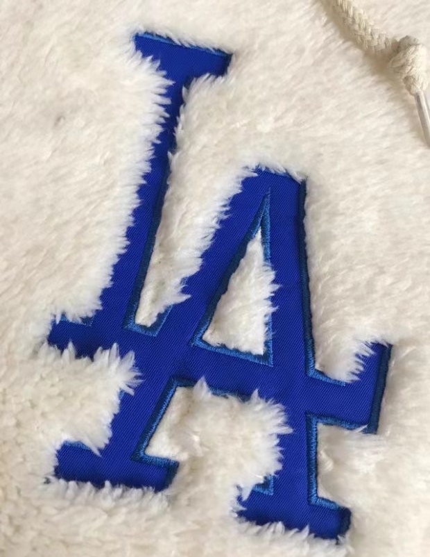 连帽款 袖口和底边是弹力螺纹 两侧斜插式口袋 字母处 是贴布+周圈刺绣