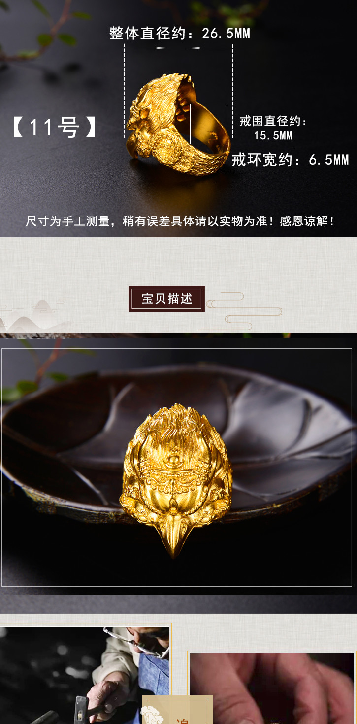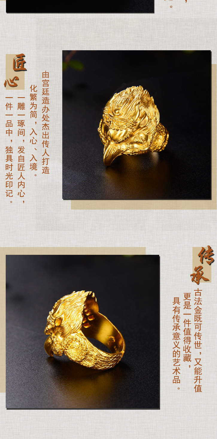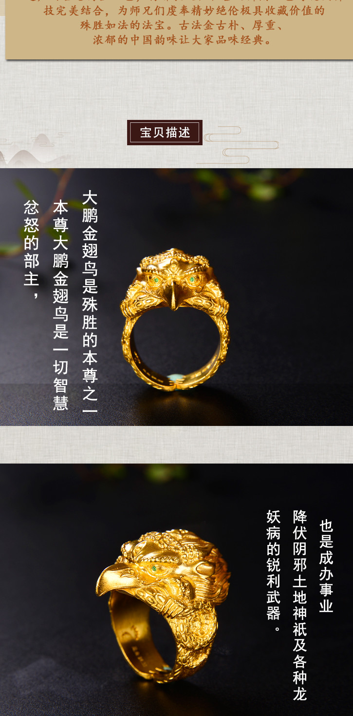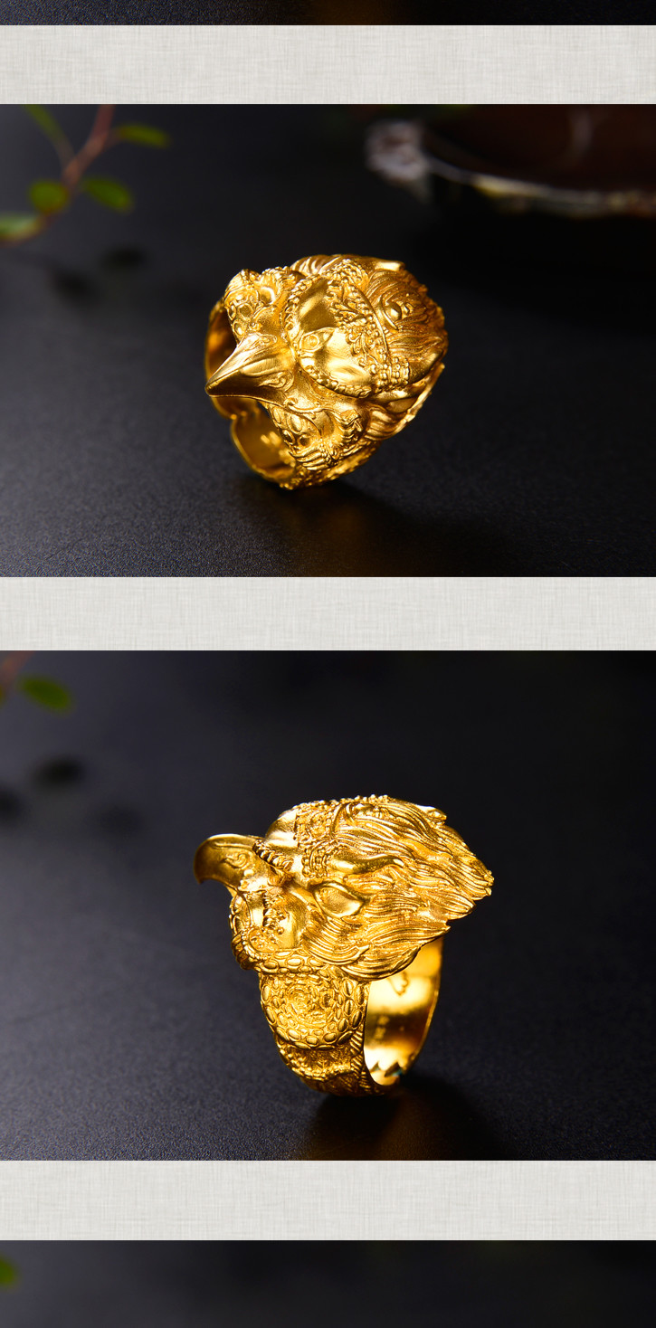 天语龙吟足金 古法黄金大鹏金翅鸟戒指黄金戒指男女款可调节