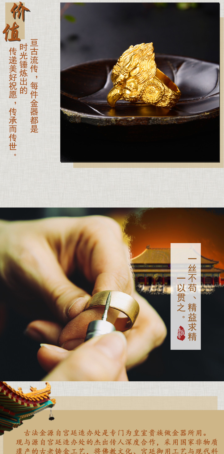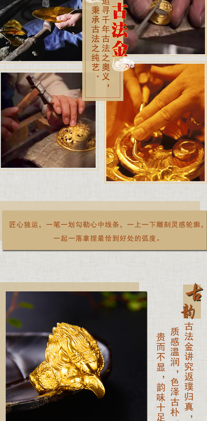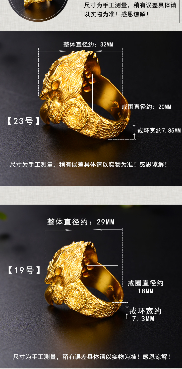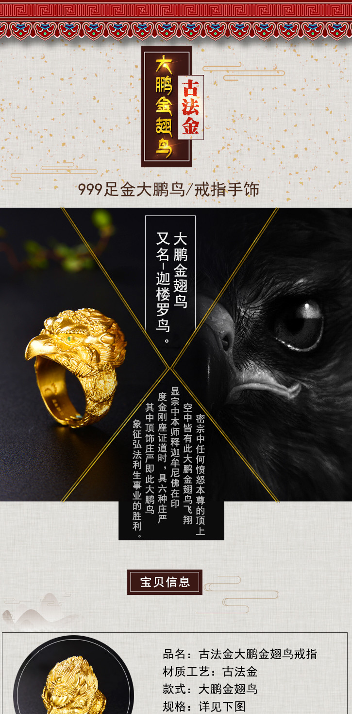 天语龙吟足金 古法黄金大鹏金翅鸟戒指黄金戒指男女款可调节