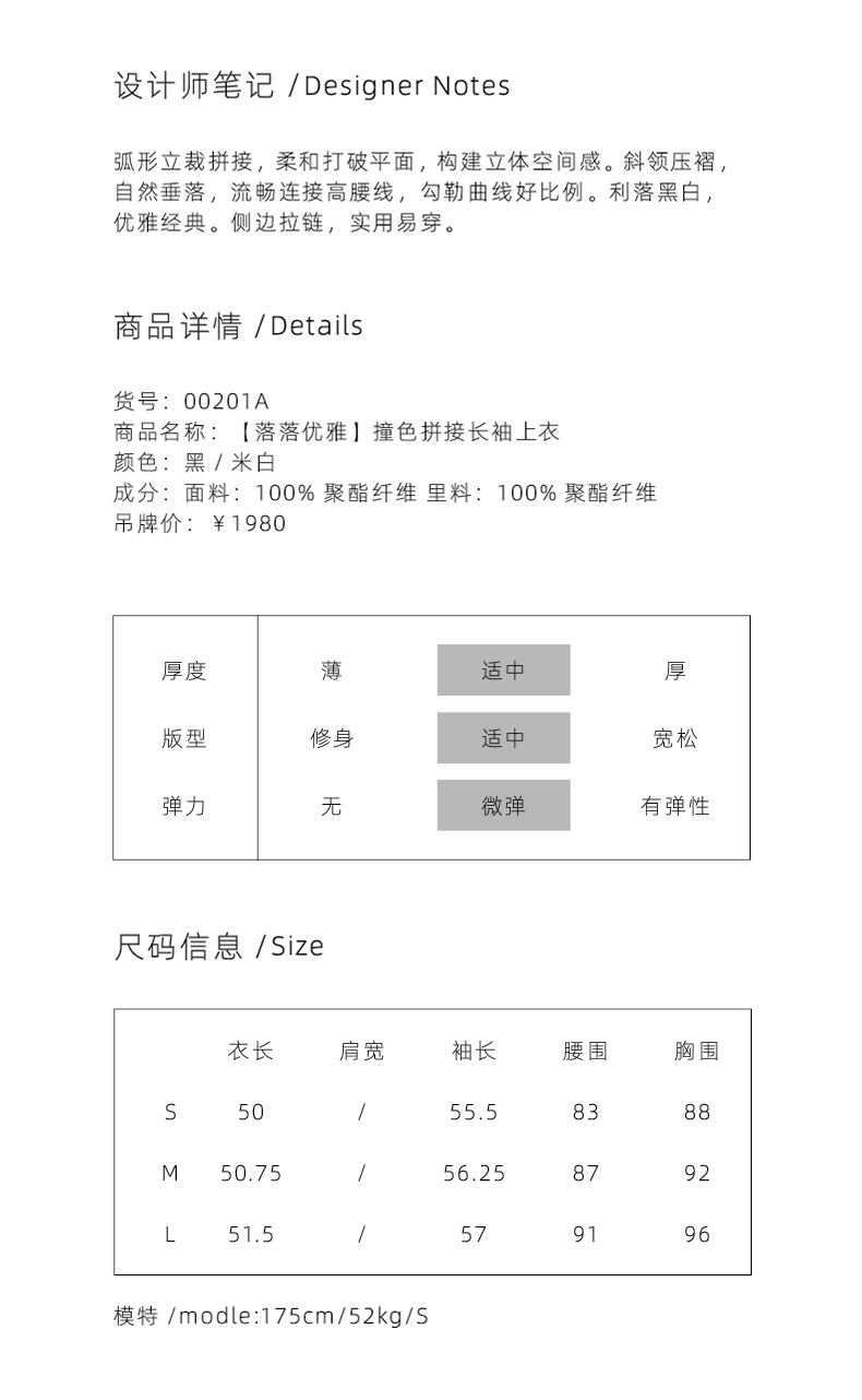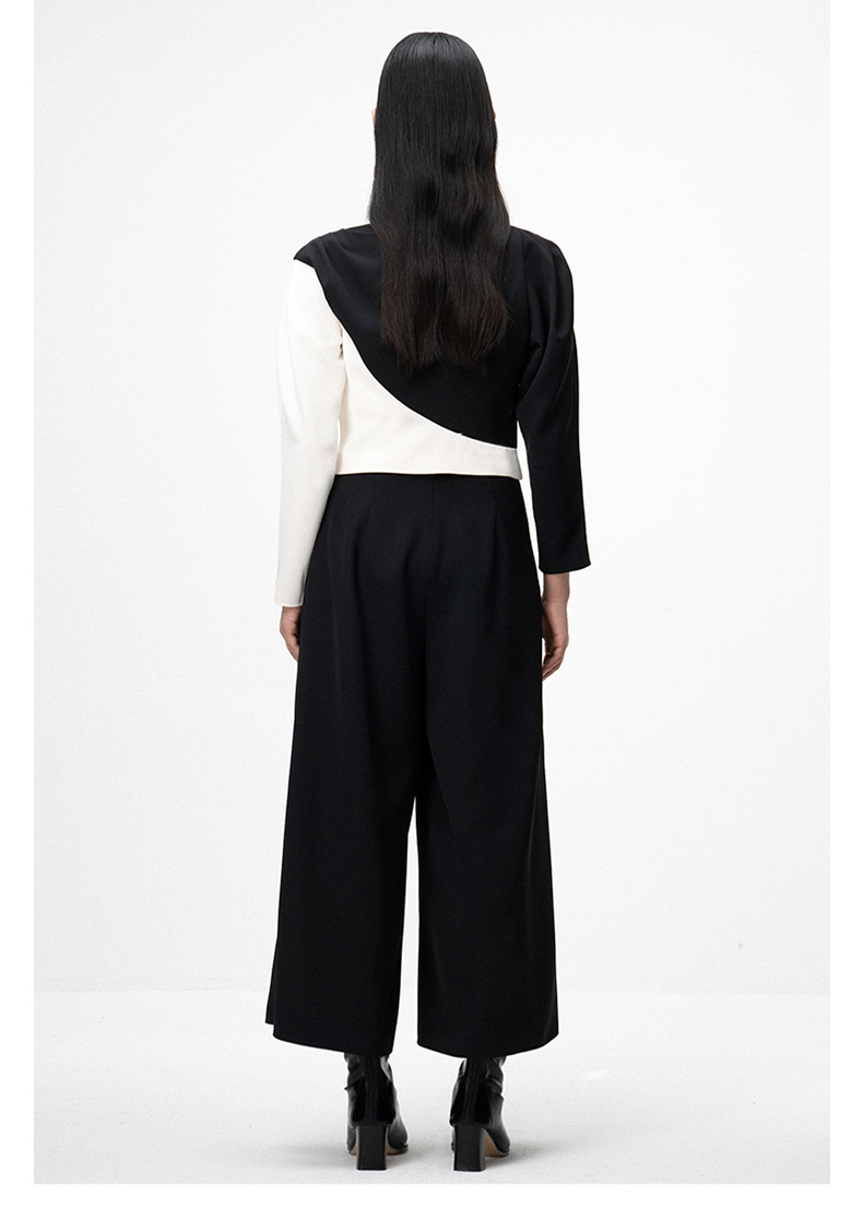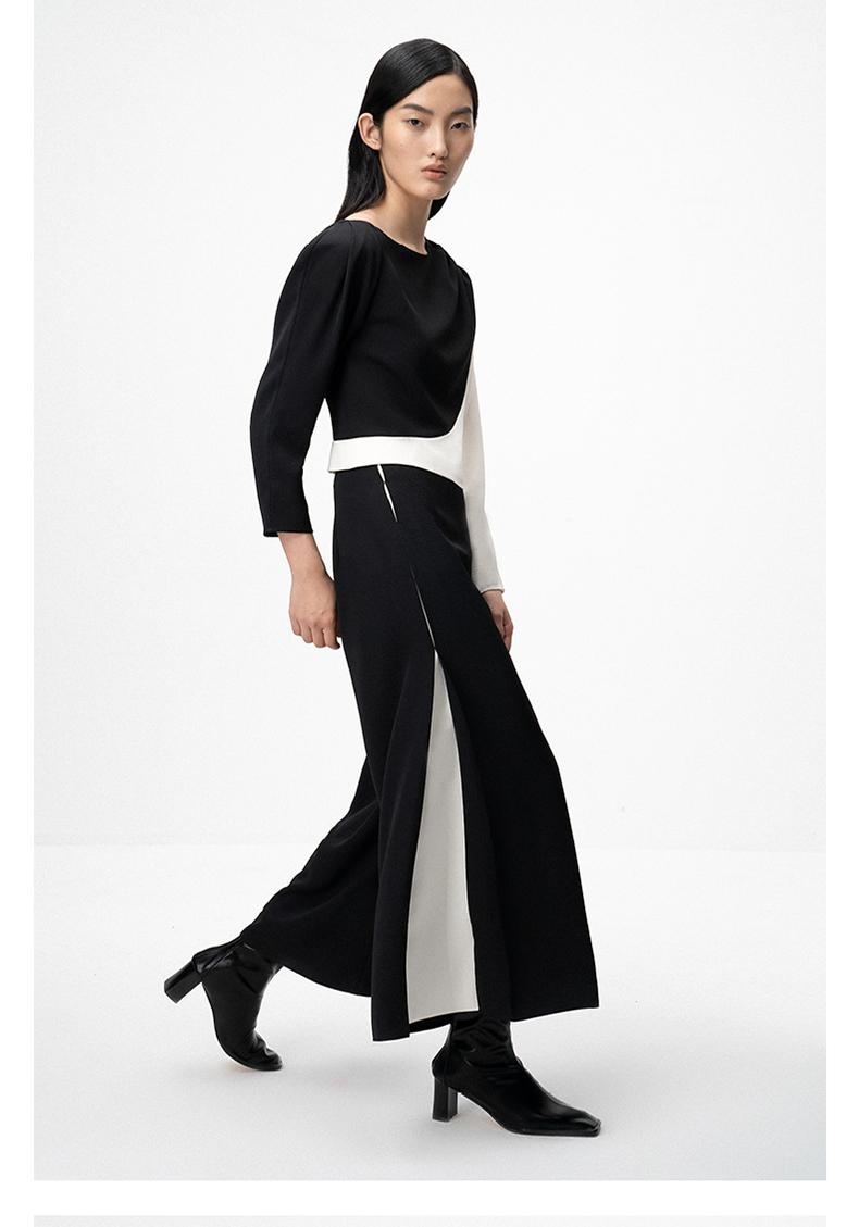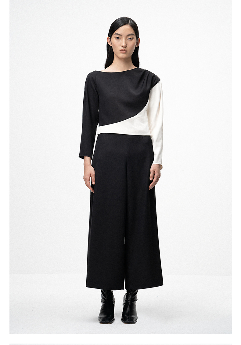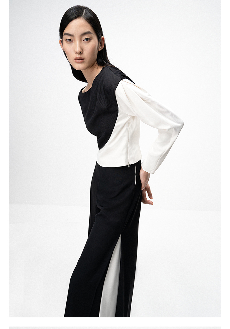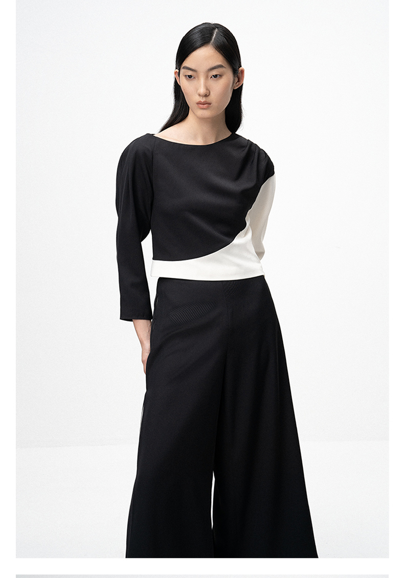 【落落优雅】肩部压褶黑白撞色拼接长袖上衣/00201A