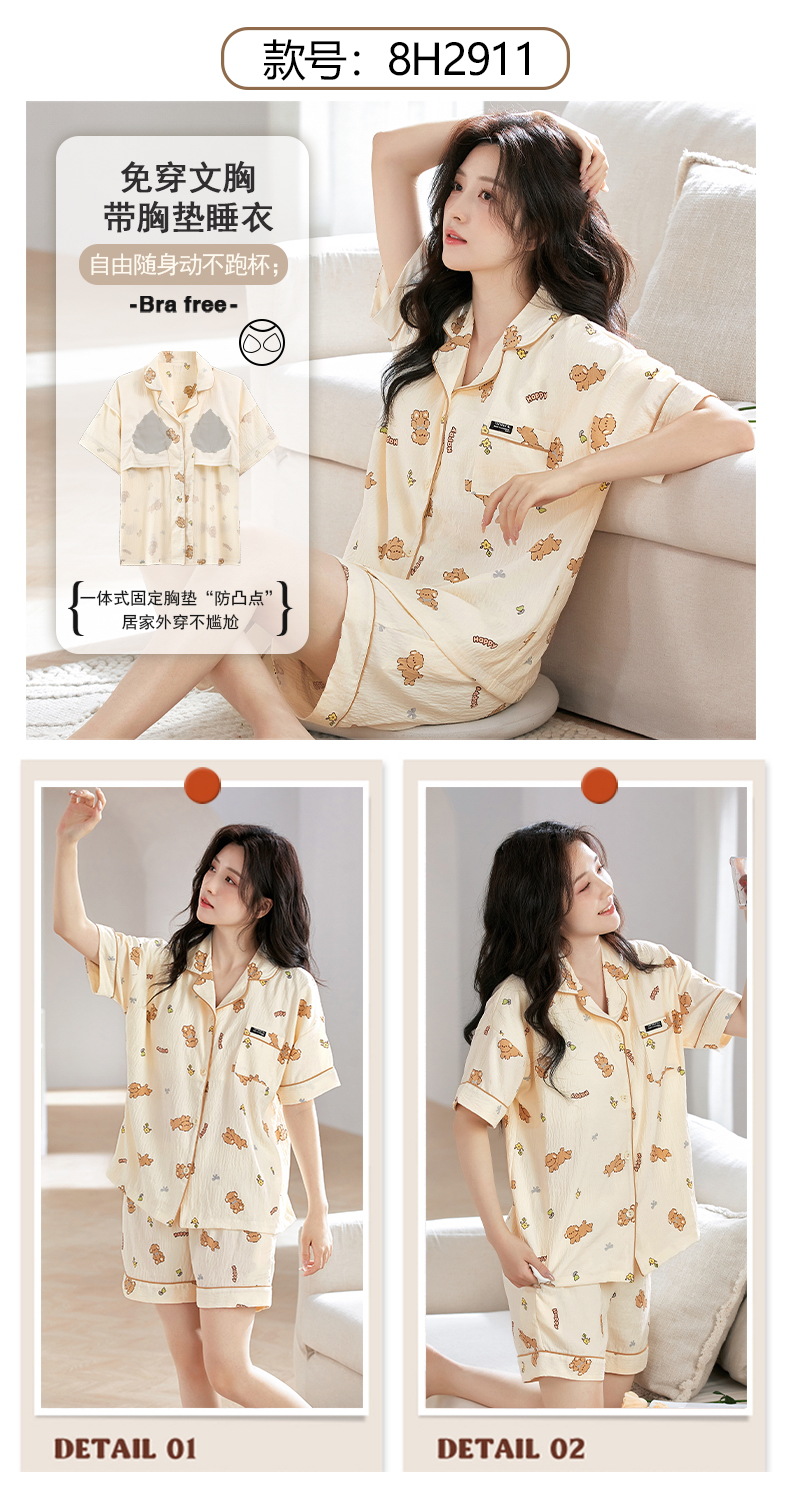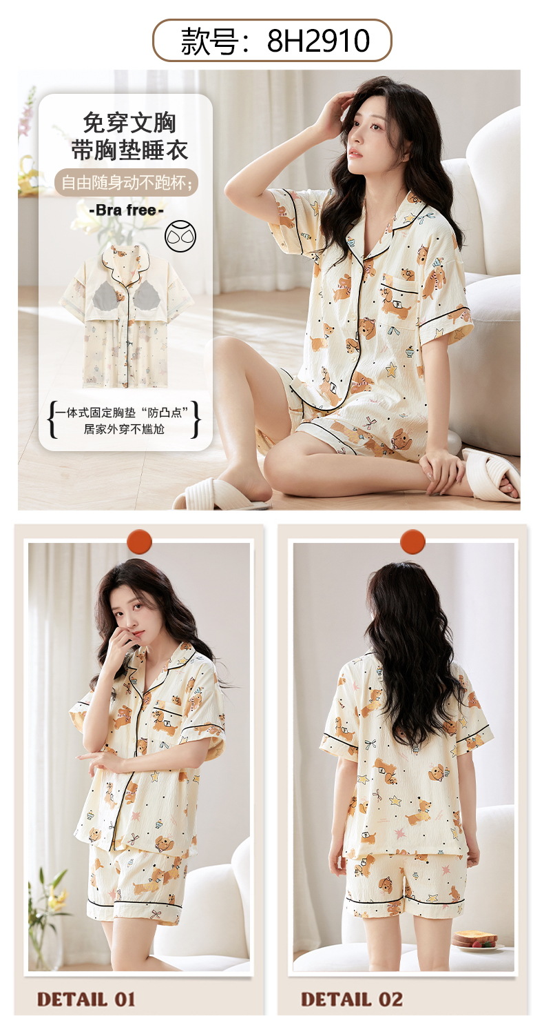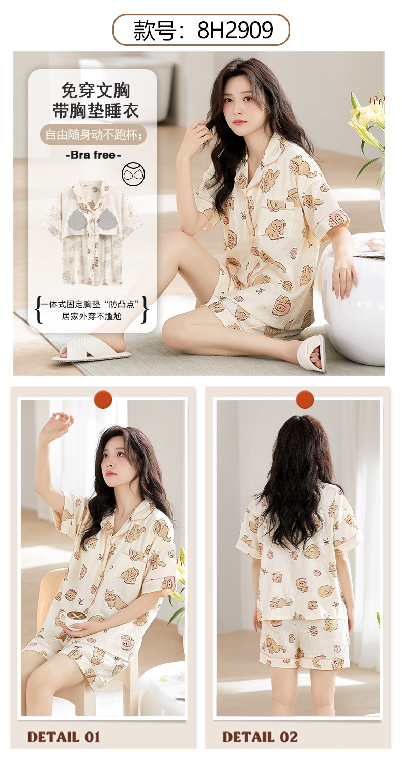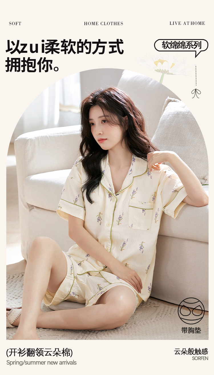 【夏季新款开衫睡衣】云朵棉短袖短裤带胸垫 甜美可爱ins韩版家居服