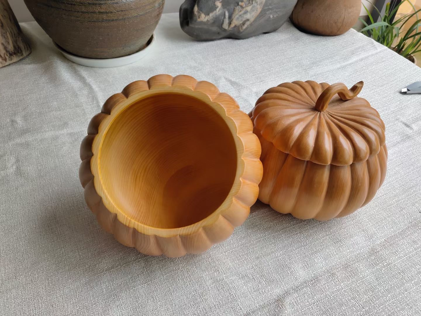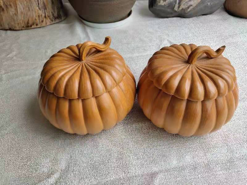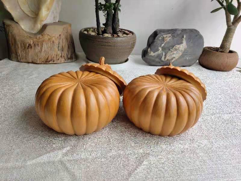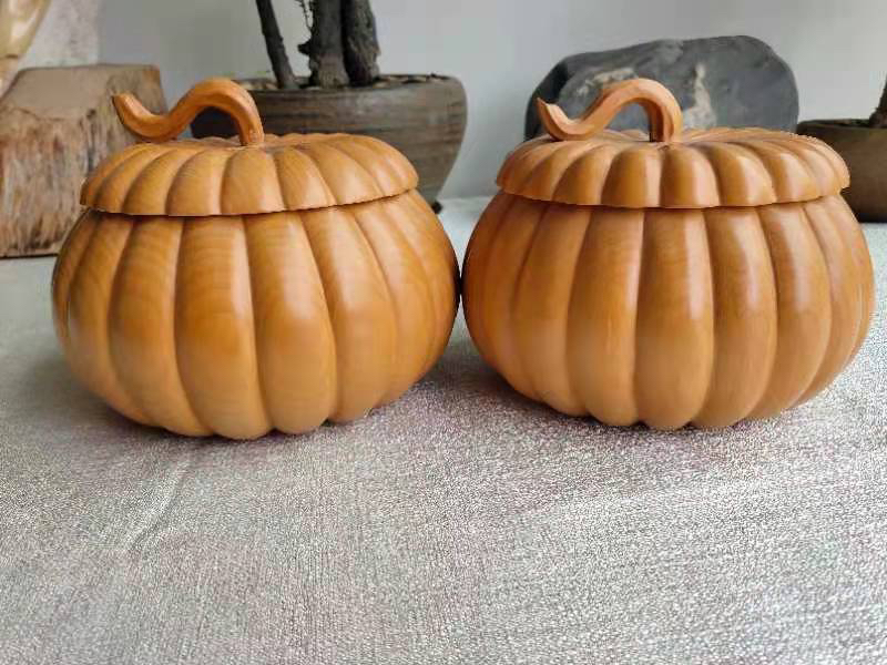 手雕大号本榧南瓜型围棋罐一对