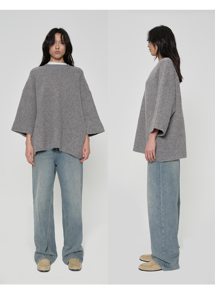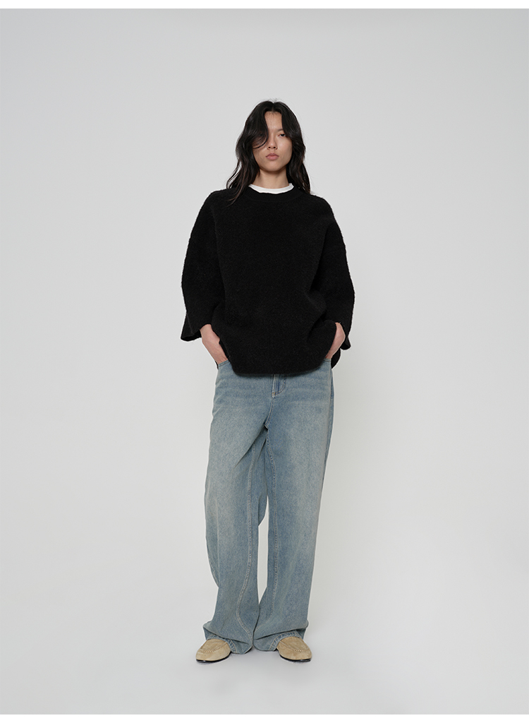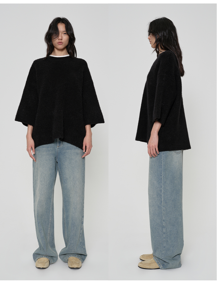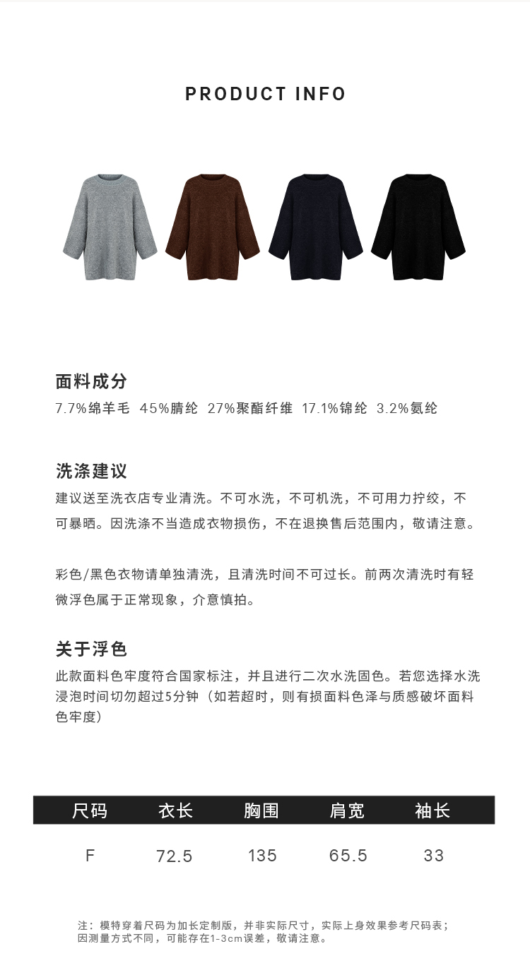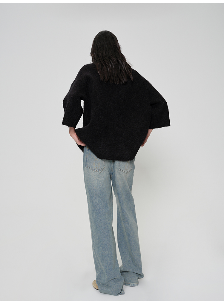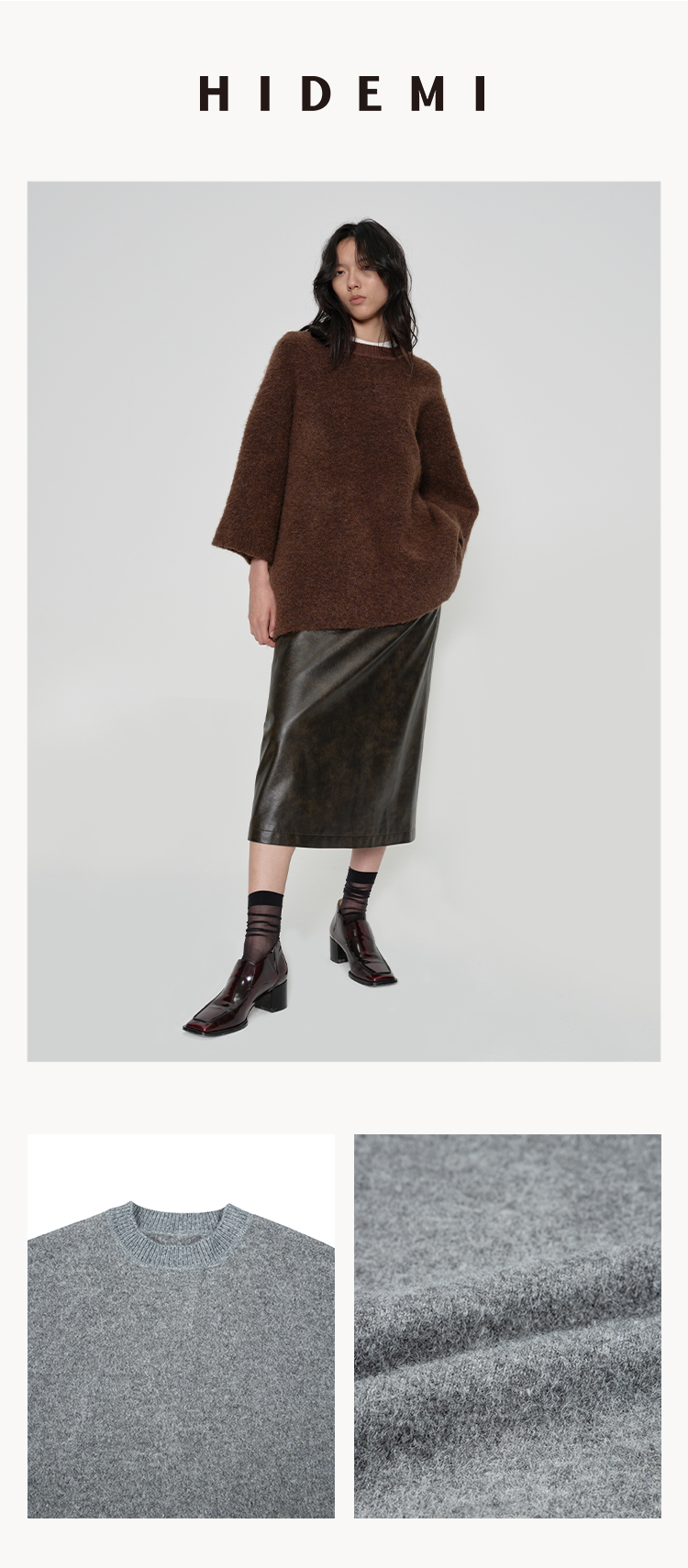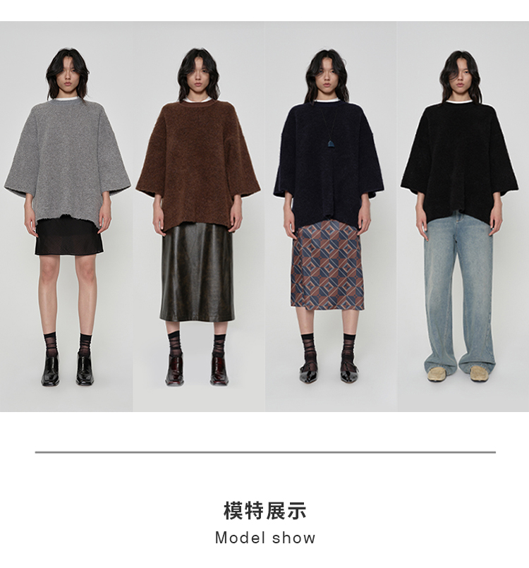 HIDEMI 圆领大廓形落肩加厚款进口强缩混纺羊毛8分袖毛织针织上衣 摩卡色/黑色/烟灰色/藏蓝色