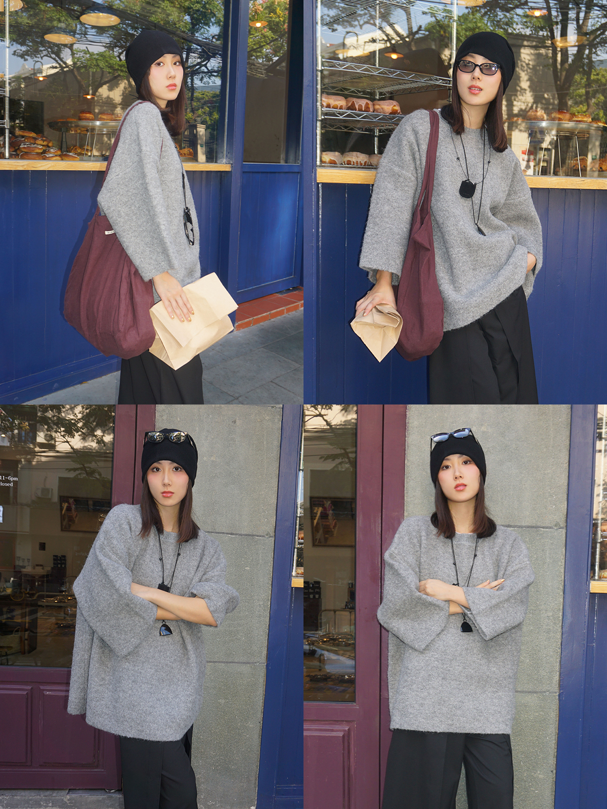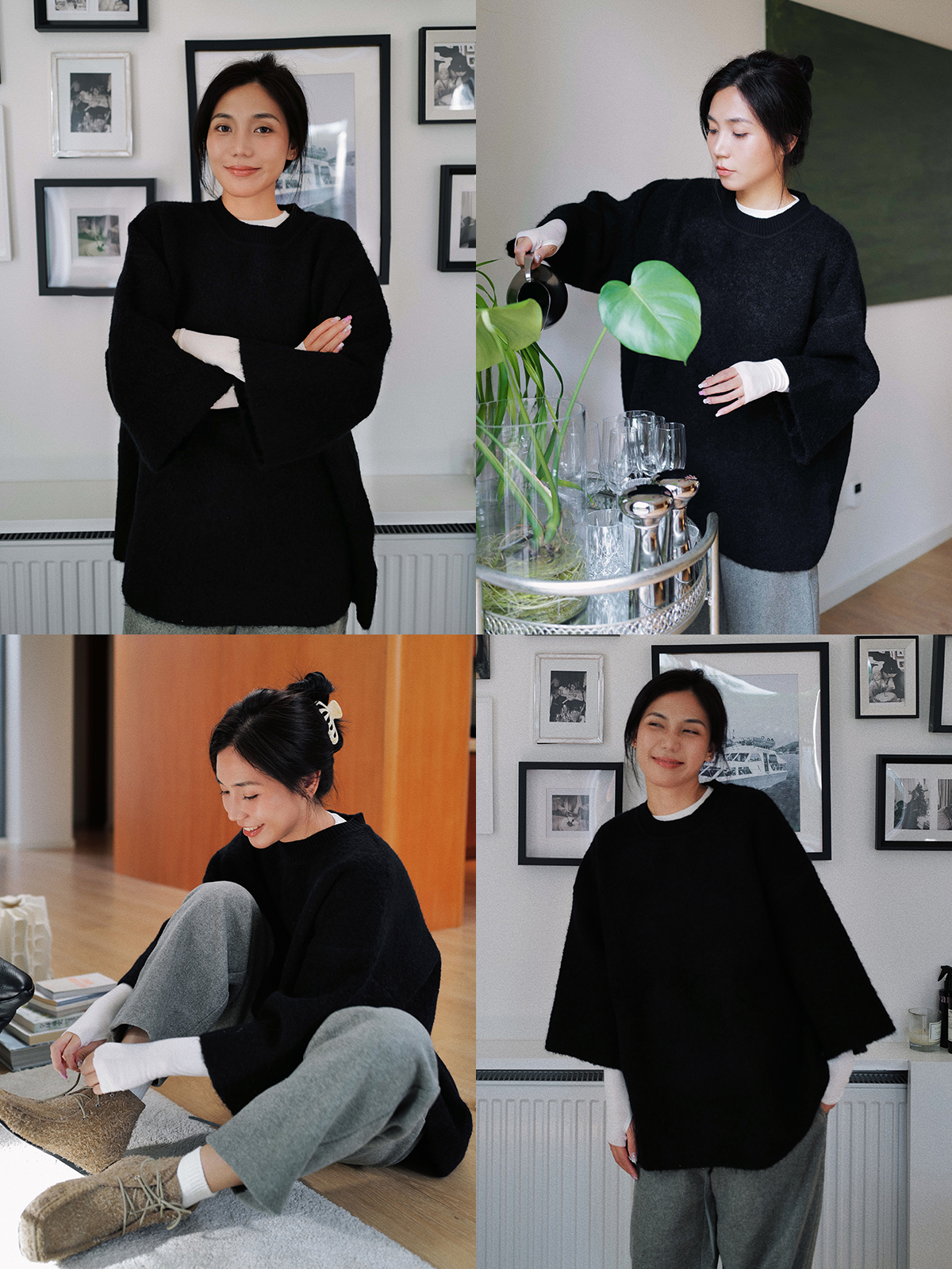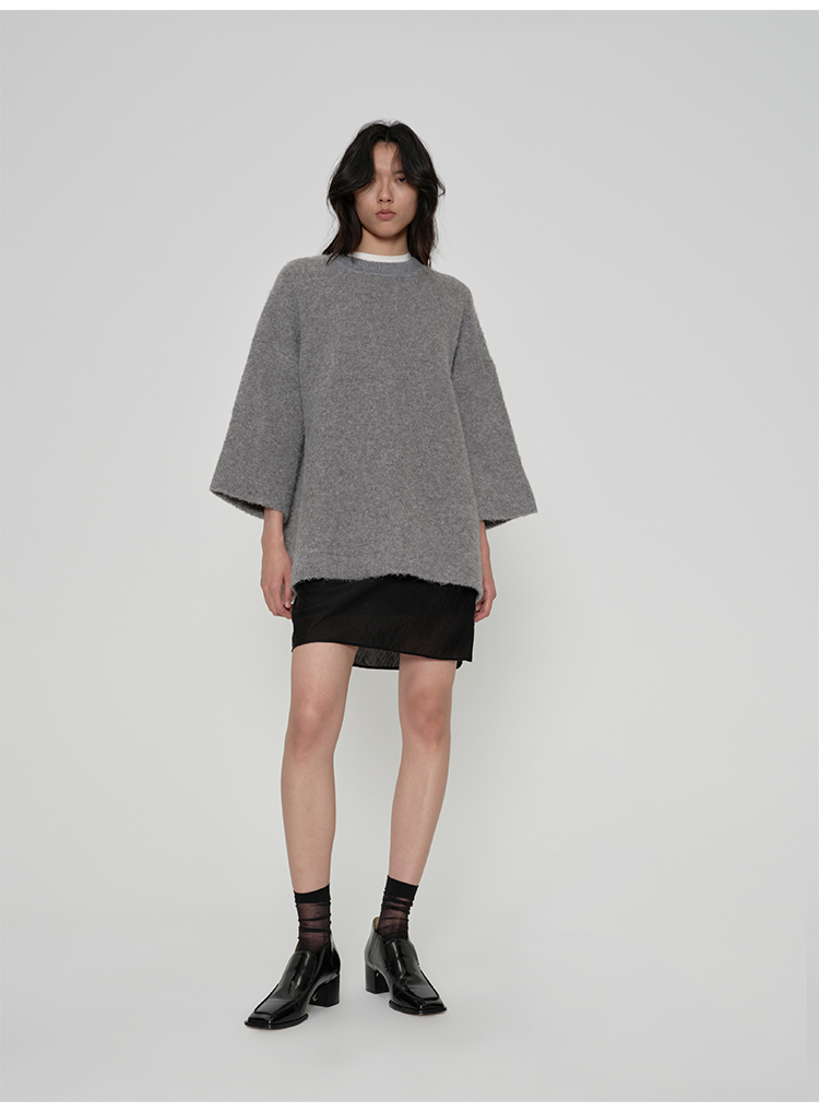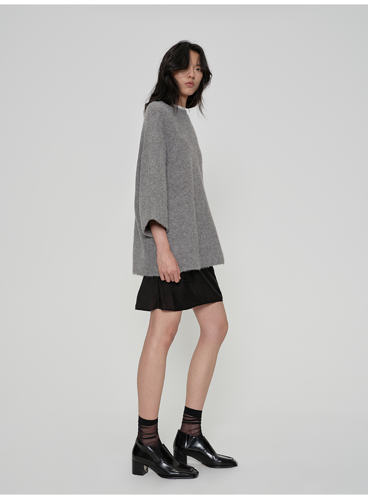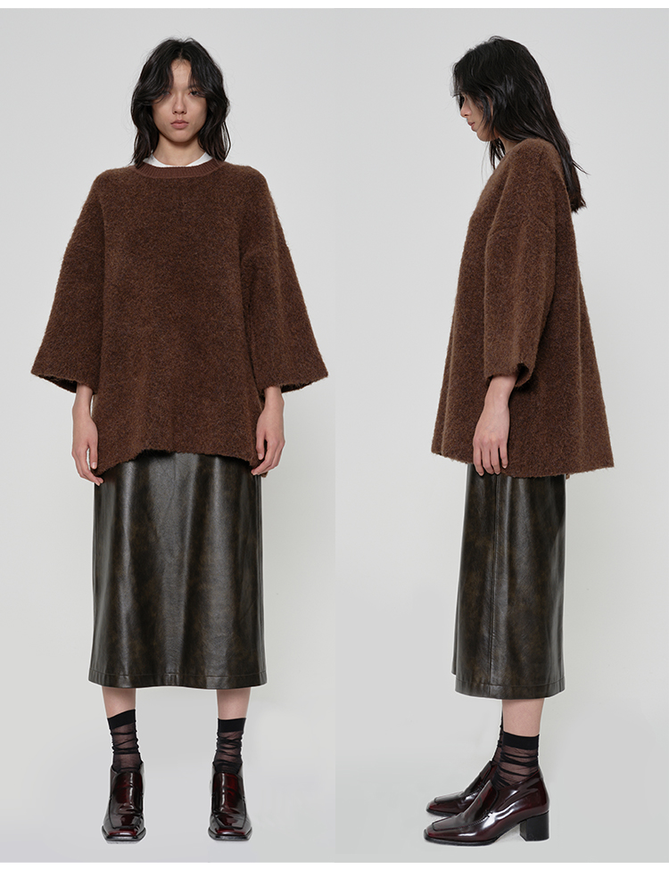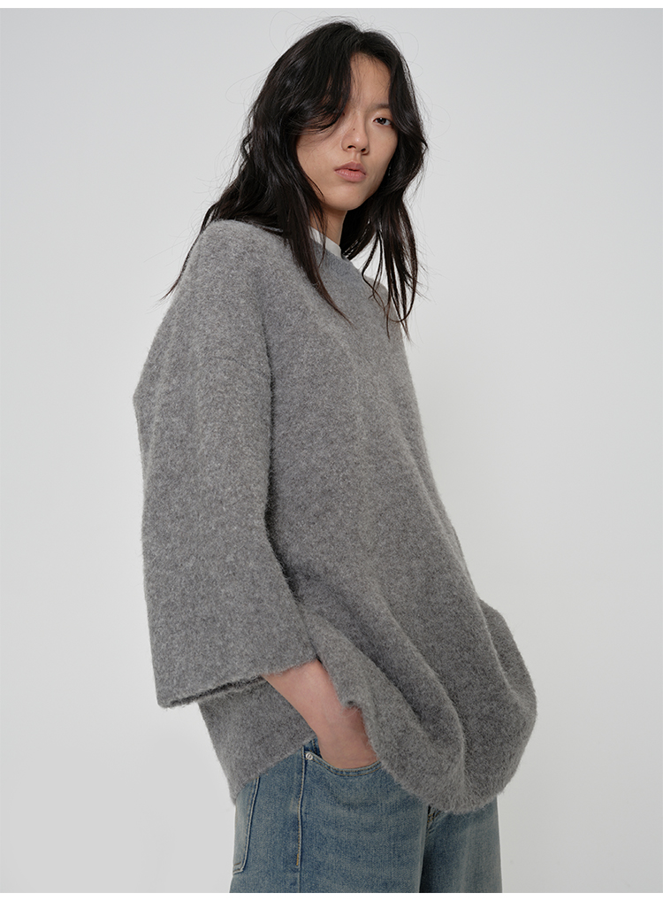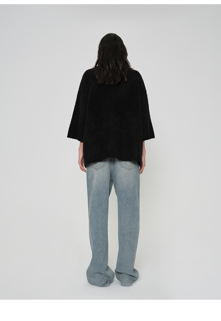 HIDEMI 圆领大廓形落肩加厚款进口强缩混纺羊毛8分袖毛织针织上衣 摩卡色/黑色/烟灰色/藏蓝色