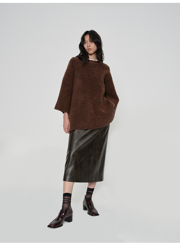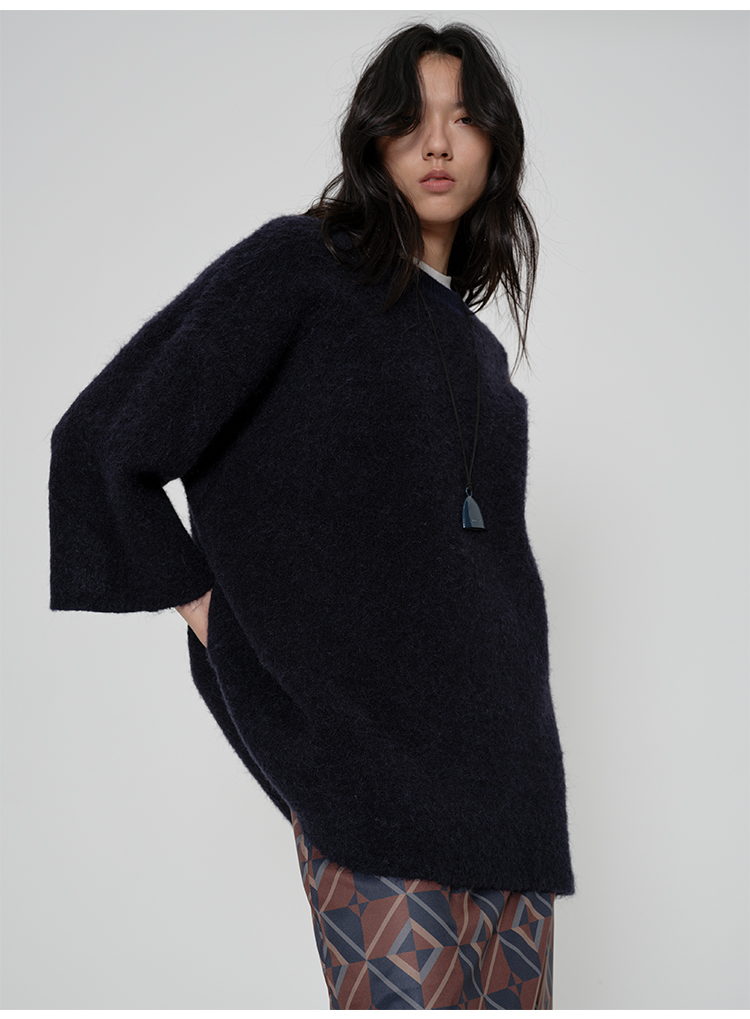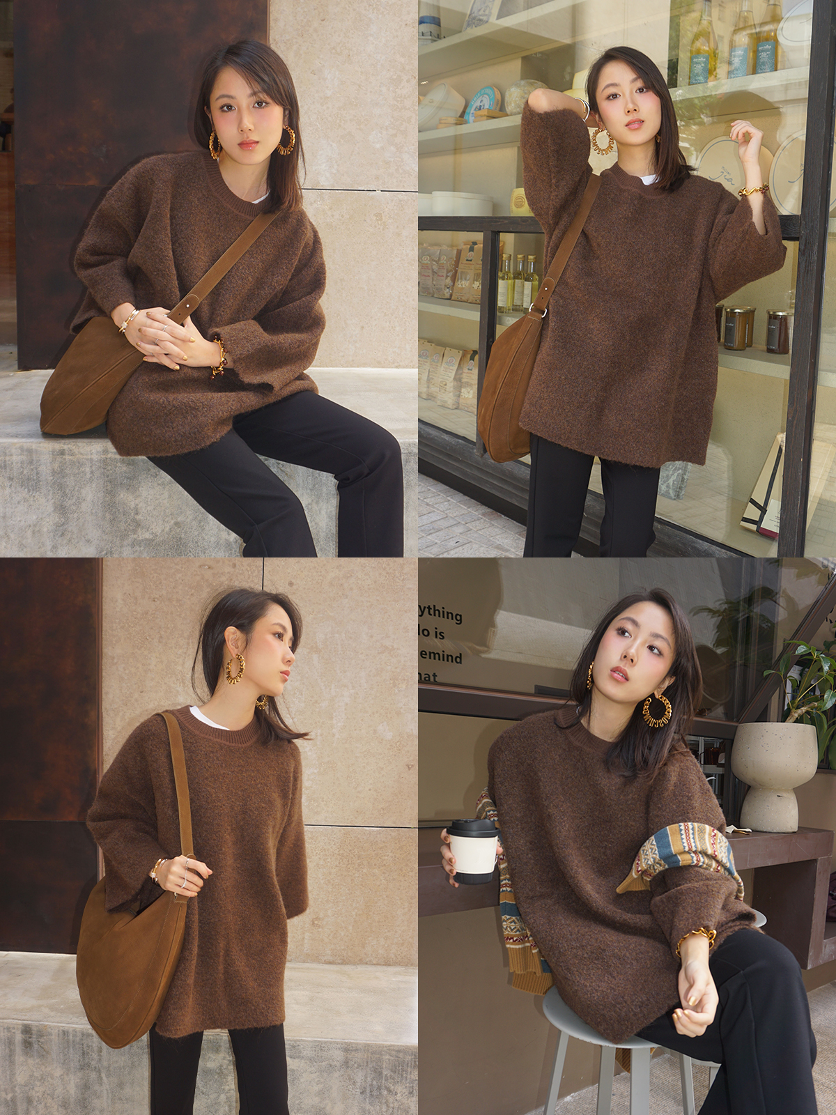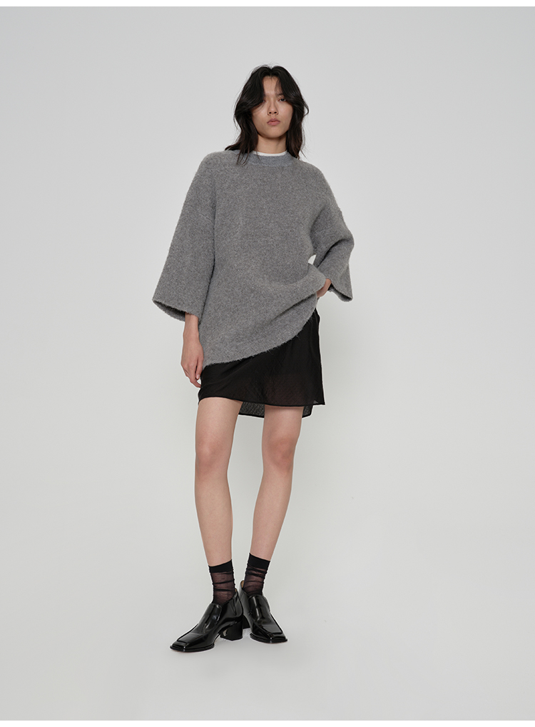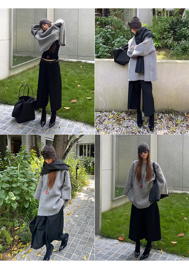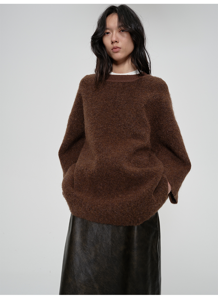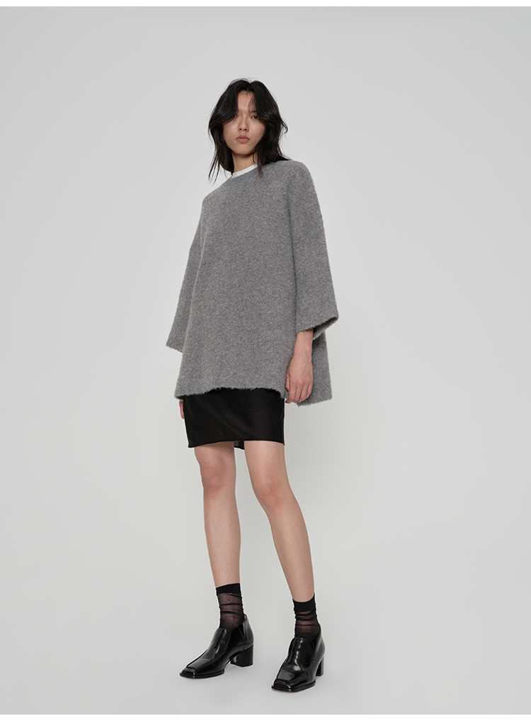 HIDEMI 圆领大廓形落肩加厚款进口强缩混纺羊毛8分袖毛织针织上衣 摩卡色/黑色/烟灰色/藏蓝色