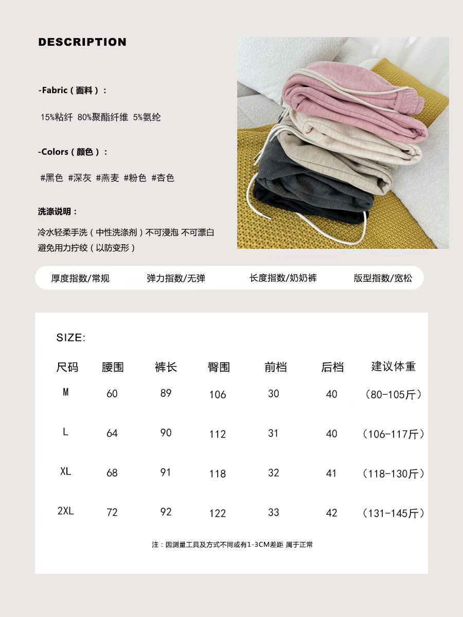 专业级抗皱工艺 耐磨不易起球不易粘毛 抽绳设计,弹力足够大,不勒腰 加宽高腰 遮肉不显胯 不鼓包的舒适触感 轻松解决久坐久蹲带来的变形问题 上身遮肉不挑腿型 不同体型 都能穿显瘦显腿直,显高还敲舒服