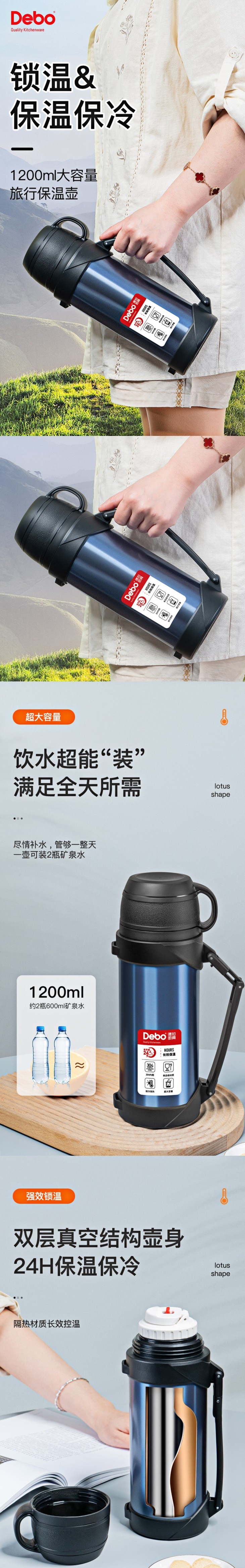 夏天太热了,总感觉有多少水都不够喝 尤其是在户外运动、旅游、野营等活动中 带着一款大容量水壶就格外重要了!! 夏季装冰水可保冰,冬季带热水可保温~ 德铂Debo这款水壶,1200ml超大容量 24小时长效保温保冷,实现喝冰水自由! 简直就是夏日救星!