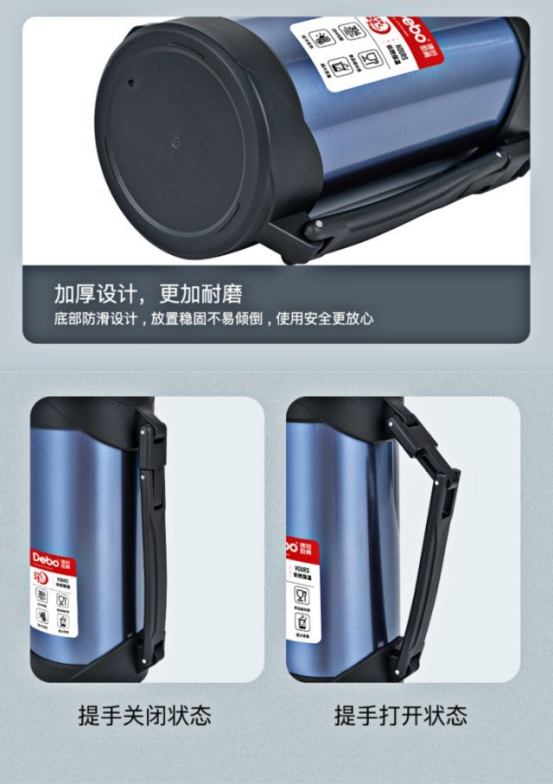 方便携带,户外居家必备单品; 家庭可为保温爆冷水壶,满足随时喝水需求; 户外可作为用水储备, 冲茶、奶粉、喝水需求储备;