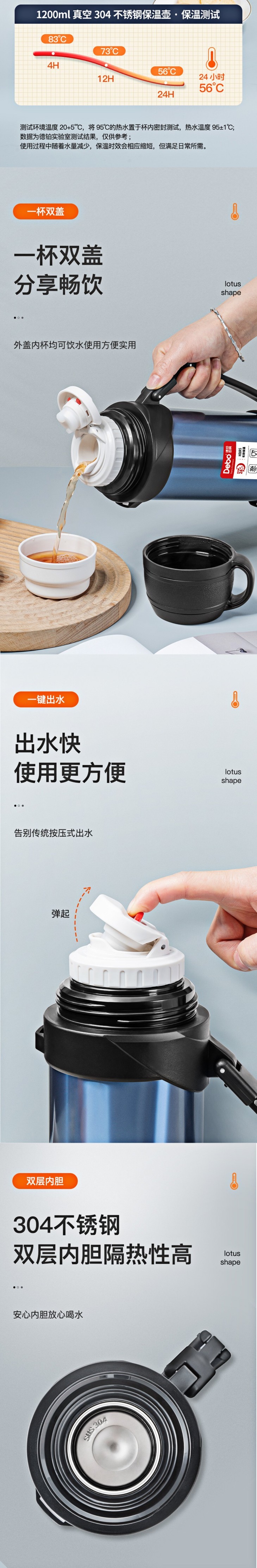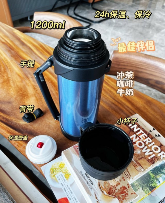 这个东西真的很棒! 学生和上班族必备神器,真的太好用了, 蓝黑配色低调高级。 1200ml大容量水壶是普通水壶的3倍, 性价比极高,一年四季 从绿茶到咖啡 冲茶、咖啡、奶茶、奶粉都是最佳伴侣!