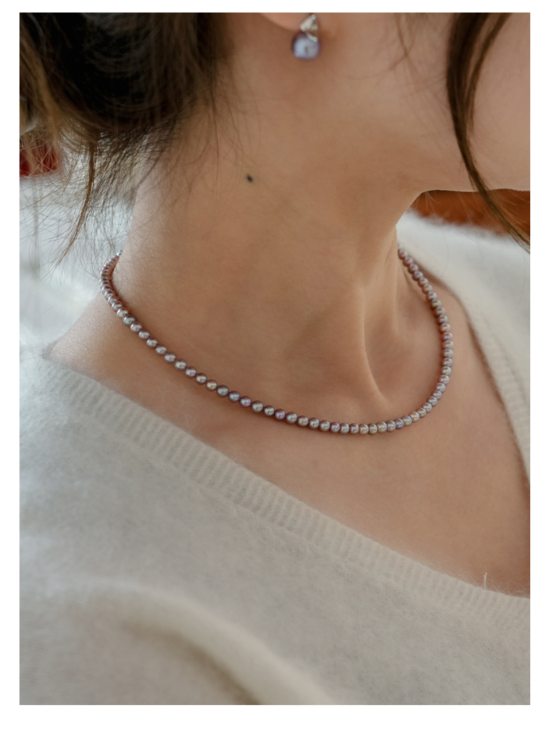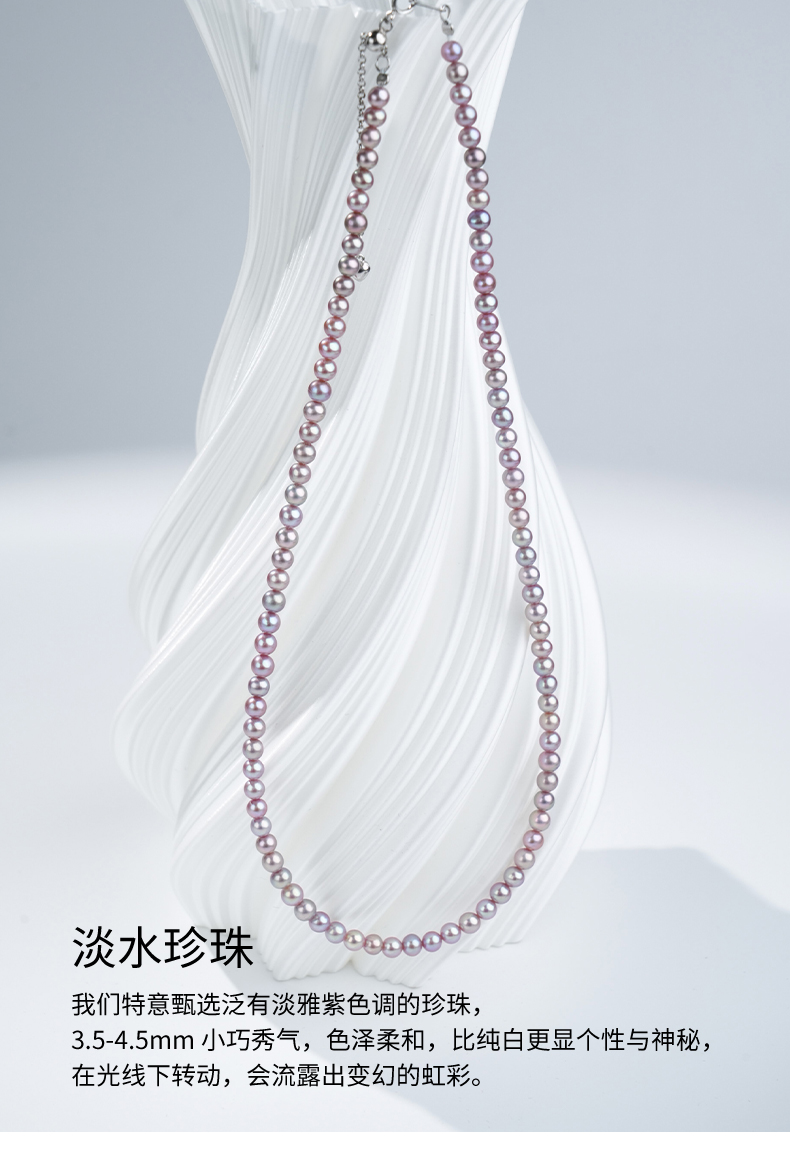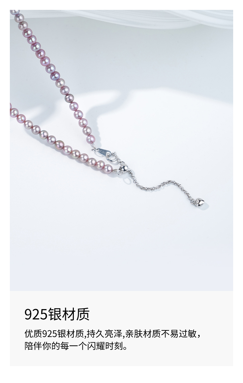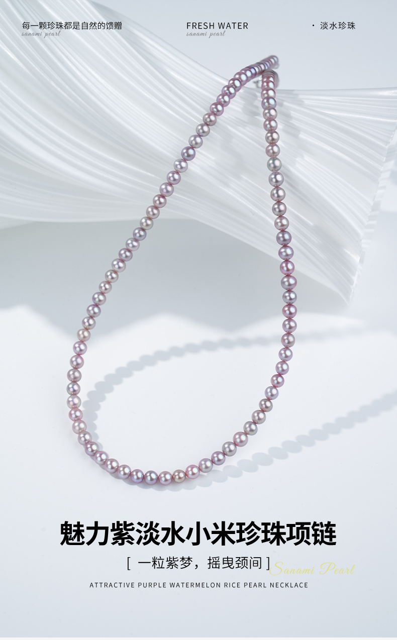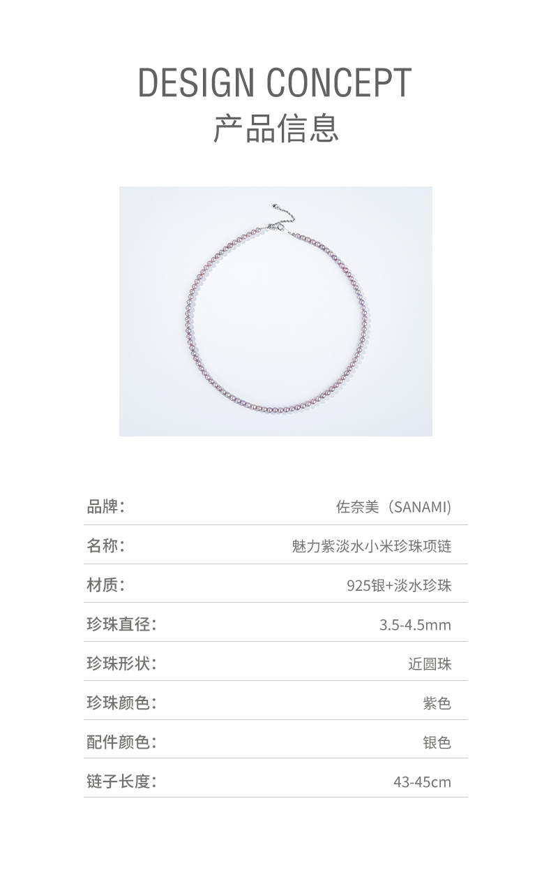佐奈美(SANAMI) 魅力紫淡水小米珍珠项链,选用925银打造,搭配3.5-4.5mm近圆形紫色淡水珍珠,散发自然柔和光泽。