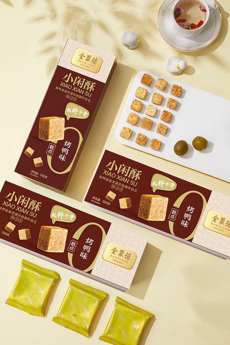 全聚德小闲酥(烤鸭味),4盒装,非遗原料入酥,酥而不腻的口感、香味浓郁,回味无穷,老字号品牌,配料干净,营养丰富,适合各年龄段人群,大品牌,质量有保证,送礼有面子M
