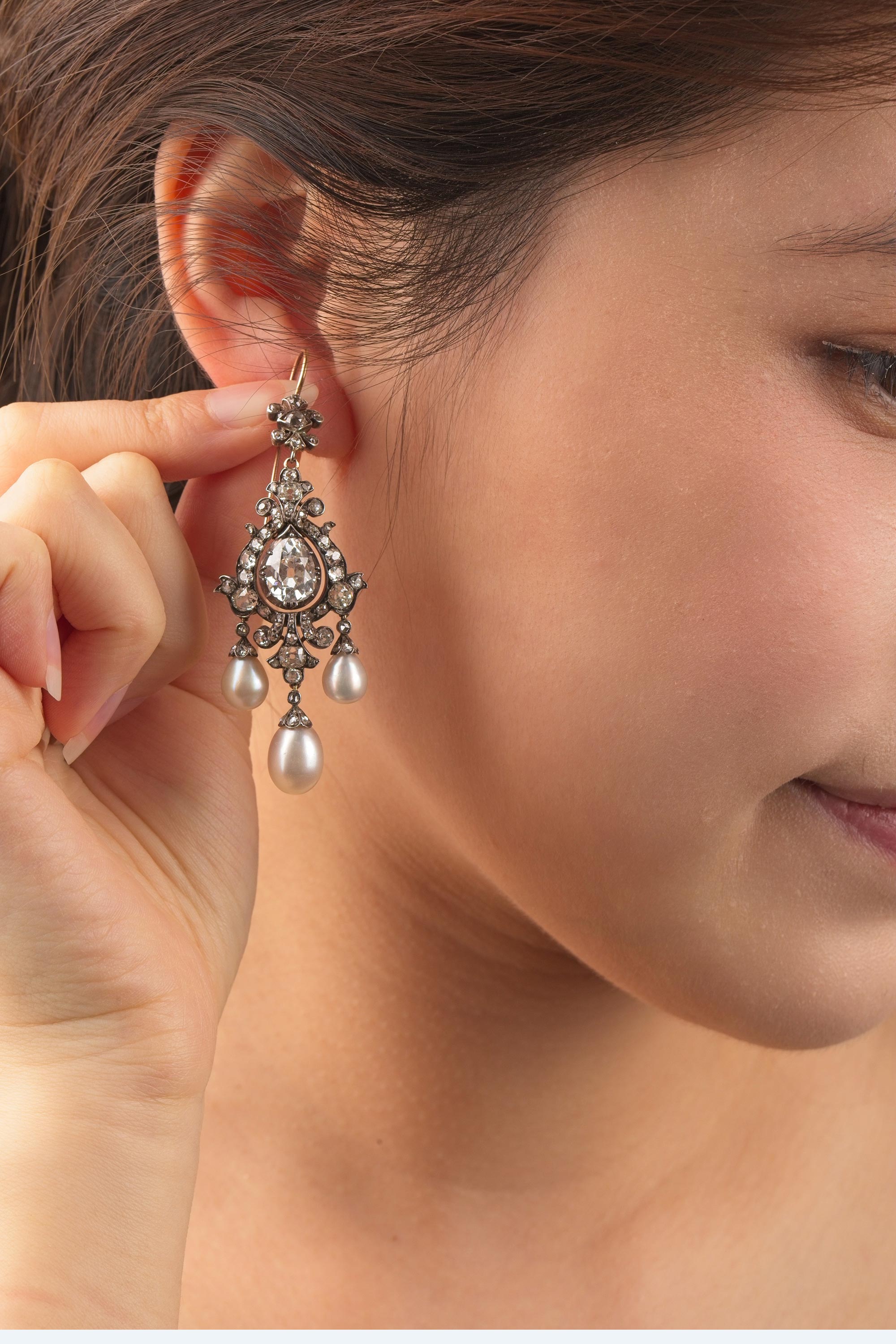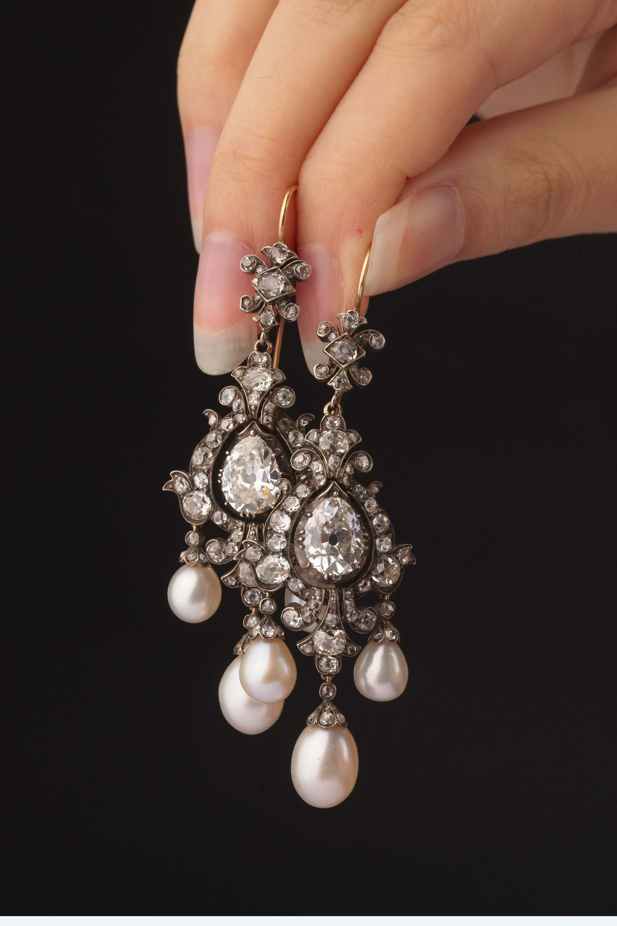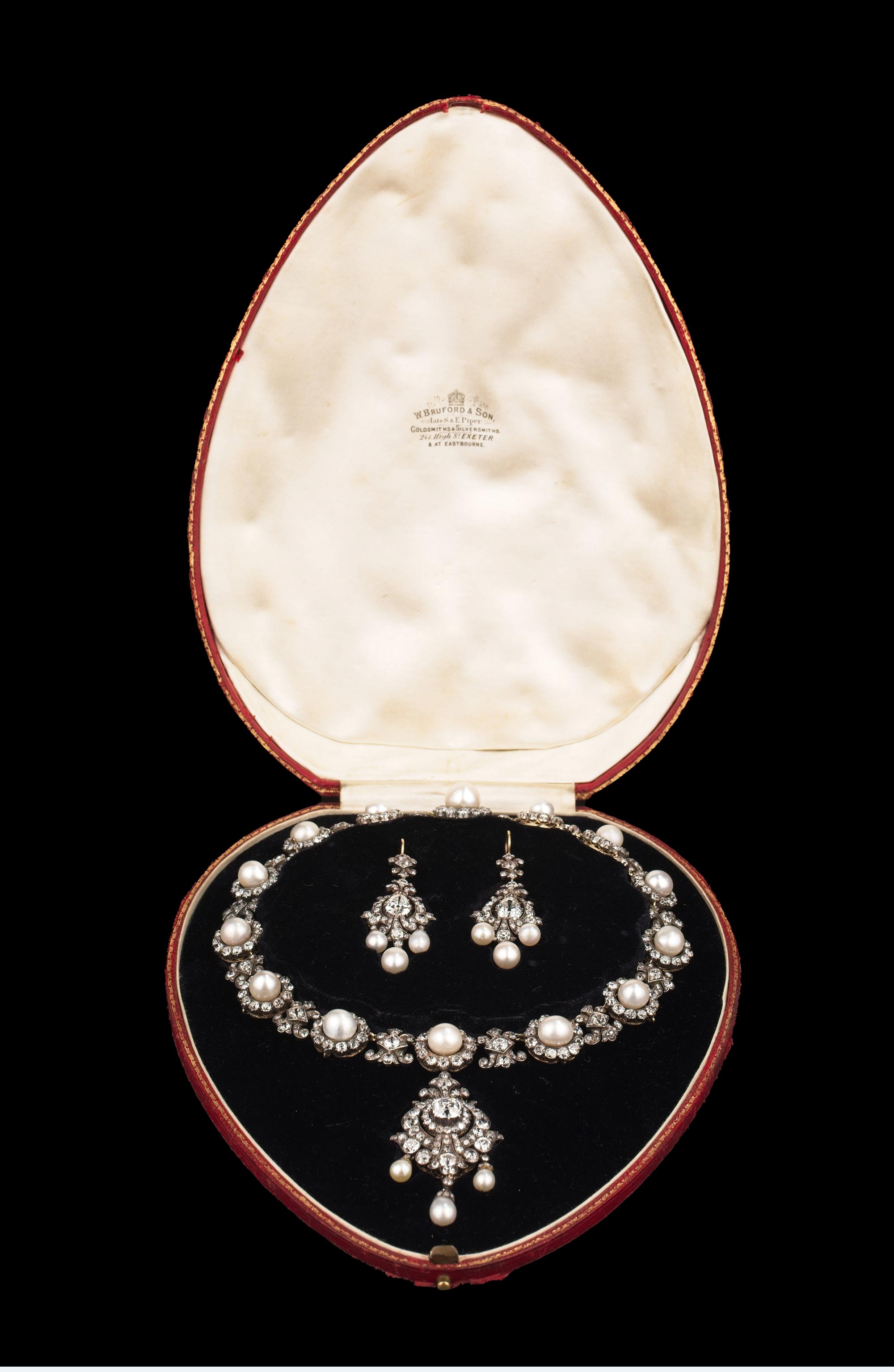 19世纪英国出品花簇流苏造型黄金底纯银镶嵌钻石与天然海水珍珠吊坠项链及耳环套件 带原盒