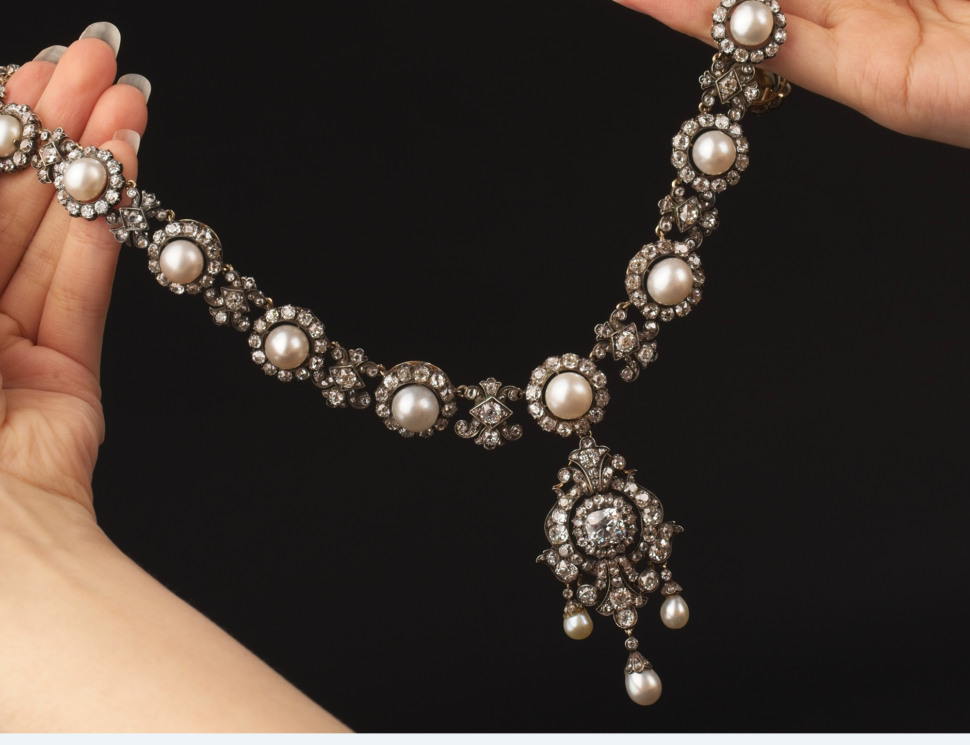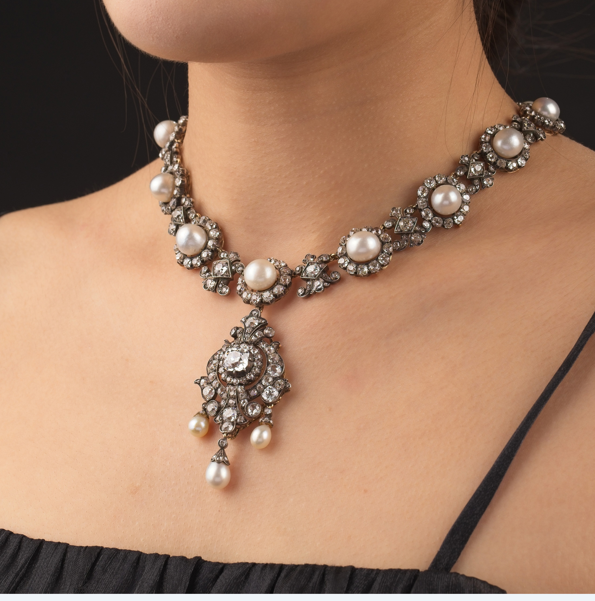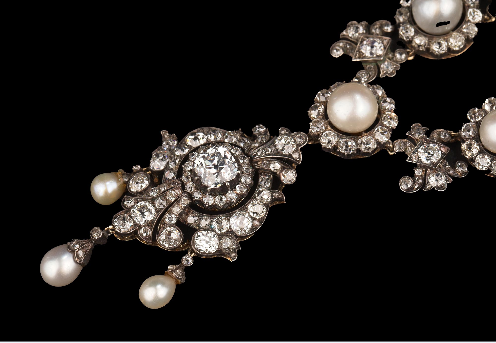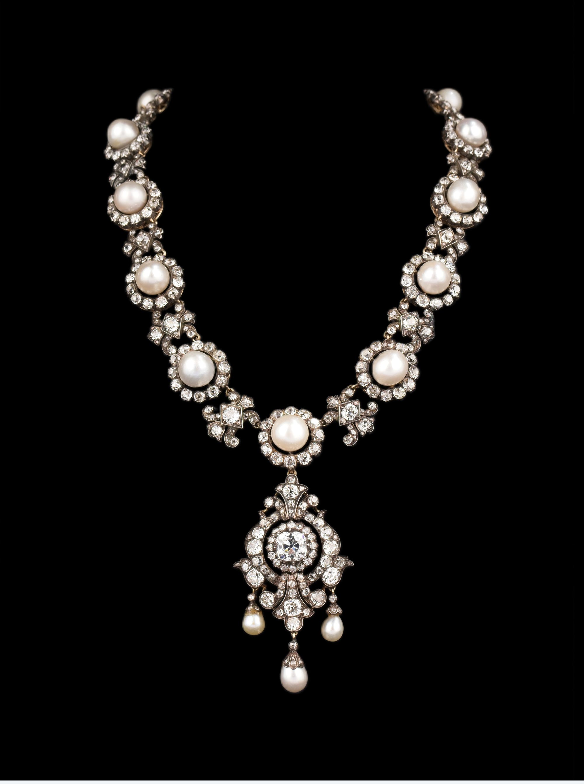 独角鹿西洋古董19世纪英国出品花簇流苏造型黄金底纯银镶嵌钻石与天然海水珍珠吊坠项链及耳环套件 带原盒