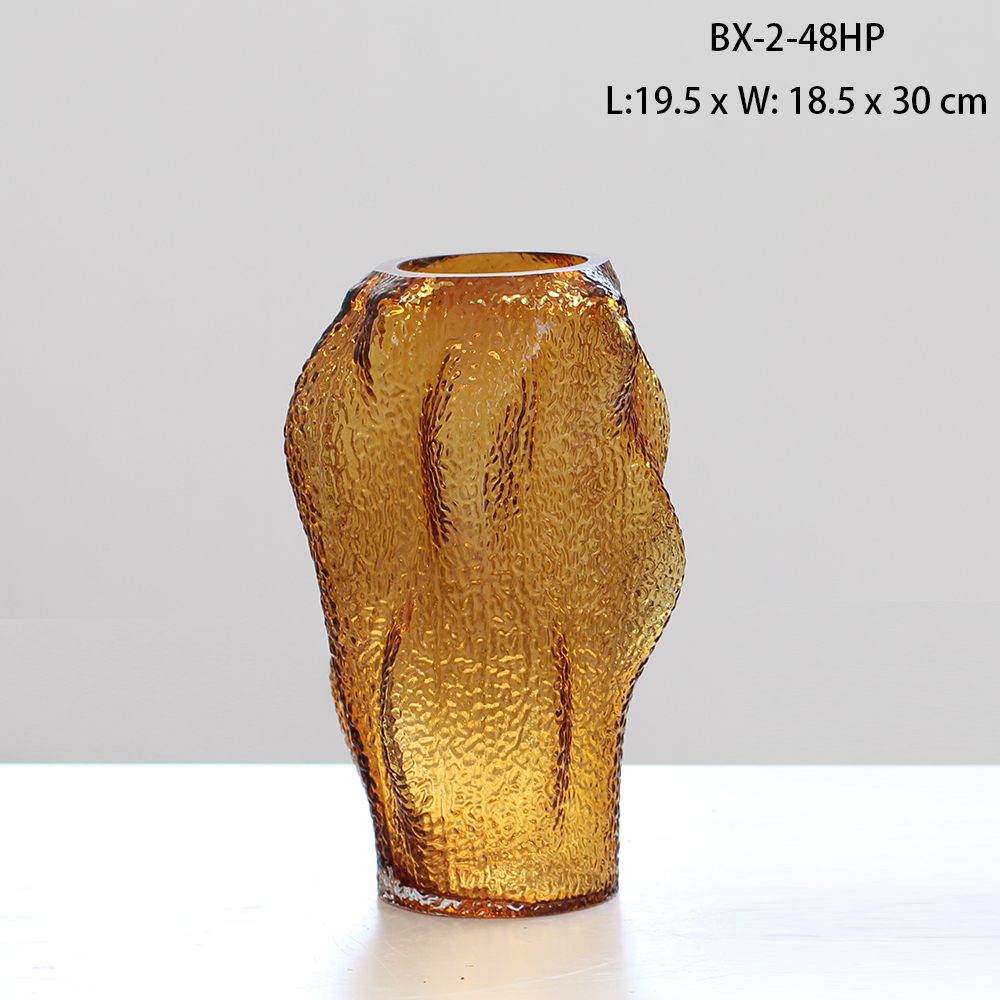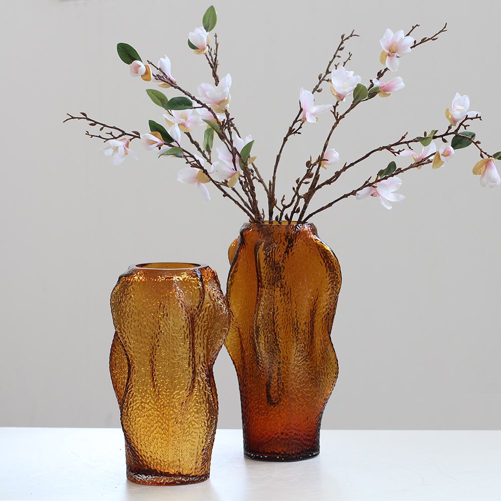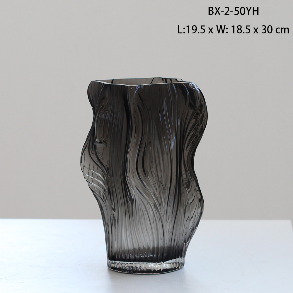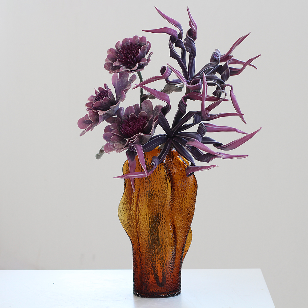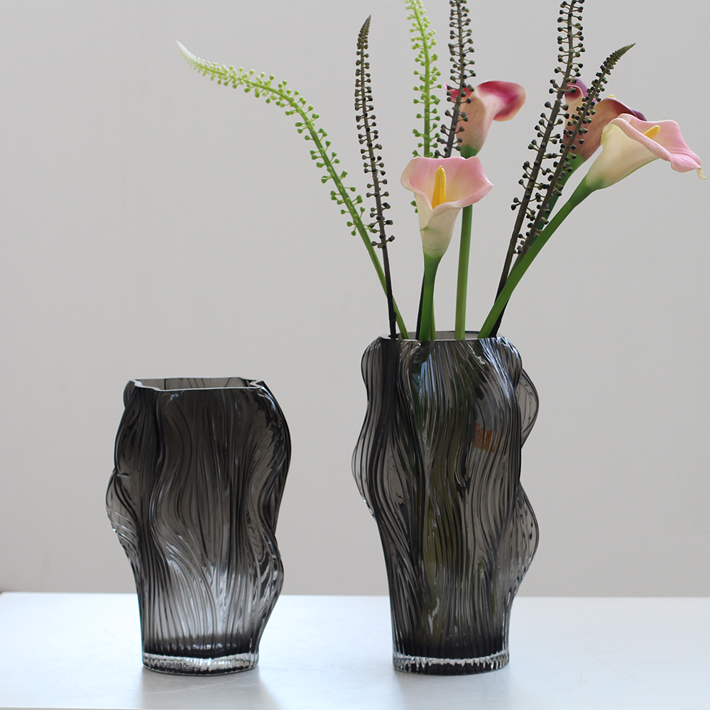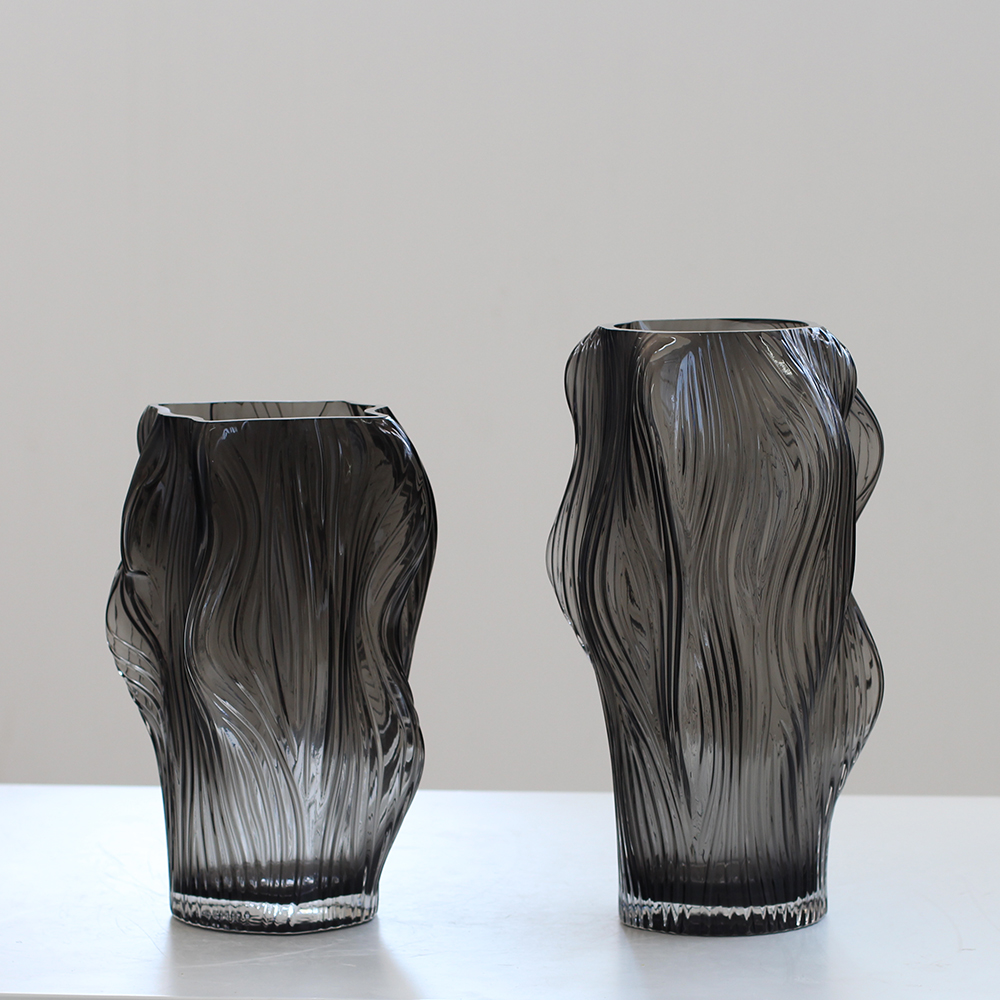 西班牙设计师经典款轻奢烟熏灰叶子造型浮雕纹理玻璃花瓶软装花器