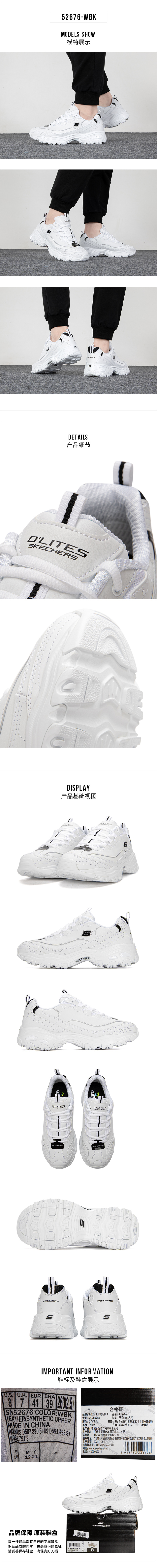 Skechers斯凯奇官方 厚底小白鞋男女情侣款复古透气休闲运动鞋52676-WBK