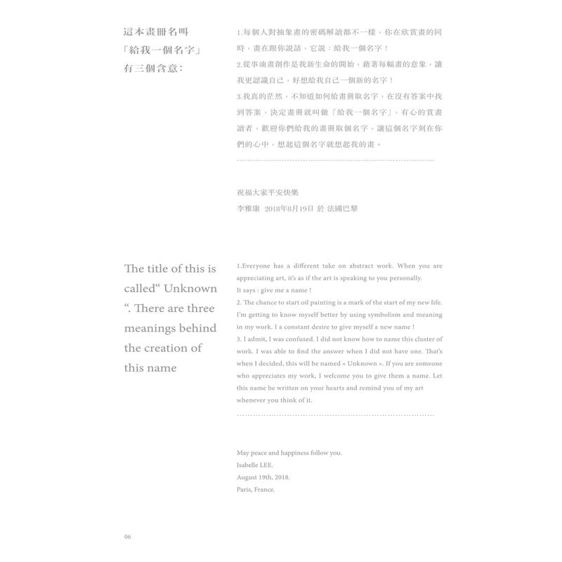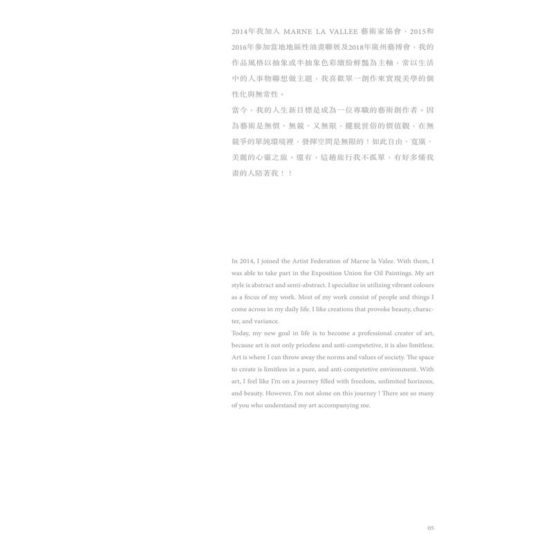 《 給我一個名字》作者加入Marne la Valée 藝術家協會,2015和2016年參加當地地區性油畫聯展,作品風格以抽象或半抽象色彩繽紛鮮豔為主軸,常以生活中的人事物聯想做主題,喜歡單一創作來實現美學的個性化與無常性。