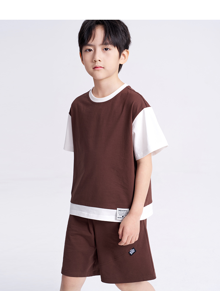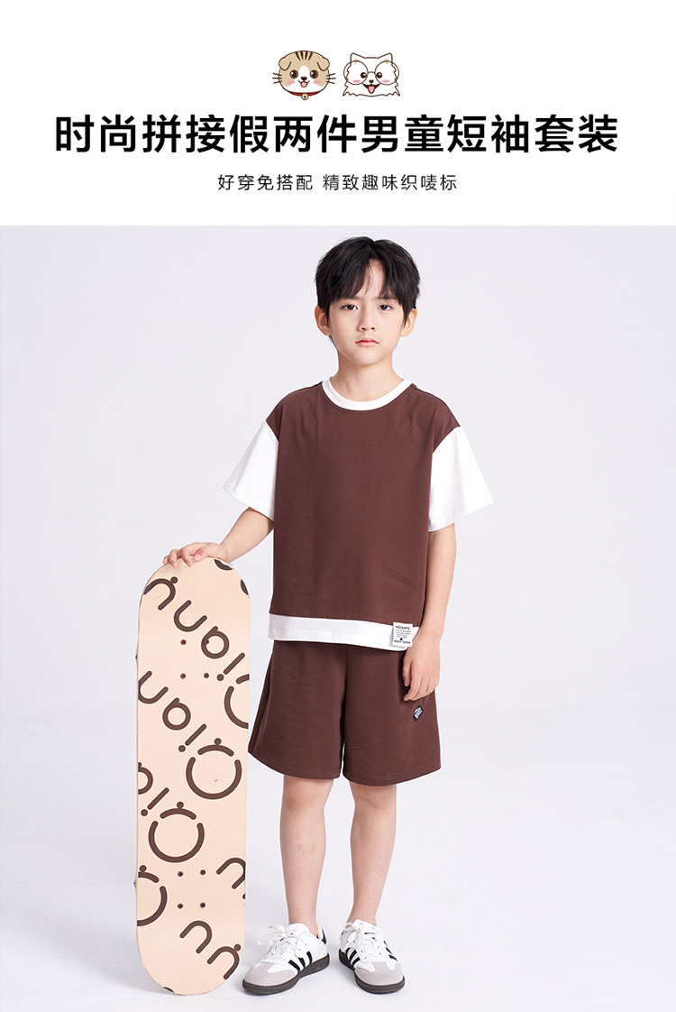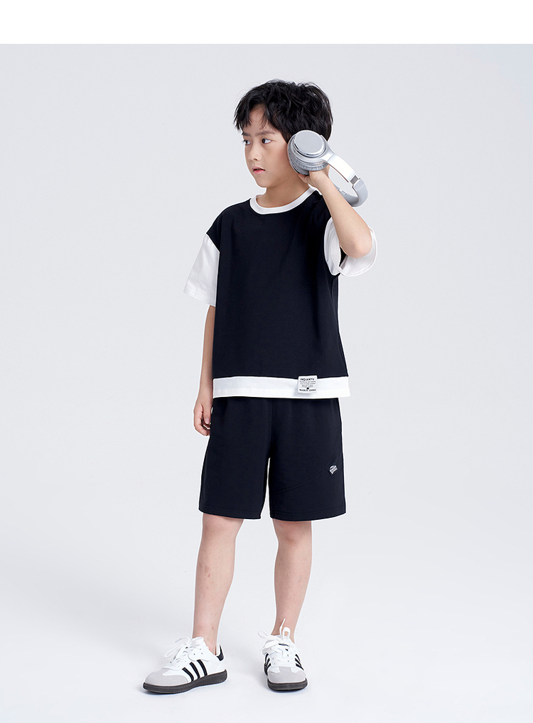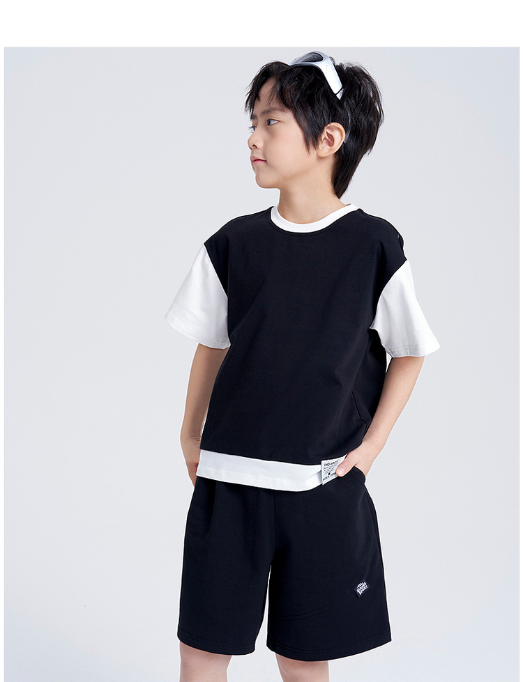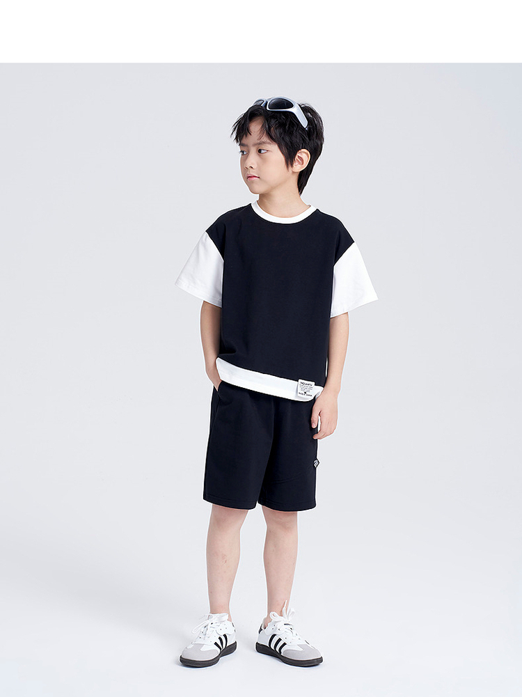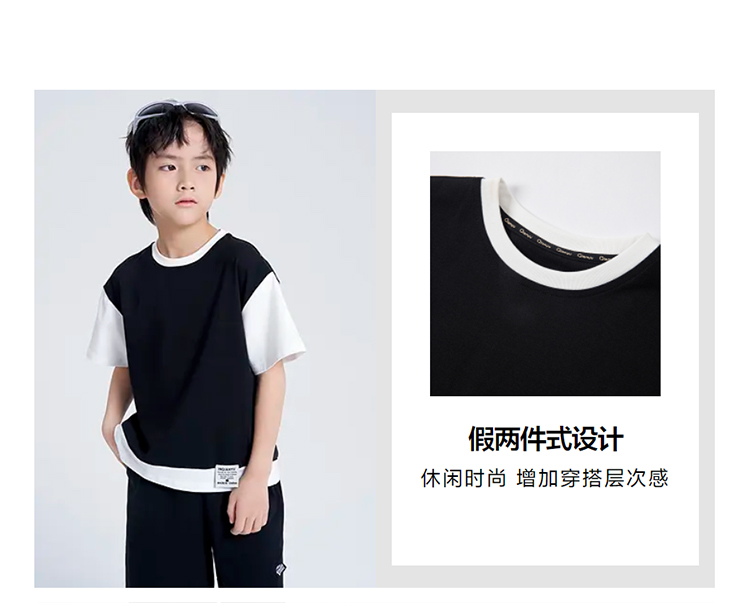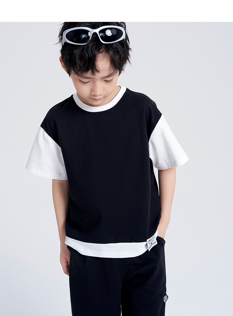 笛莎千与2025夏新款男童时尚拼接假两件男童短袖套装