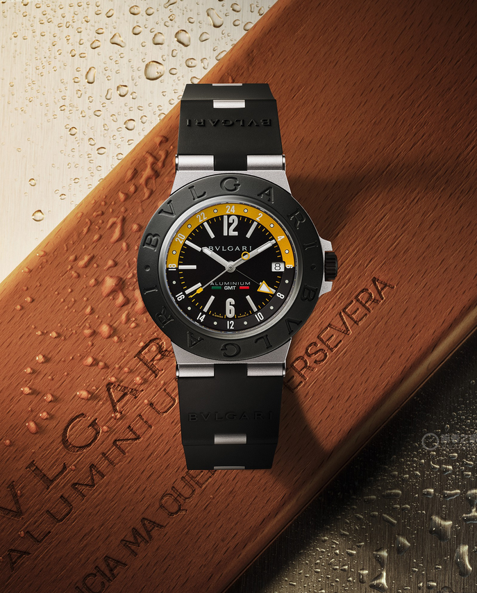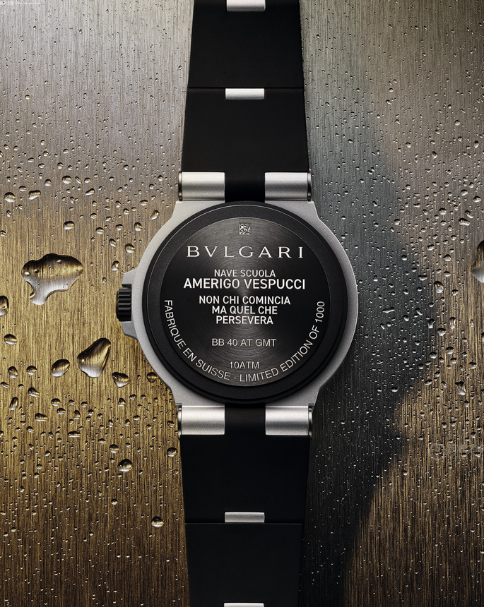 镜面 材质 | 蓝宝石水晶玻璃 | 表盘 | 铝钛金属表壳 带“Aluminium GMT”字样的黑色表盘;镀铑时标,时针与分针覆以Super-LumiNova夜光涂层;黄色镀铑秒针;24小时刻度圈位于表盘外缘,以黑色和黄色显示,箭头形GMT(两地时)指针覆以Super-LumiNova夜光涂层 黑色橡胶表圈,DLC涂层钛金属表冠 密底,镌刻训练舰名“Nave Scuola Amerigo Vespucci”及其格言的黑色DLC涂层钛金属表背 |