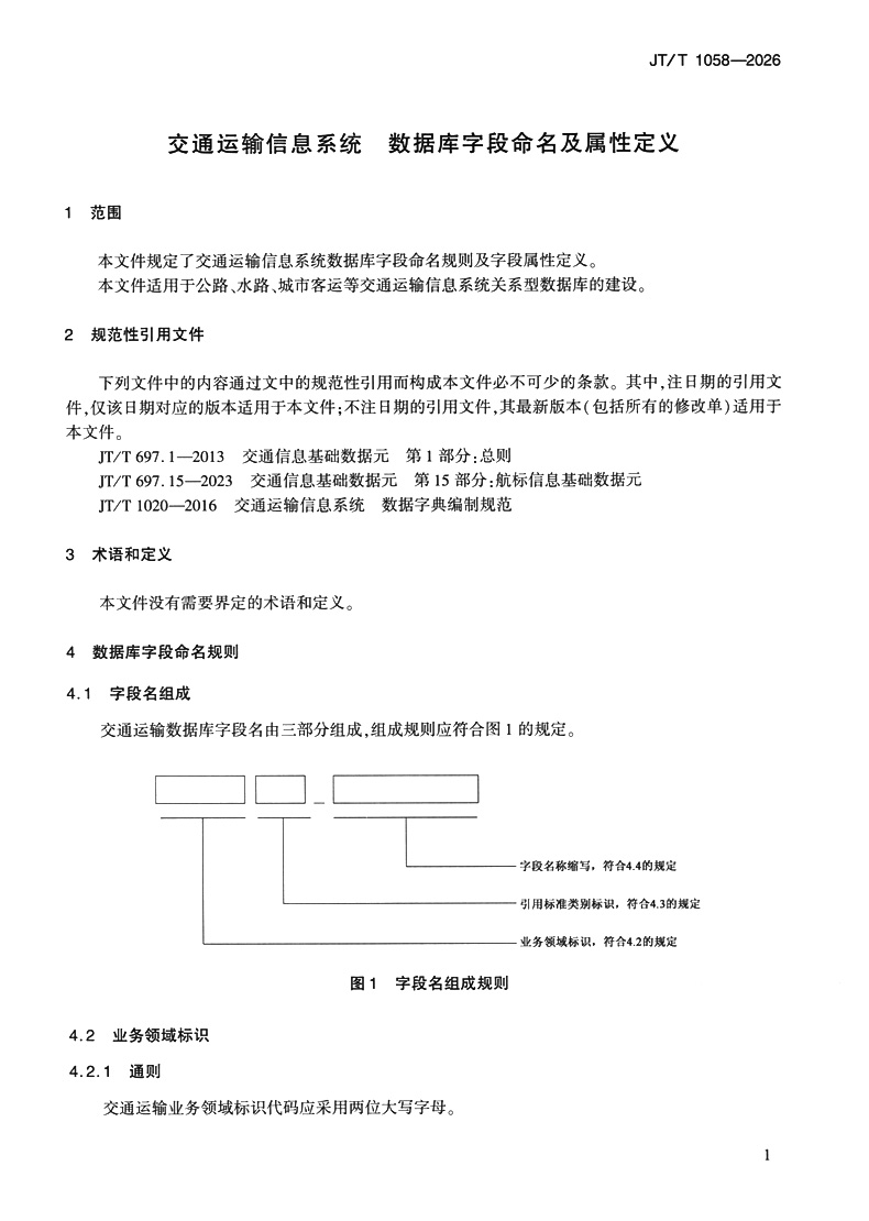 交通运输信息系统 数据库字段命名及属性定义(JT/T 1058—2026)