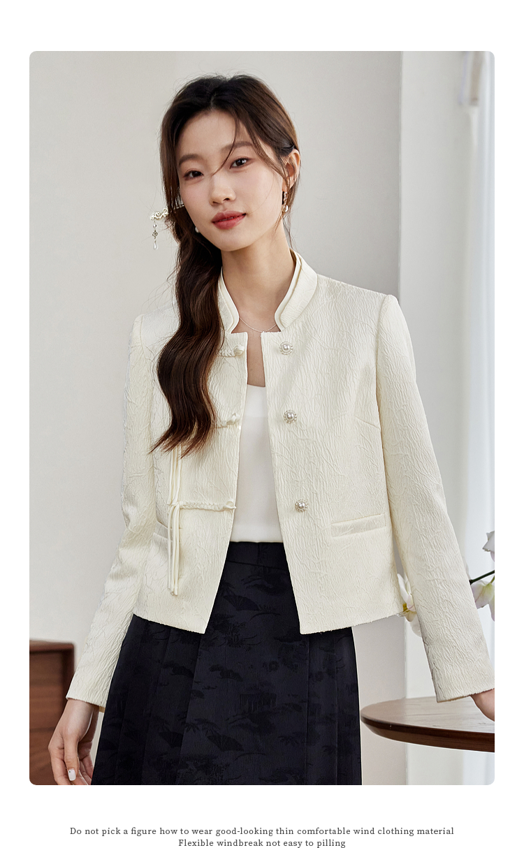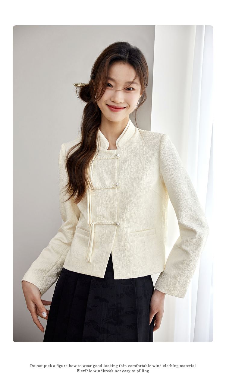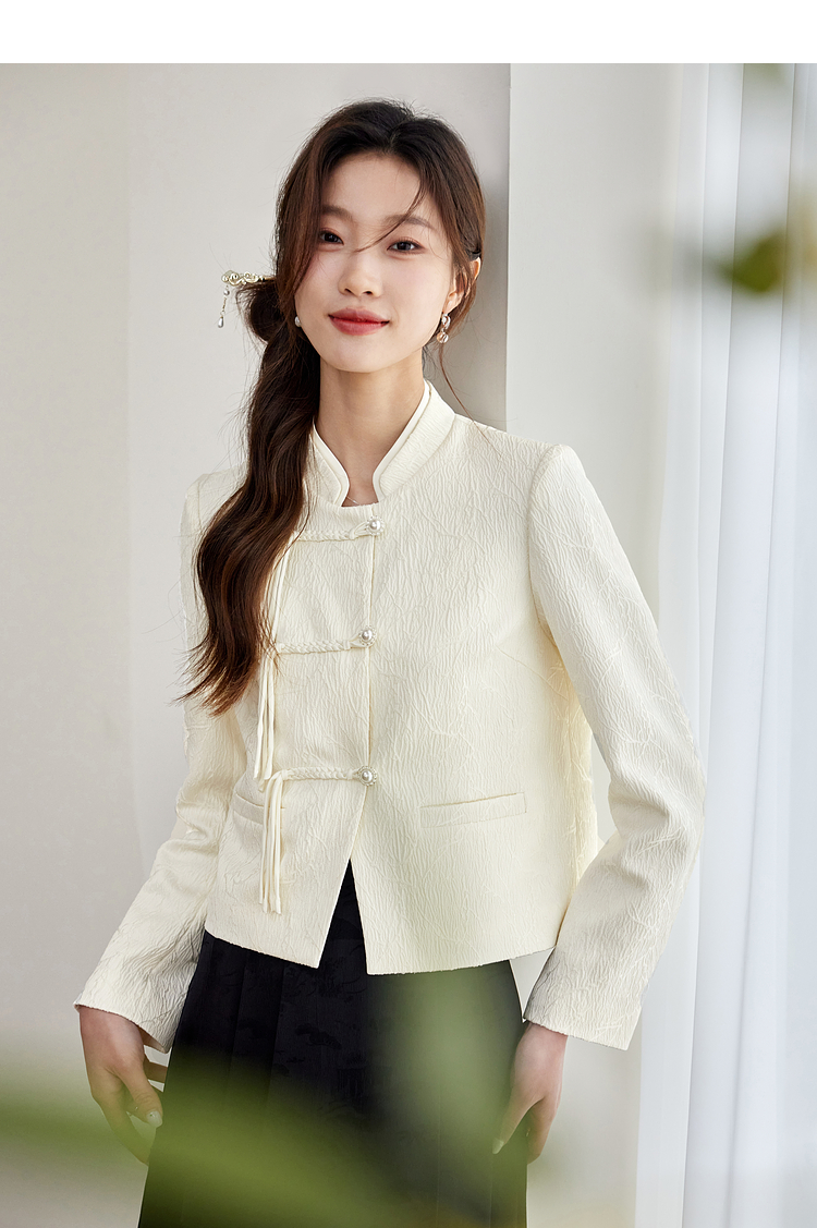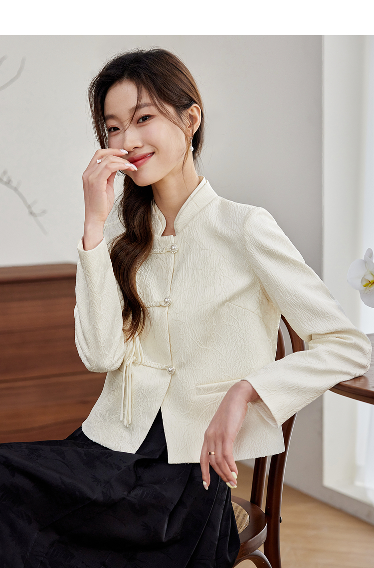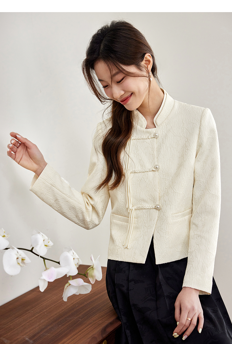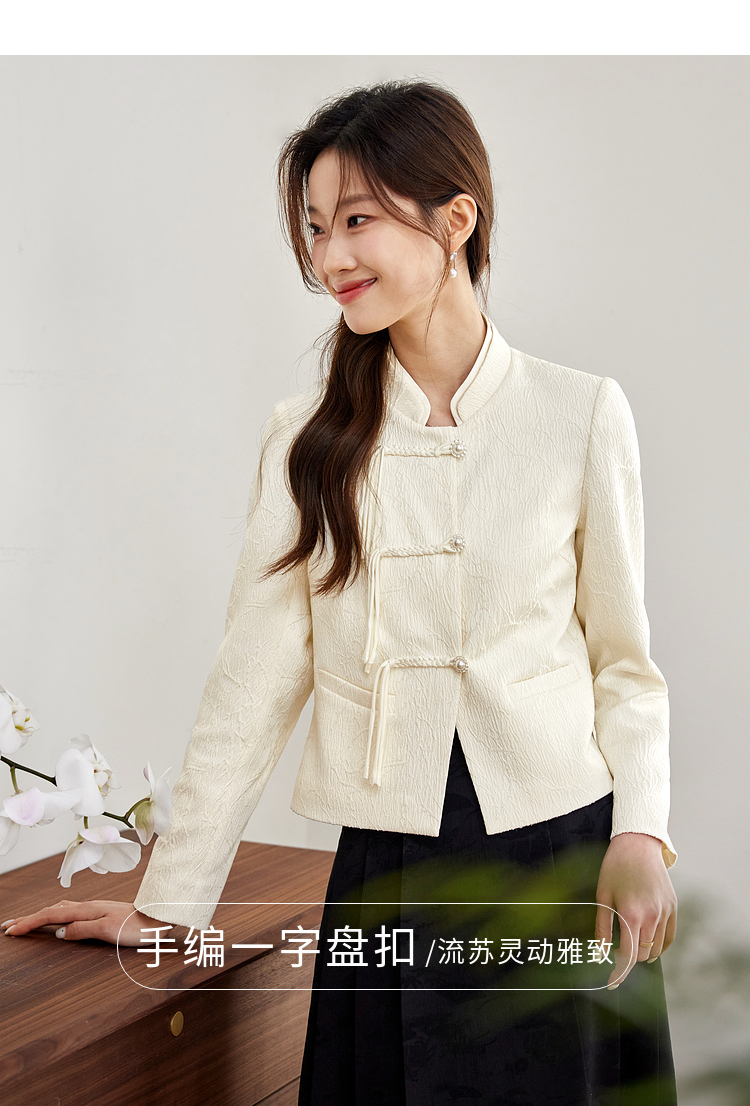 【129选3件,不退换】熙世界新中式国风白色外套短款小个子春秋流苏盘扣提花立领上衣