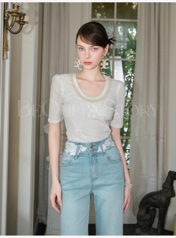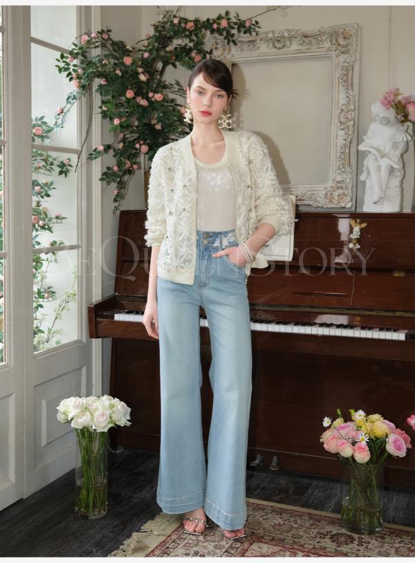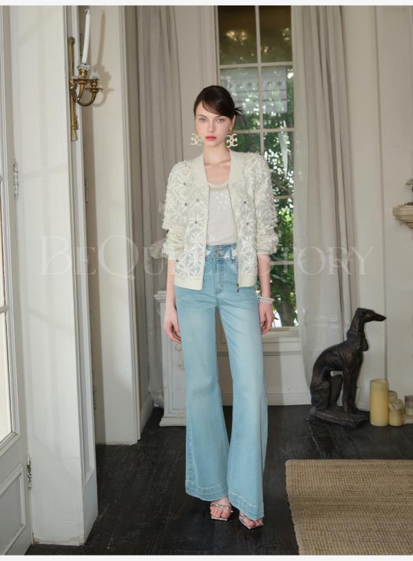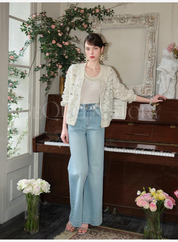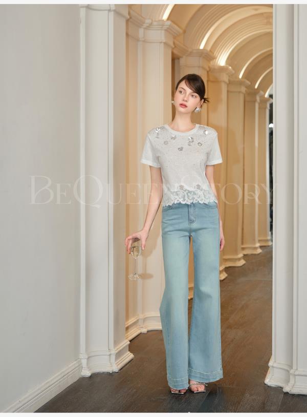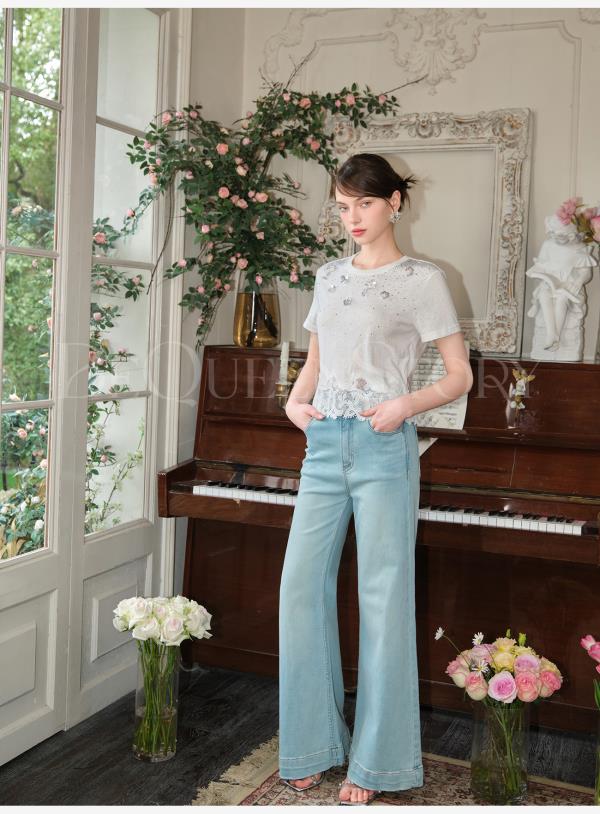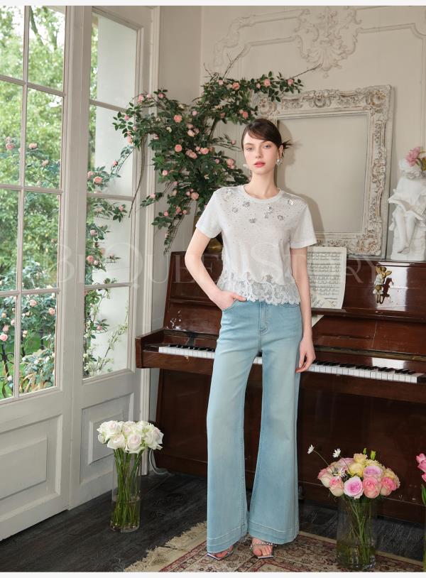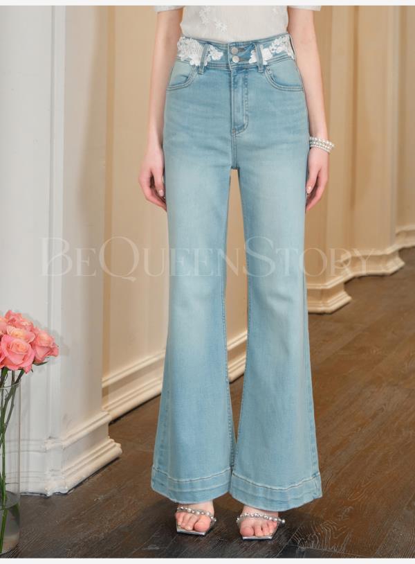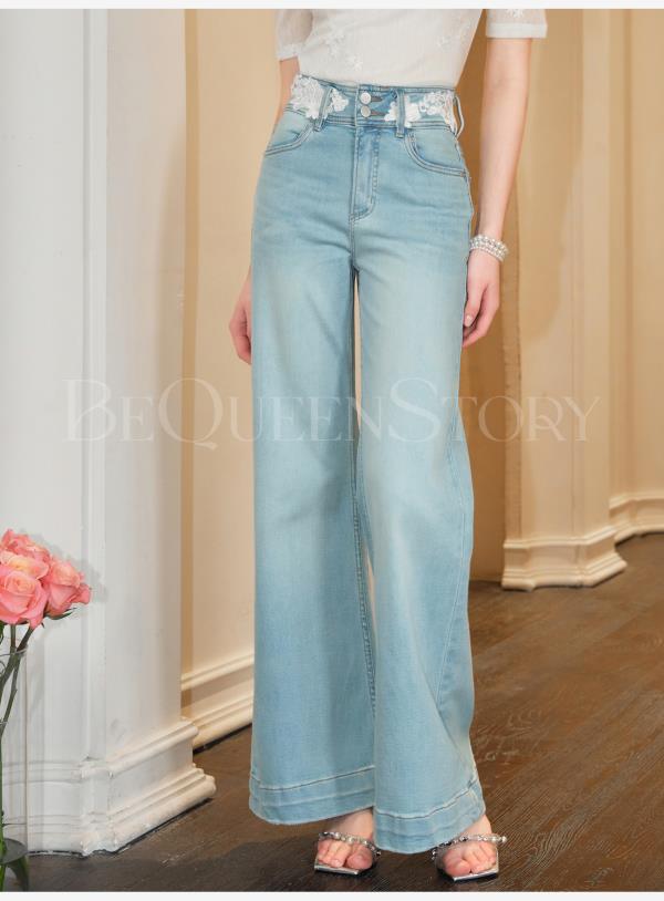 余潇潇【半岛芭蕾】2025早春新款时尚百搭蕾丝腰边直筒蓝色牛仔裤